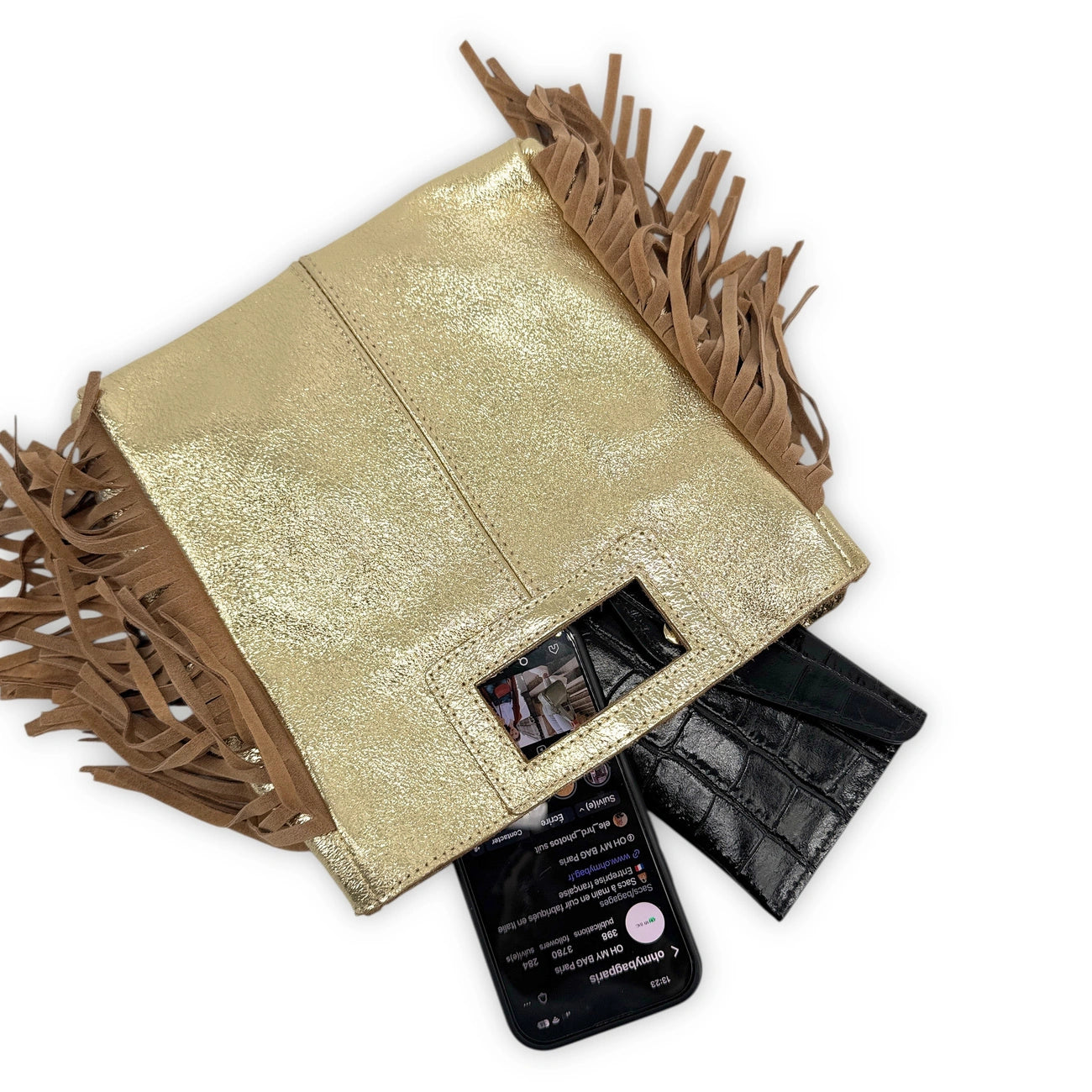 Bag main leather fringe irisé and suede ENOLA Pale gold