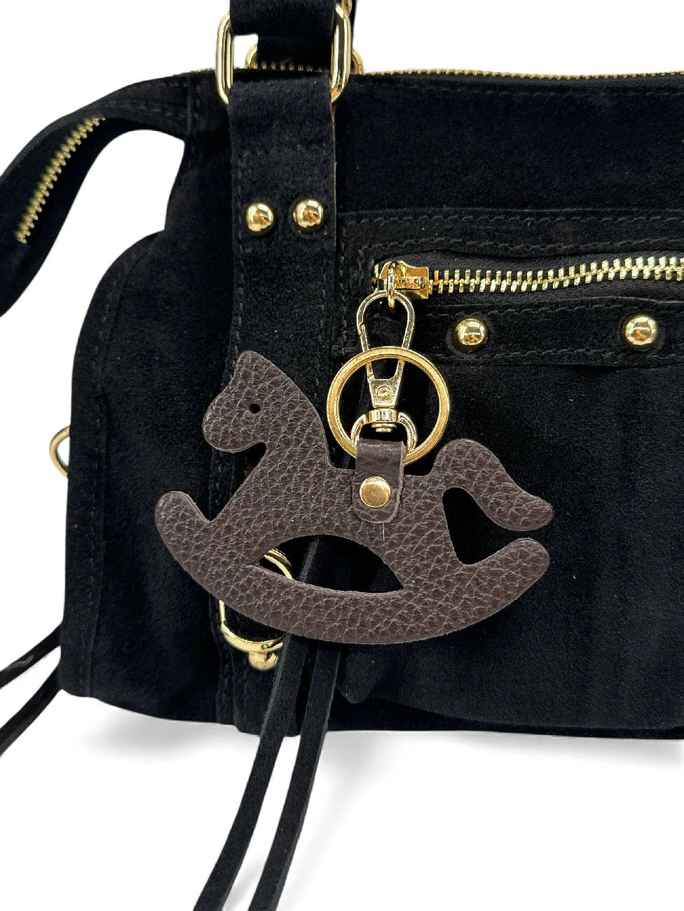 The keychain charm remains a very practical and fun idea both to upgrade our bag to main. On the one hand we have a ring where to put away its keys and other important parts, on the other hand we have a carabiner to hang it on the bag. To take advantage of its most beautiful effect, our large collection of trendy bag accessories is to be explored without moderation. In this real cave of the gri-gri category of ultra cute bags, focus on this trendy keychain in grained leather in the shape of pony decorated with golden fittings. In the hands of artisans experts in petite leather goods, this matiexceptional era gave birth to a fashion creation design.