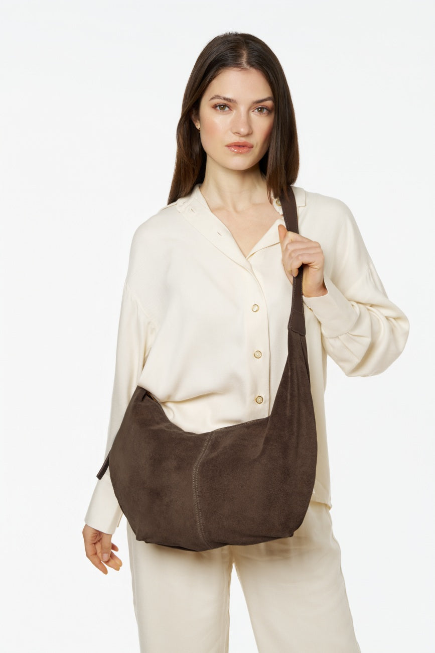 Una bolsa cuyos colores brillantes y brillantes de cuero de gamuza resaltan el estilo bohemio.