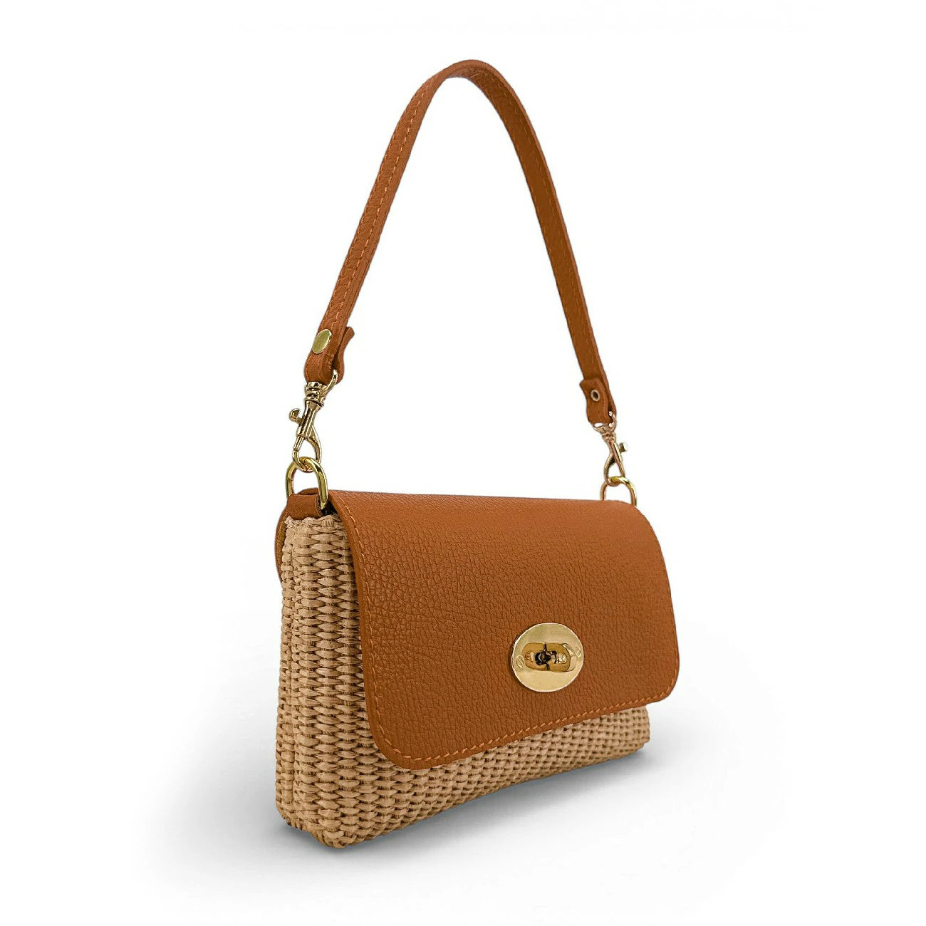 Mini sac porté épaule avec anse amovible et chainette dorée, en raphia naturel et cuir grainé d'une jolie teinte caramel, fabriqué en Italie.