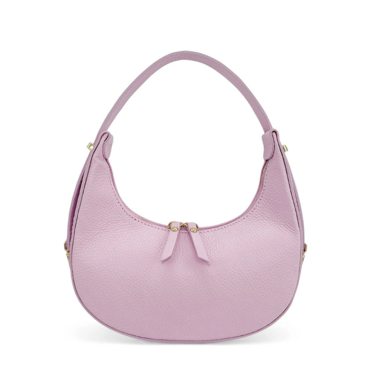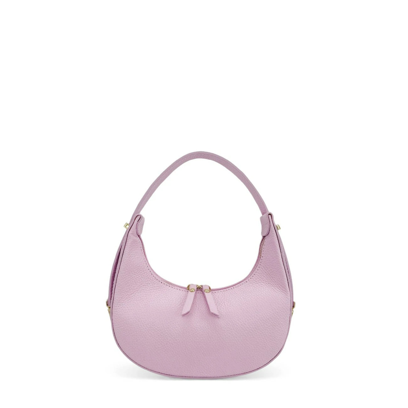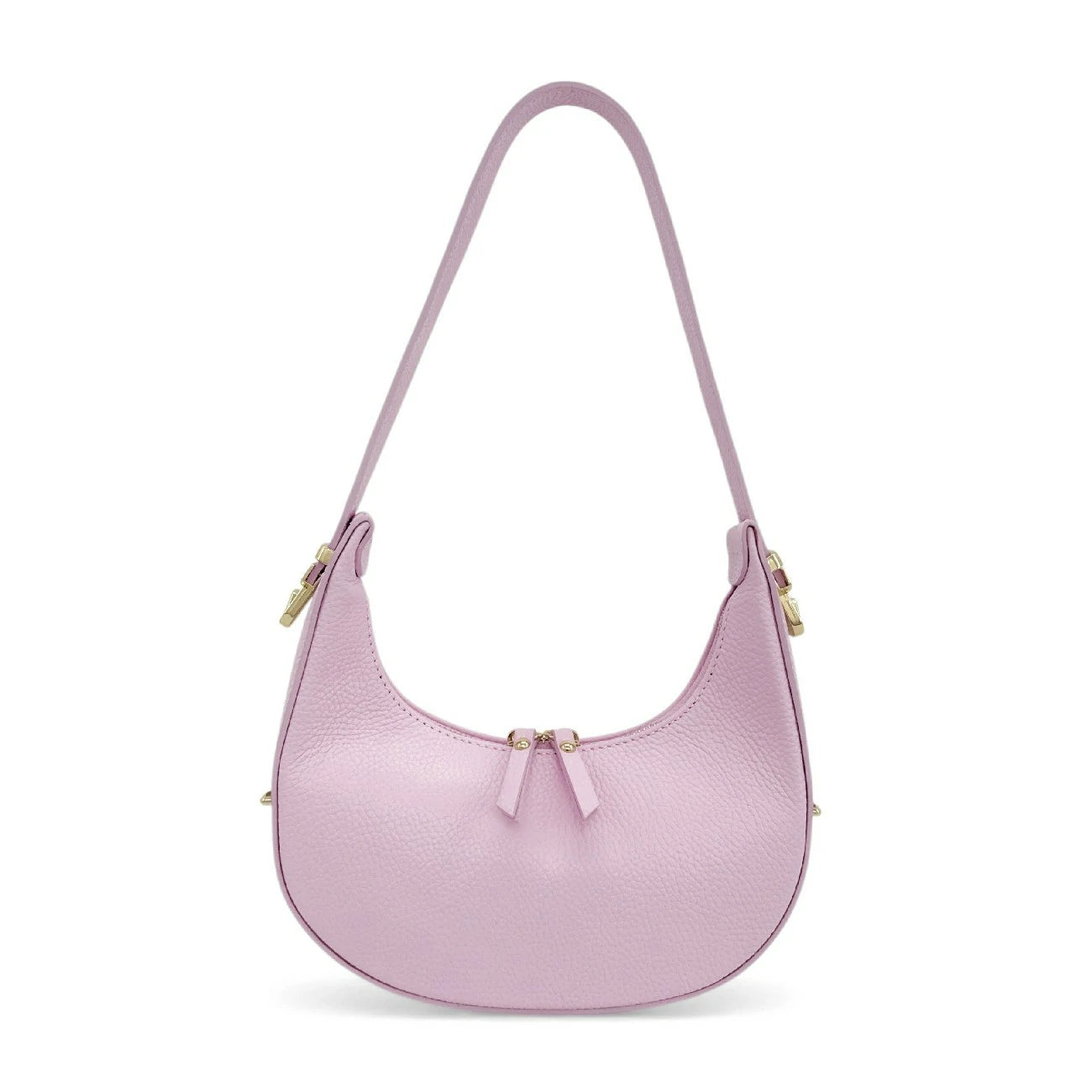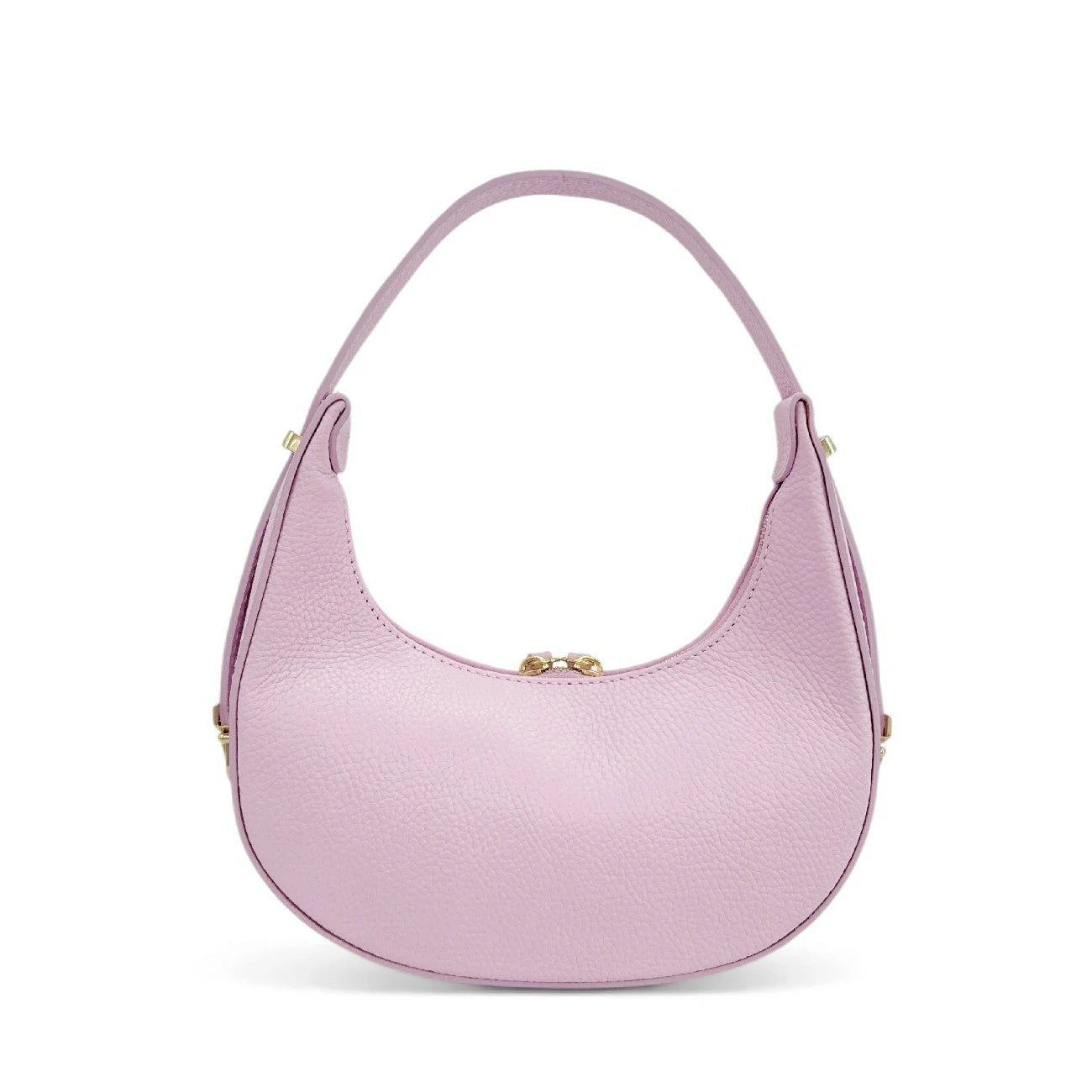 Sac croissant en cuir grainé rose clair, porté épaule, fabriqué en Italie.