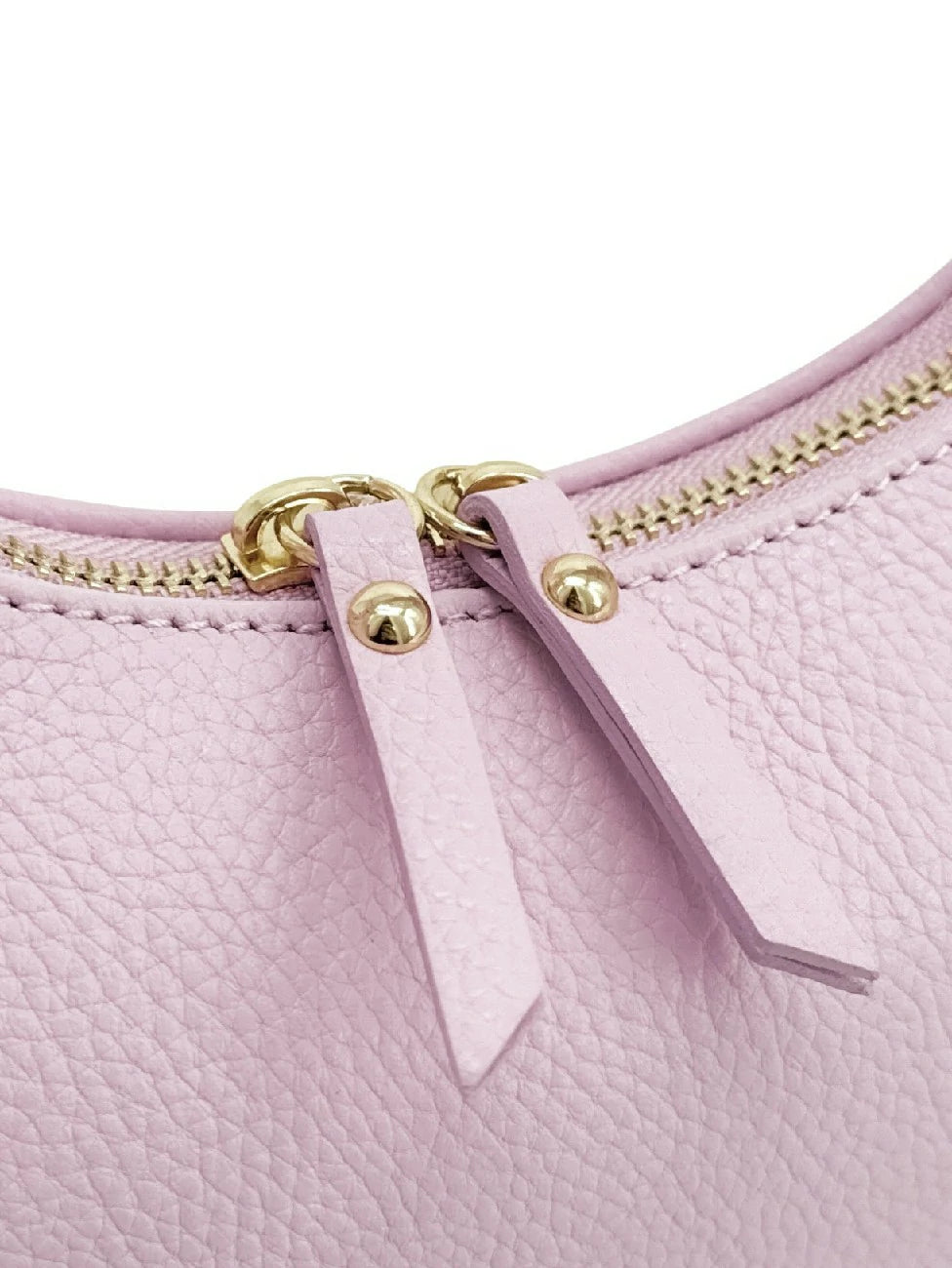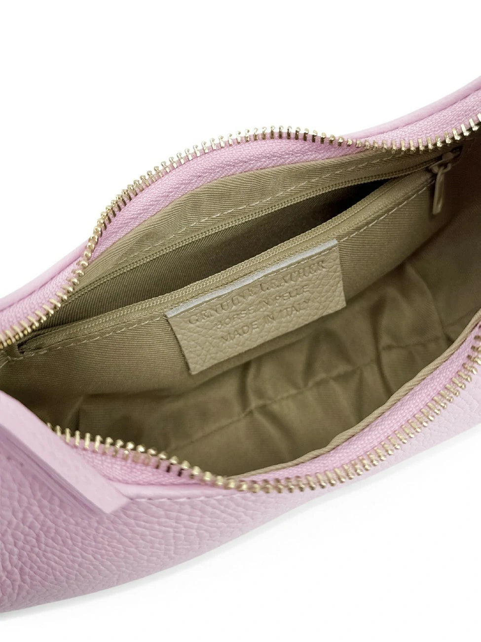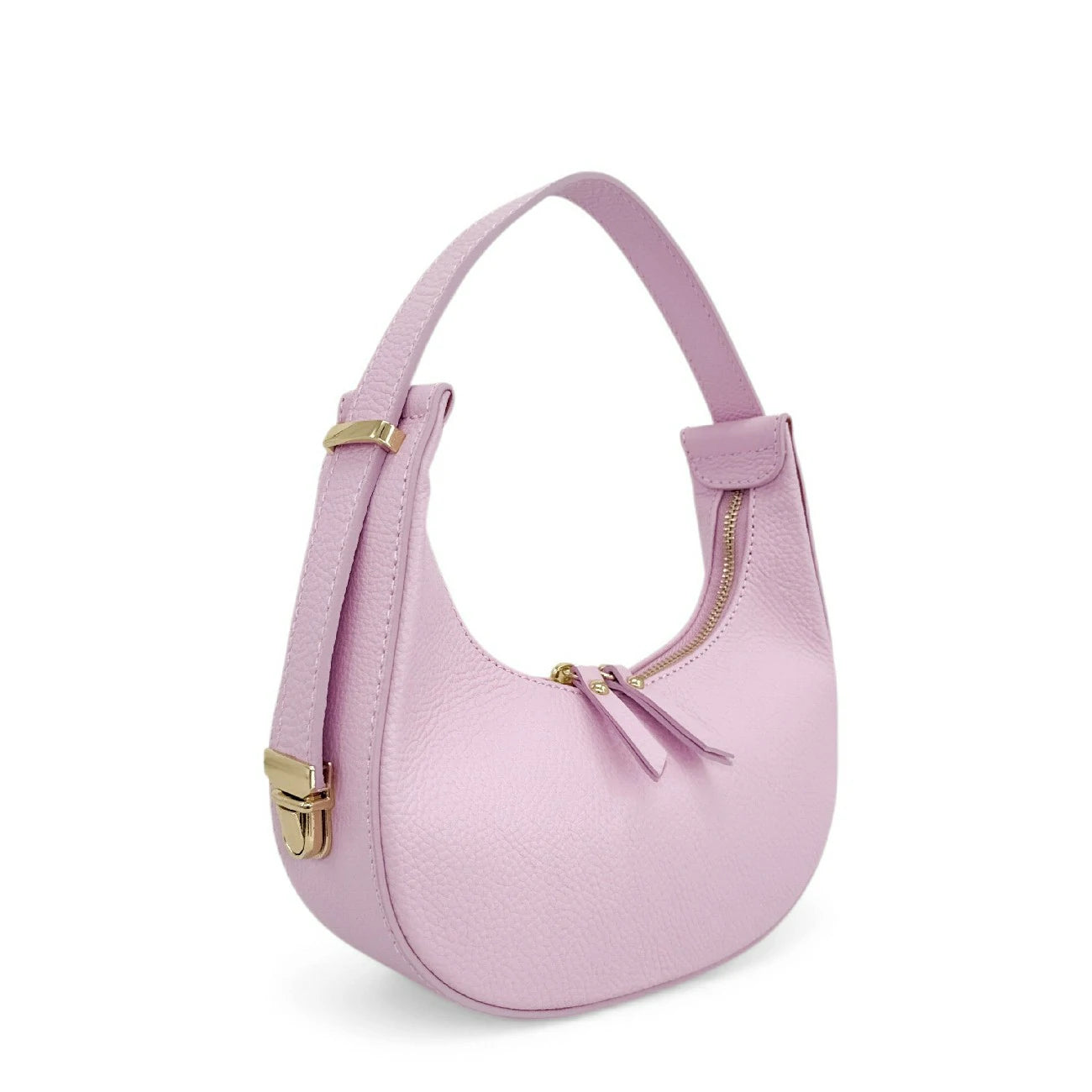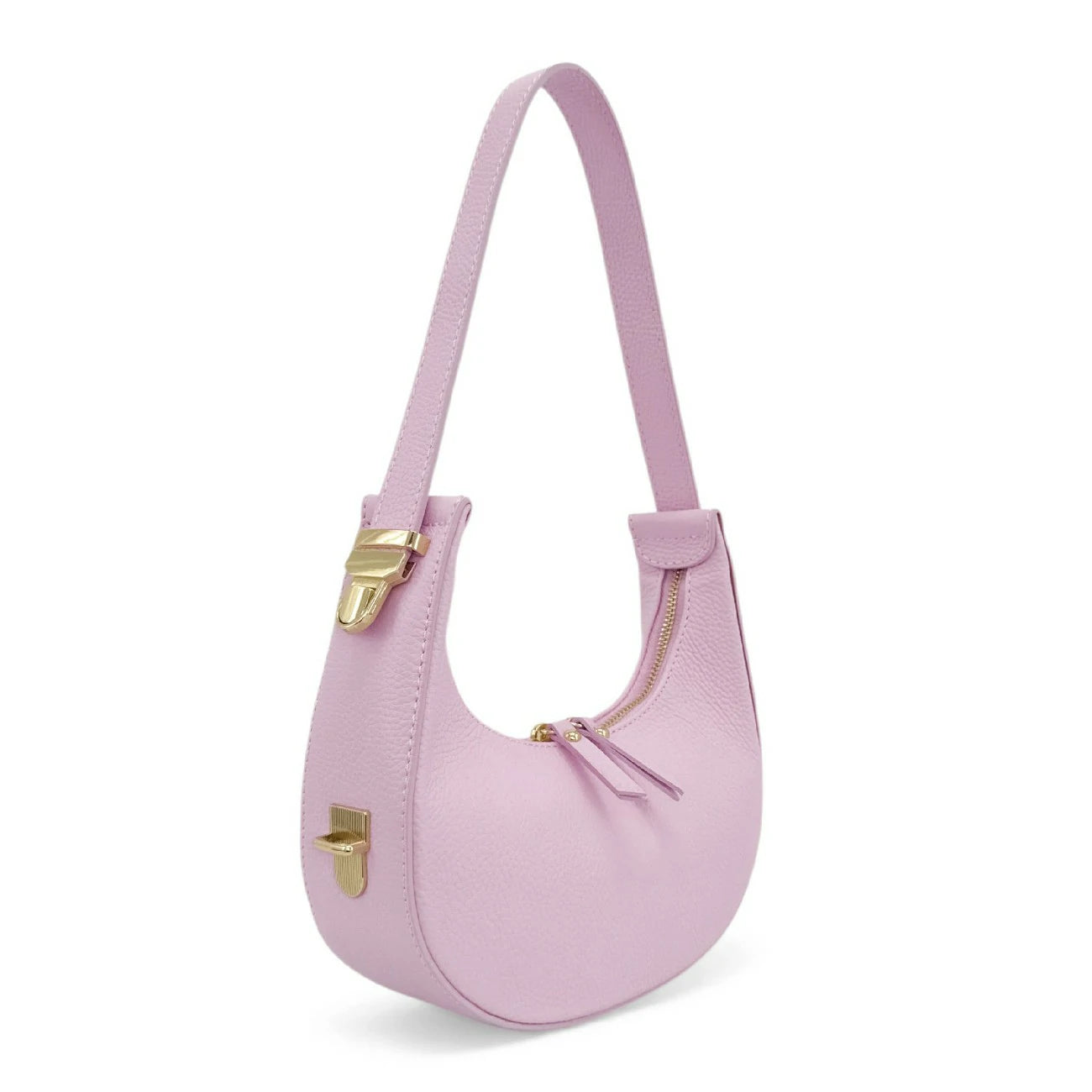 Sac croissant en cuir grainé rose clair, porté épaule, fabriqué en Italie.