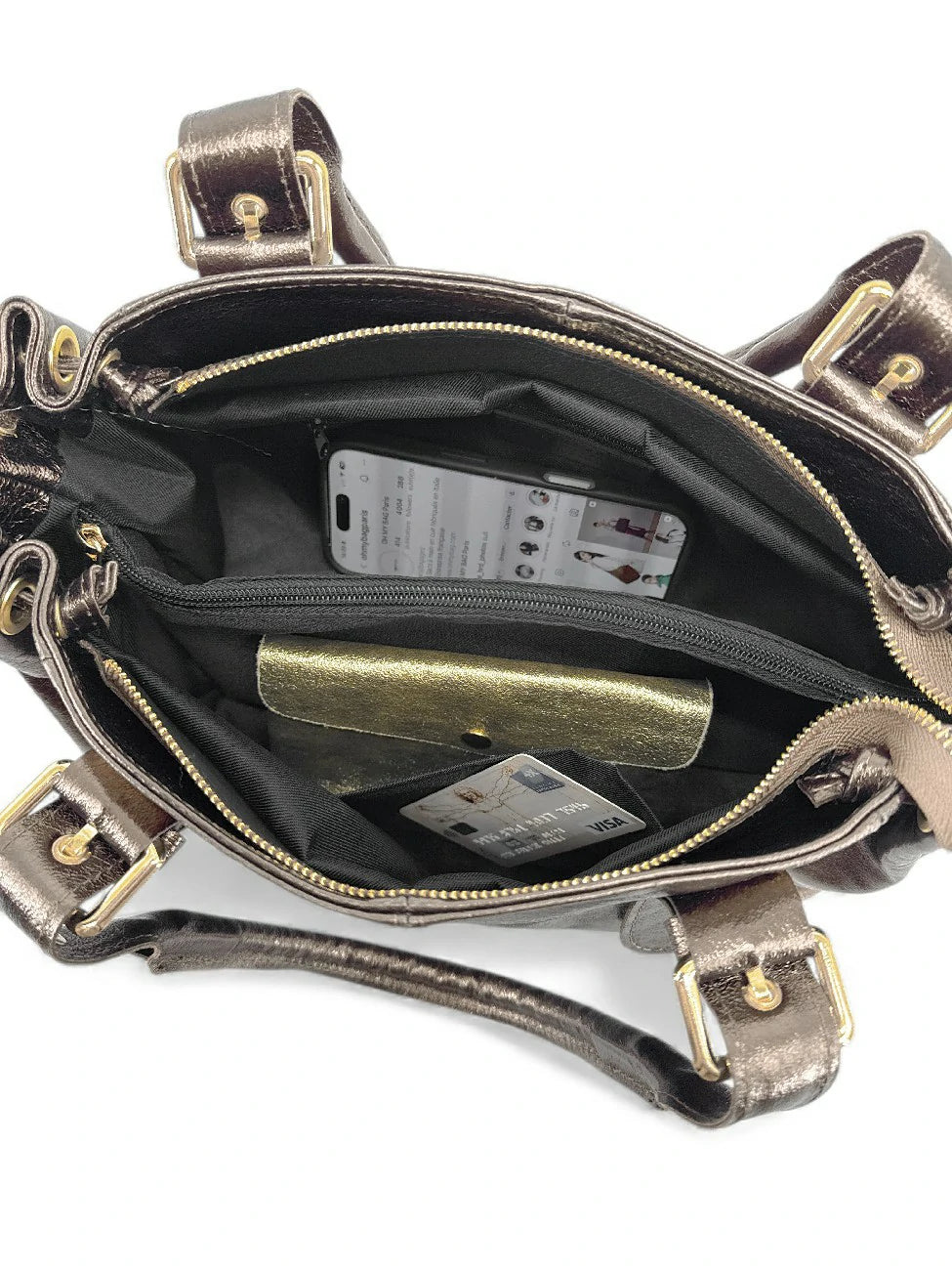 • Pelle metallizzata : finitura iris data alle pelli per ottenere tonalità lucide. Molto sensibile ai graffi.