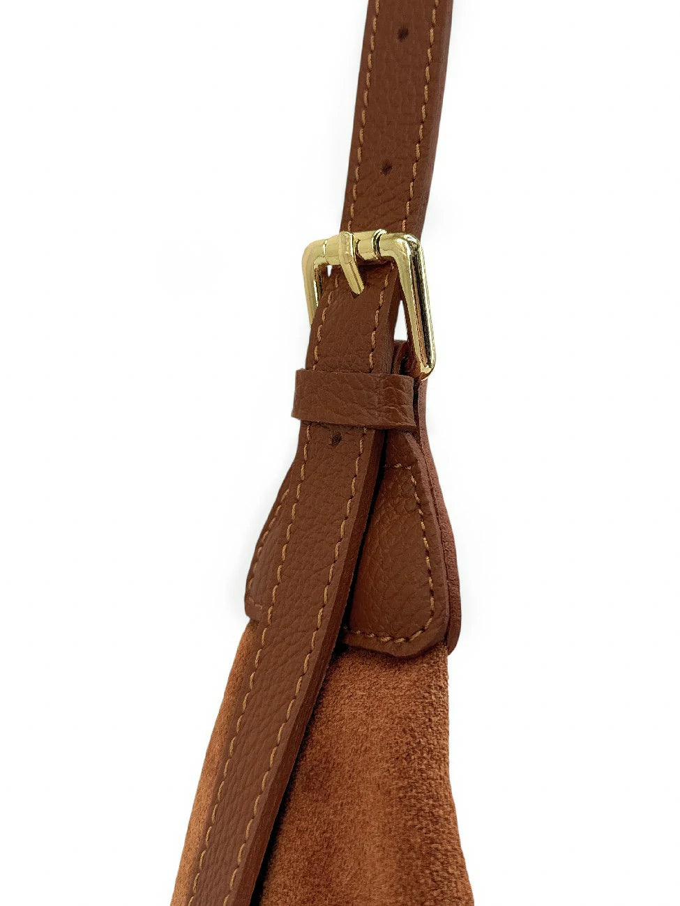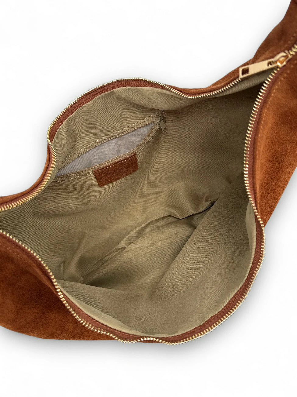 Sac besace demi-lune en cuir nubuck cannelle, porté épaule et bandoulière, fabriqué en Italie.