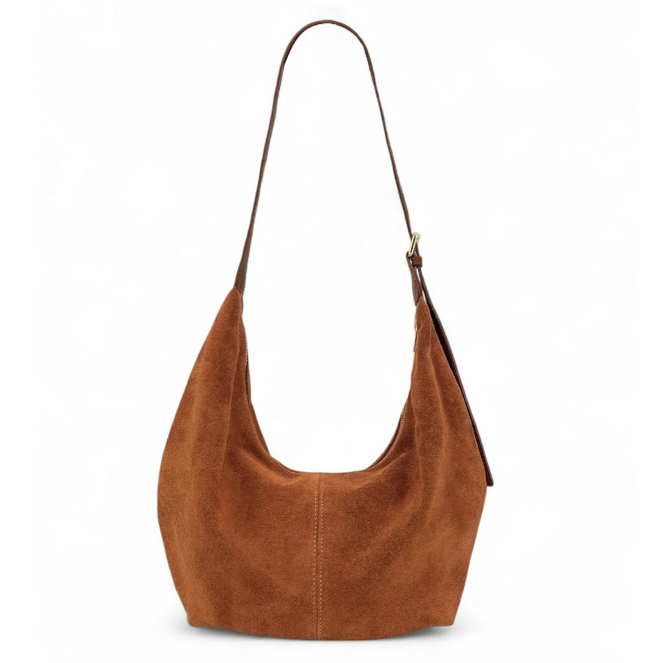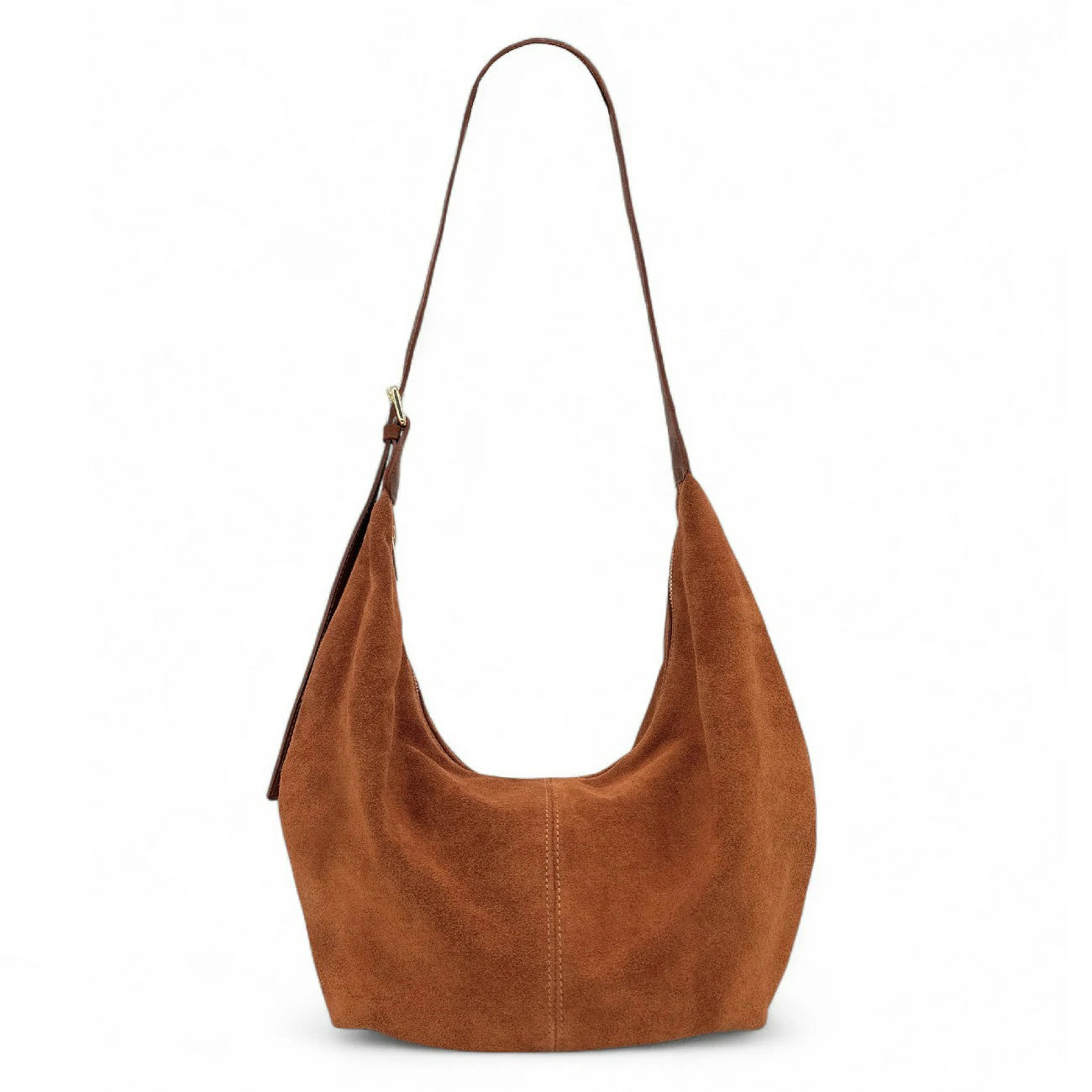 Besace demi-lune en cuir nubuck cannelle, un grand sac hobo au design épuré et relax, doté d’une bandoulière en cuir grainé ajustable. Un essentiel chic & effortless pour la vie active.