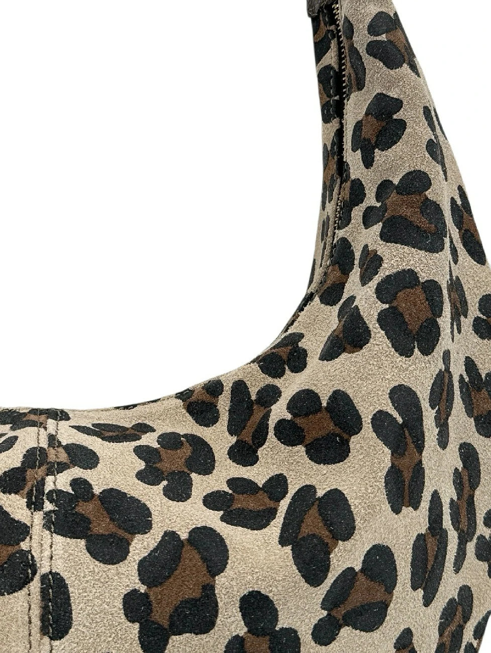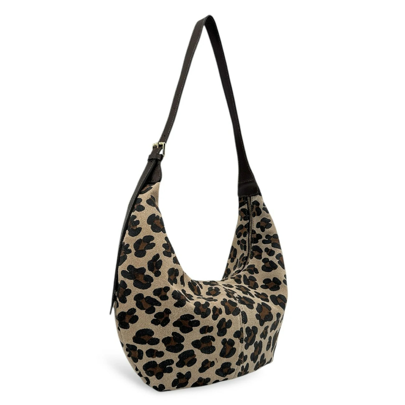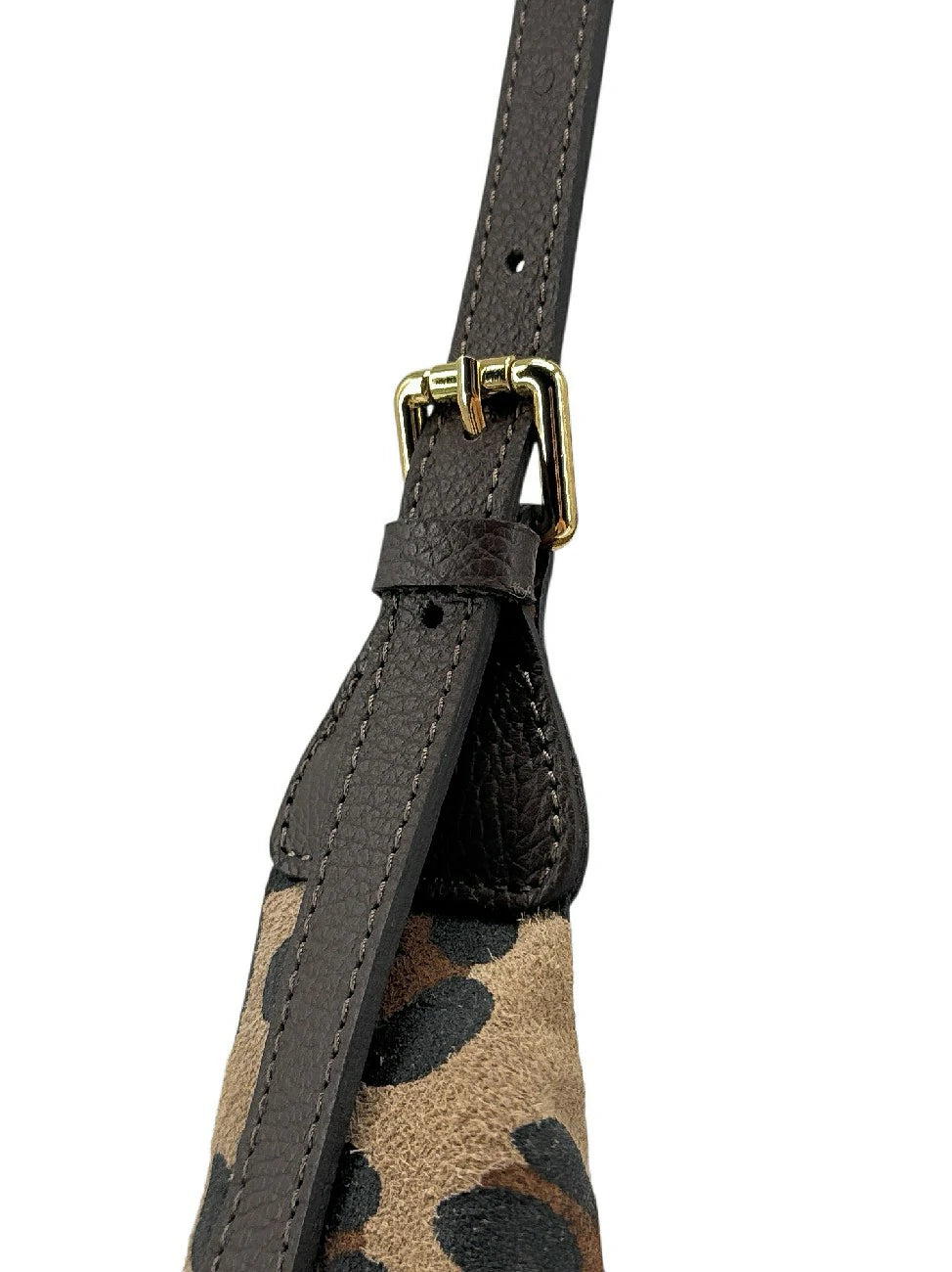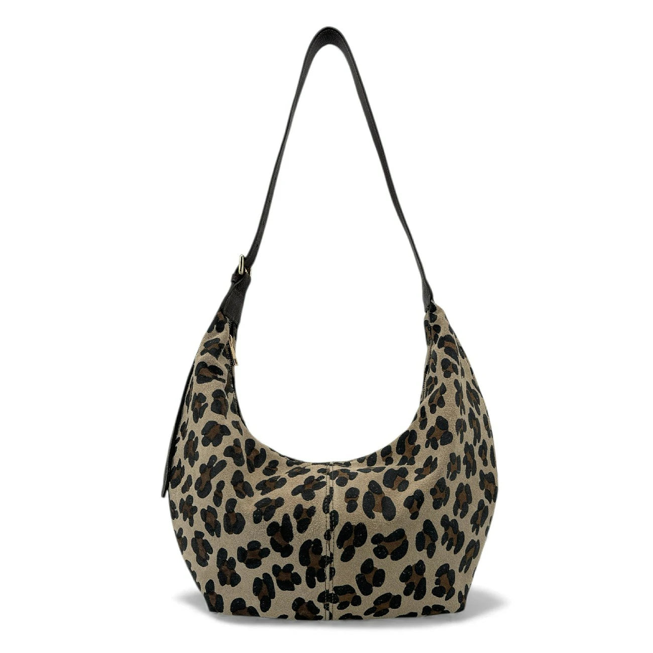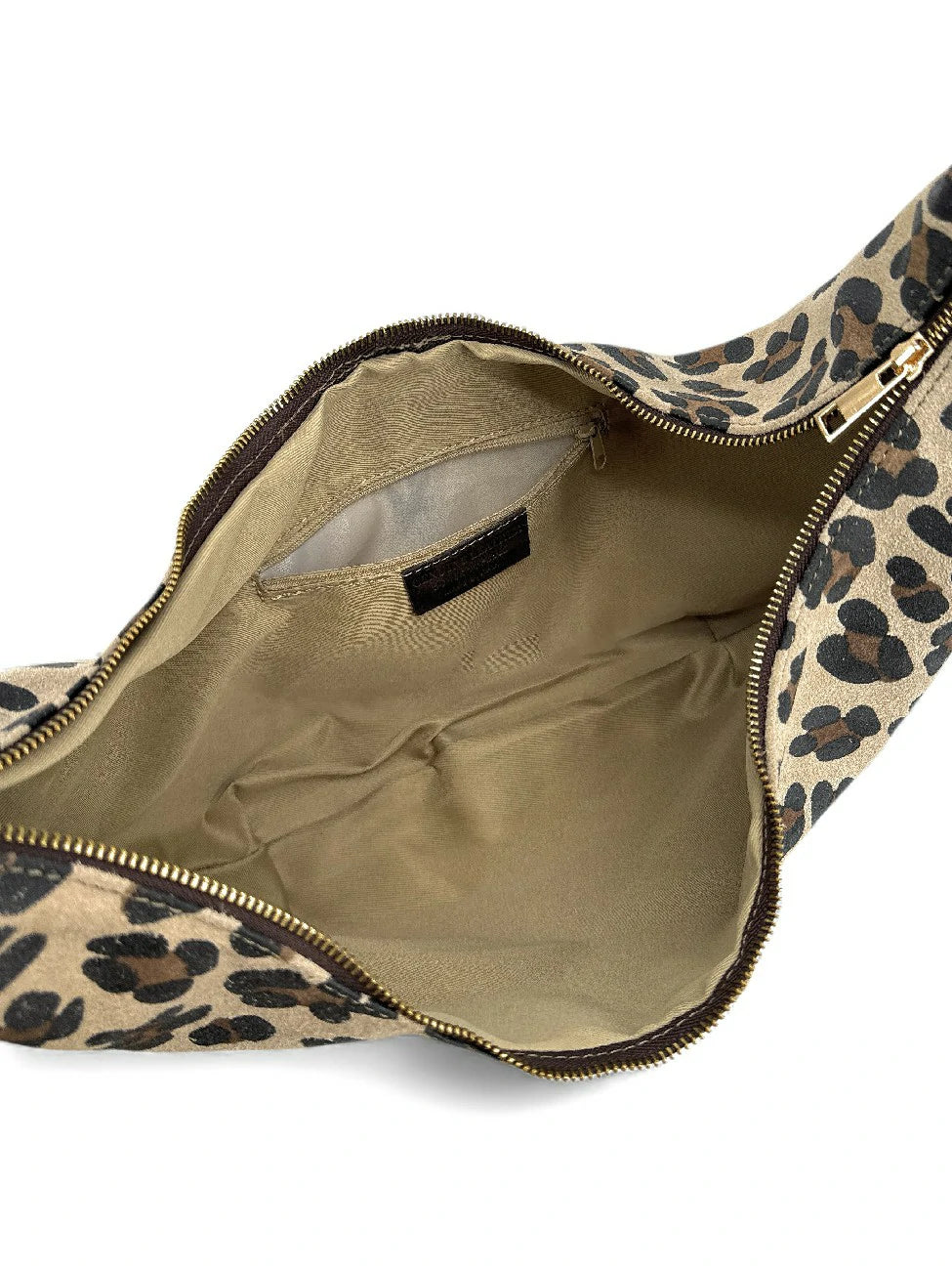 Sac besace demi-lune en cuir nubuck léopard, porté épaule et bandoulière, fabriqué en Italie.