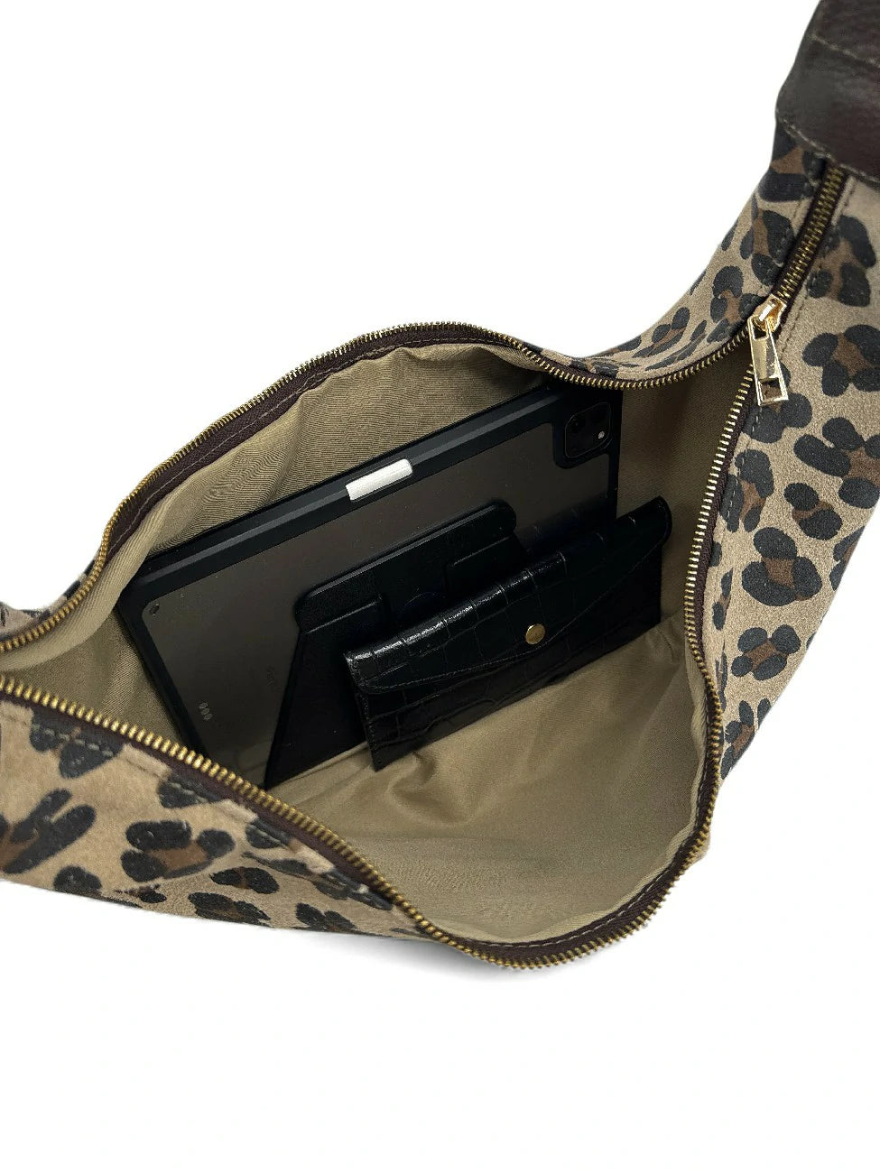 Grand sac besace hobo en cuir nubuck, version léopard. Une pièce bold, ultra fashion, au design minimaliste et à la silhouette demi-lune loose pour un look affirmé et effortless.