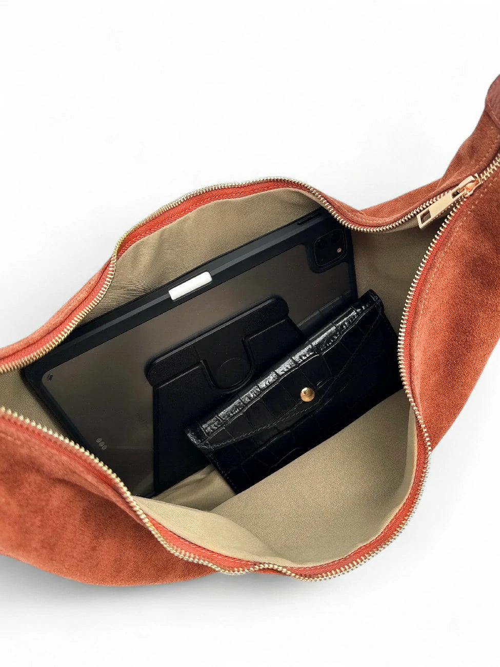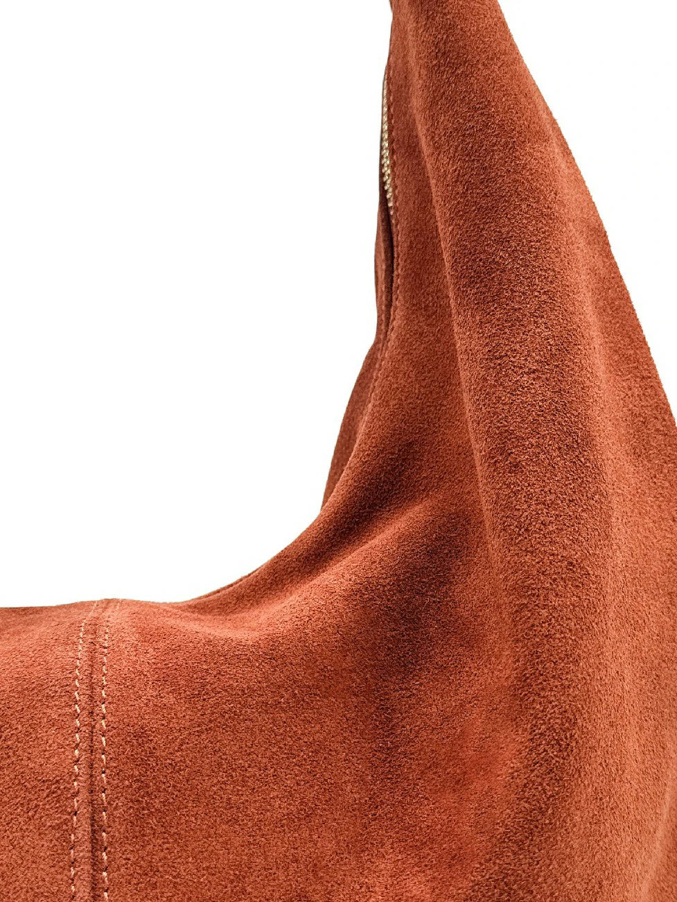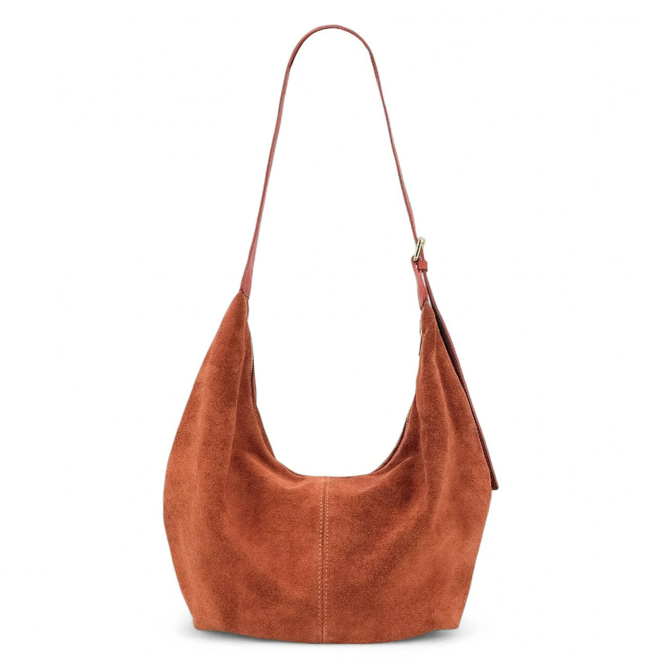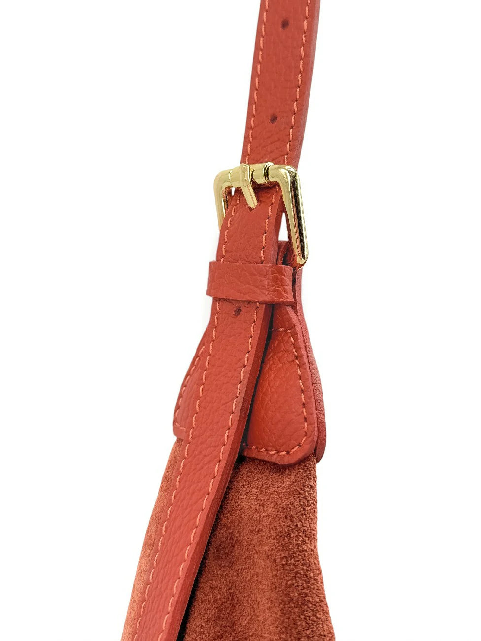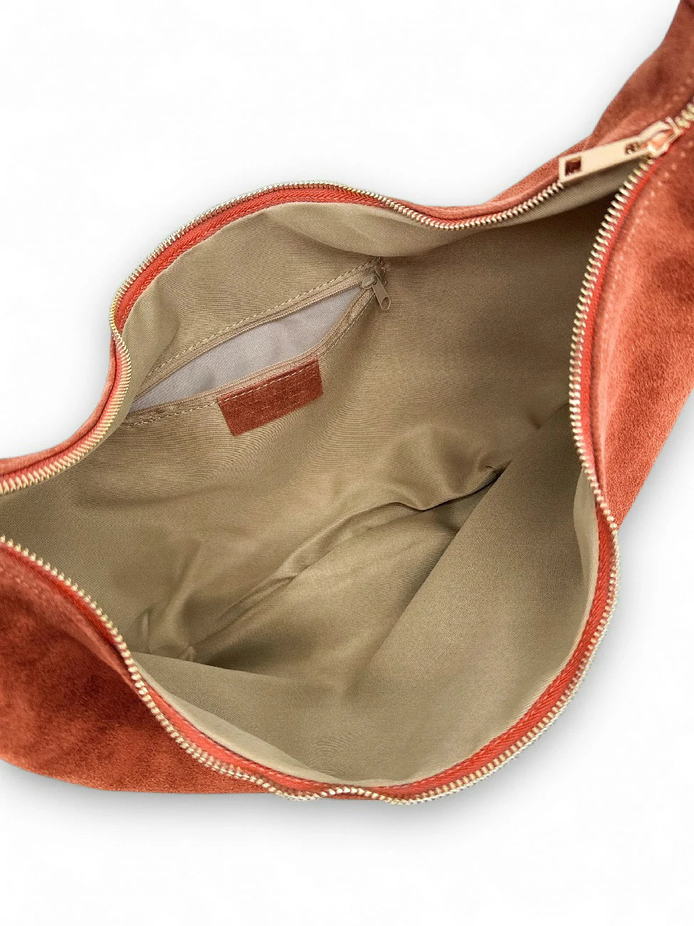 Sac besace demi-lune en cuir nubuck rouge brique, porté épaule et bandoulière, fabriqué en Italie.