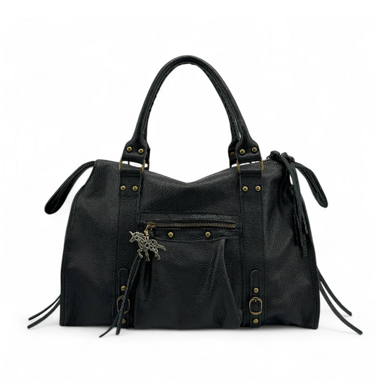 Charm de sac à main licorne stylisée en métal doré.