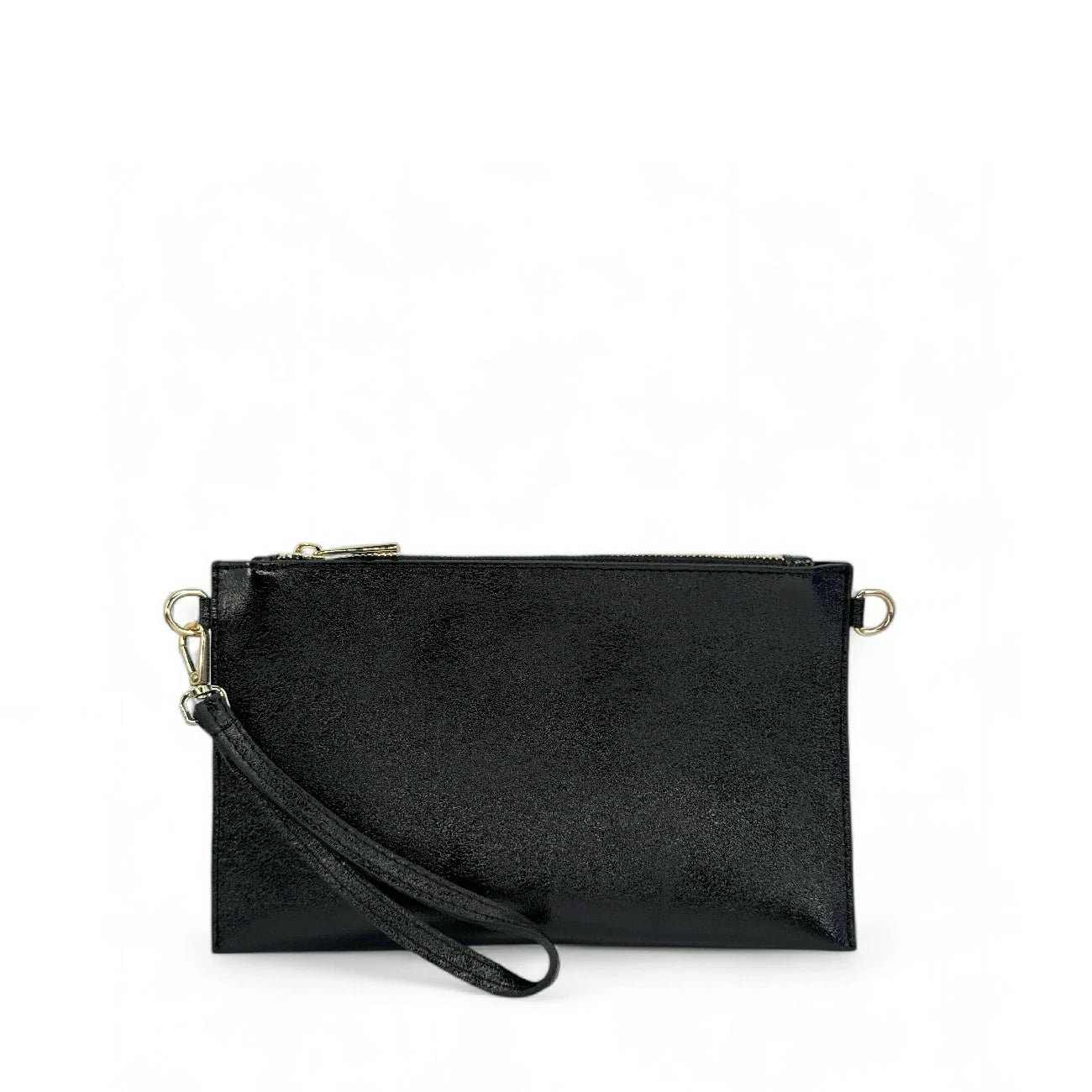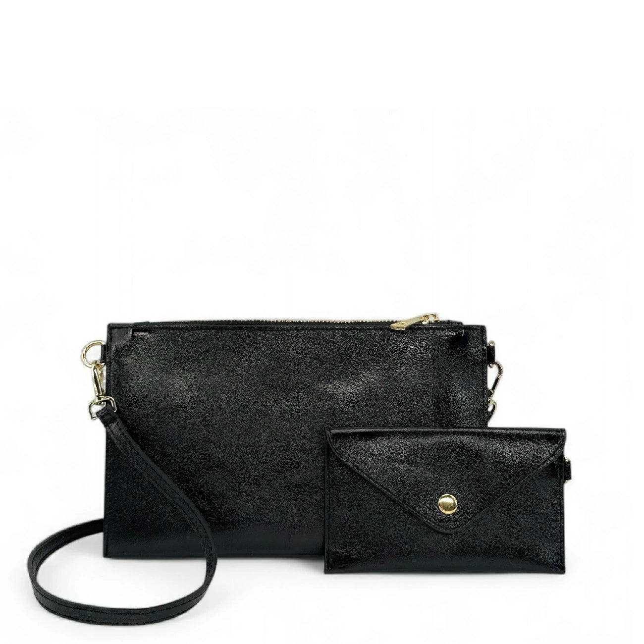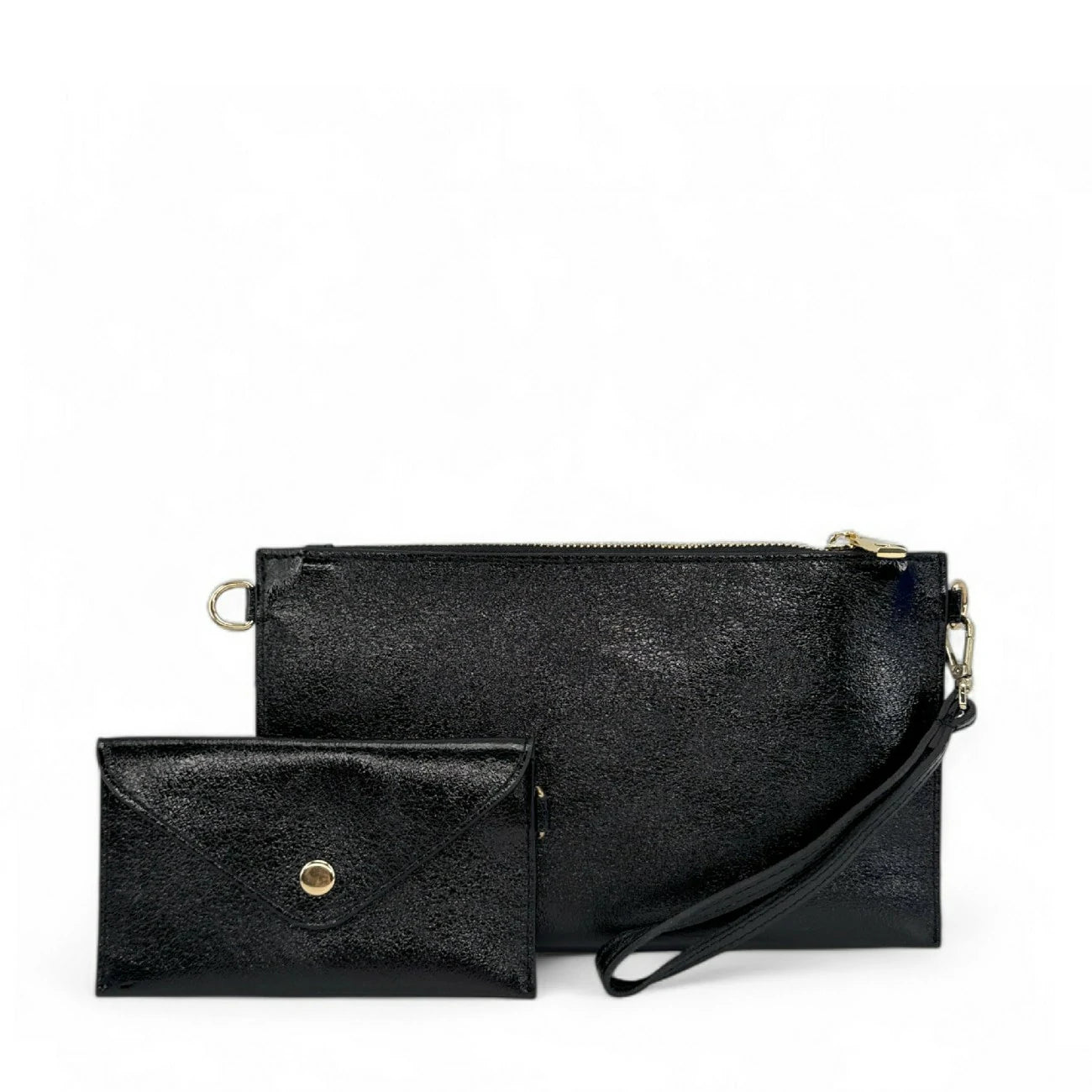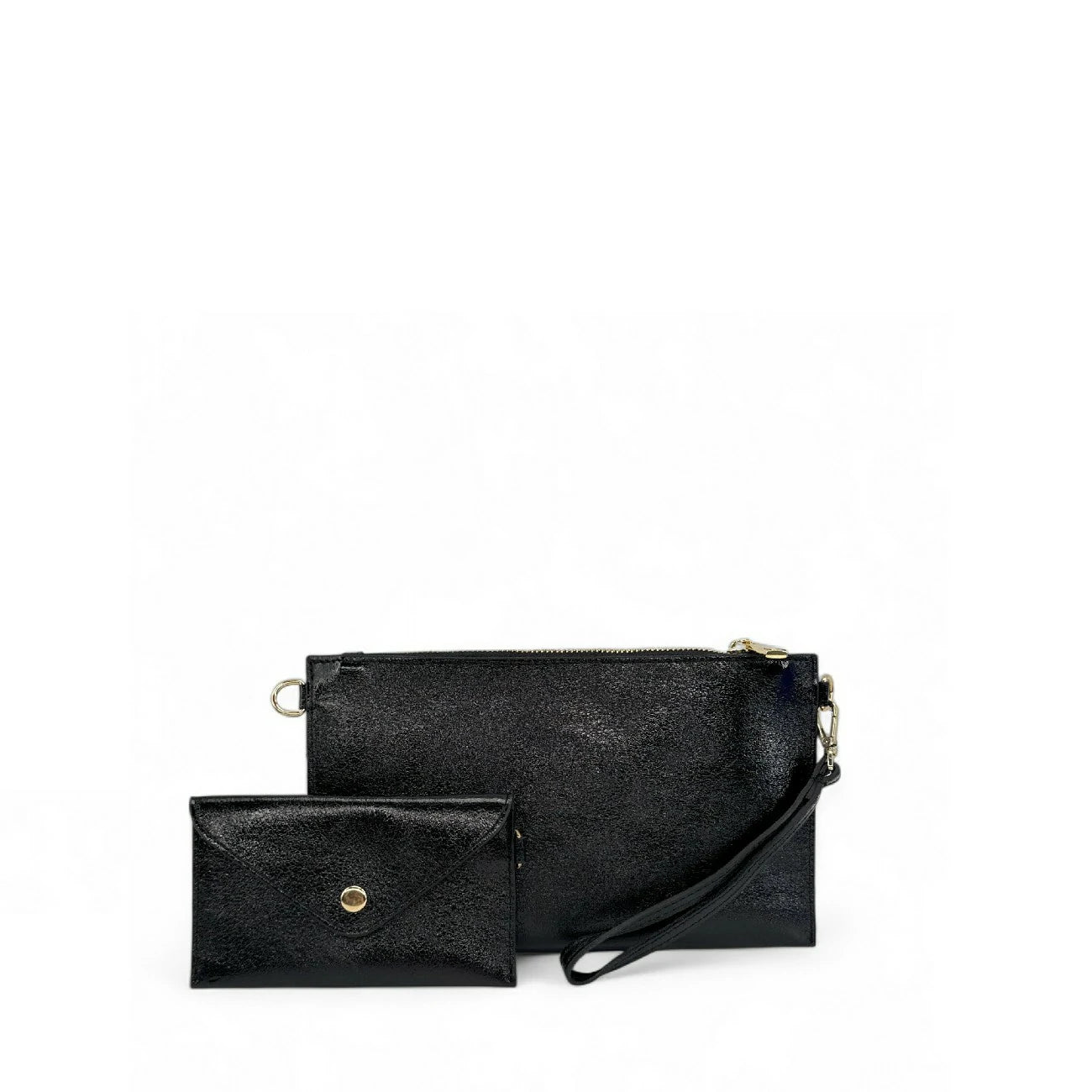 Ensemble composé d'un sac pochette et d'un porte-cartes en cuir métallisé noir avec bandoulière et dragonne, porté main ou bandoulière, fabriqué en Italie.