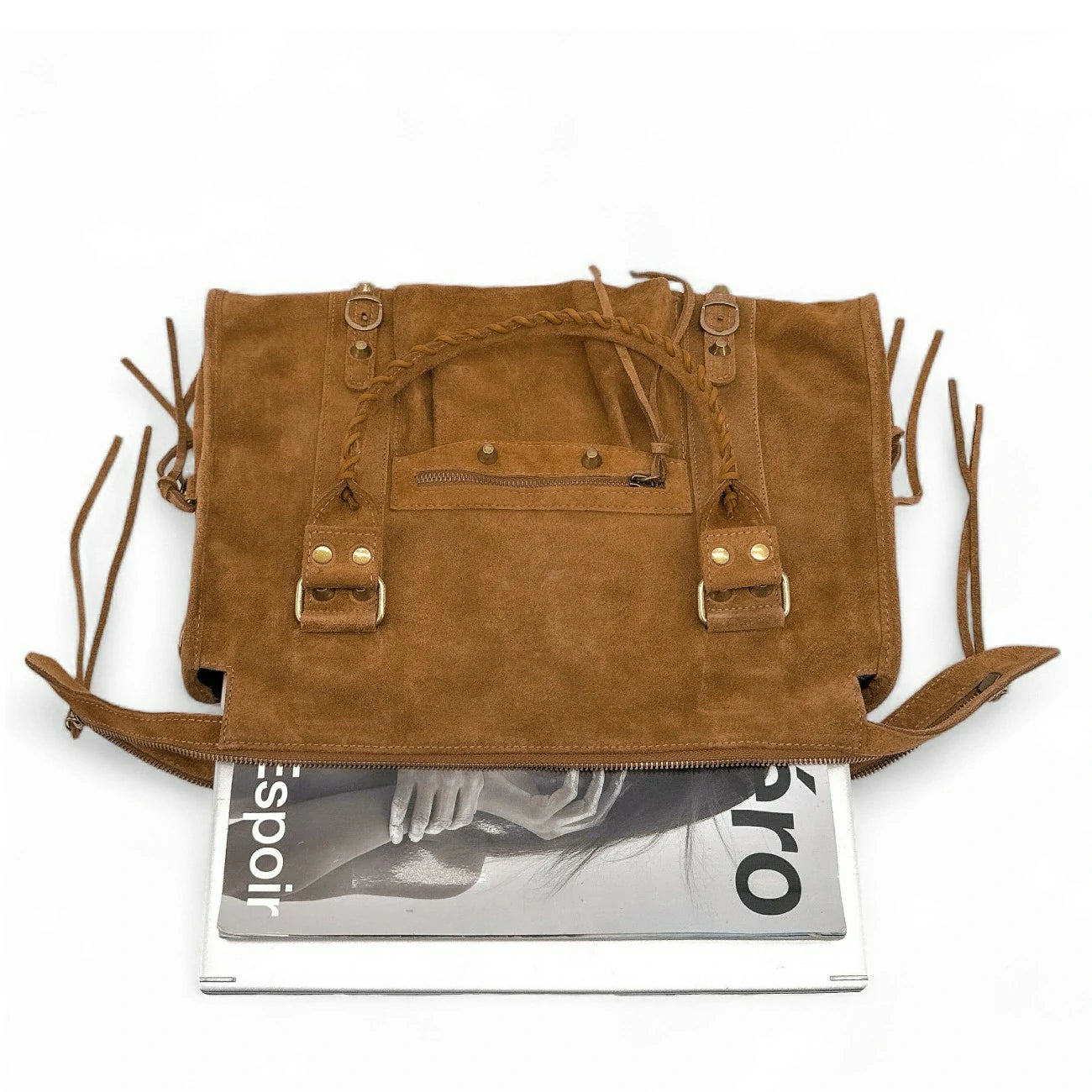 Sac de cours et de bureau en cuir nubuck camel grand format avec lacets et boucles décoratifs, porté main, épaule ou bandoulière, fabriqué en Italie.