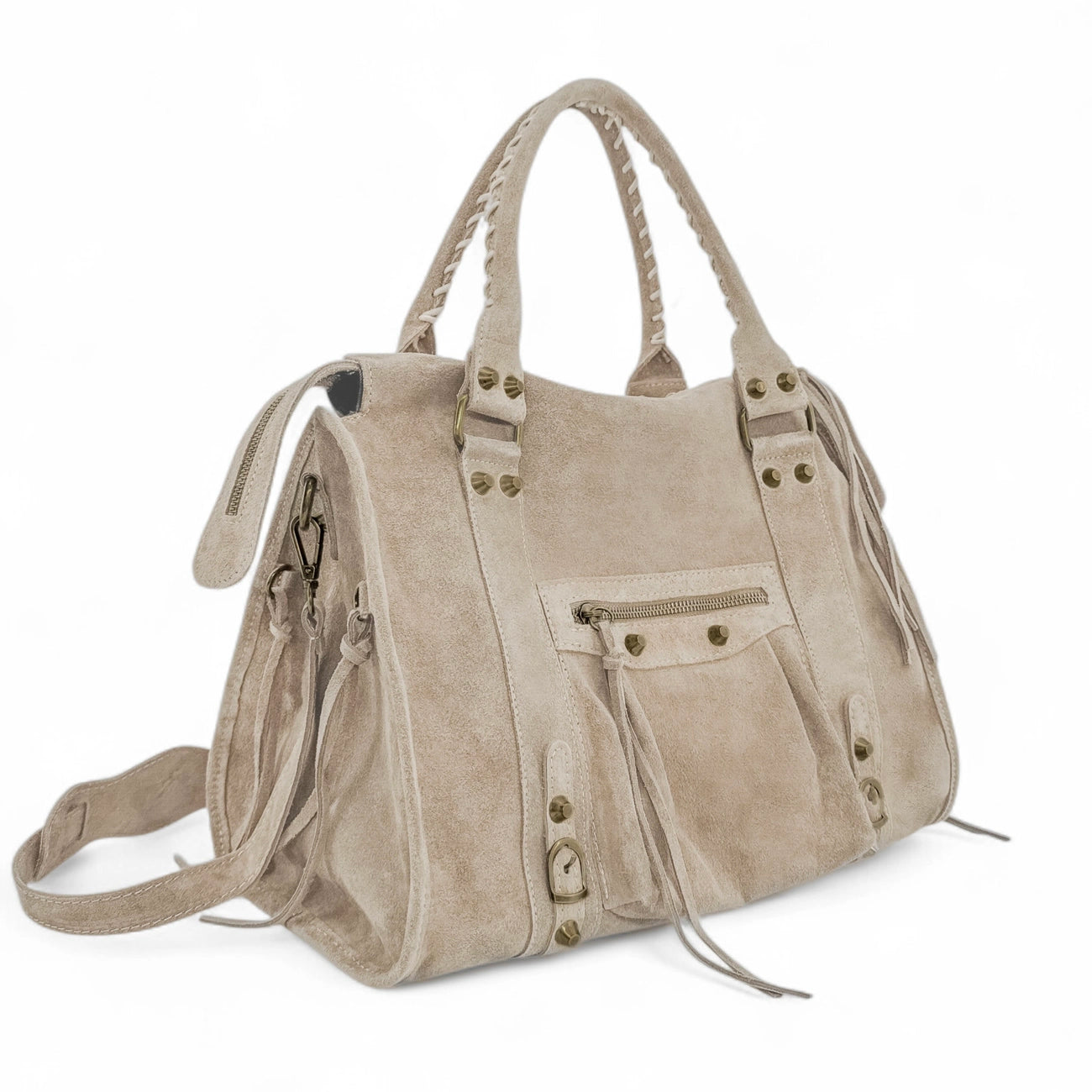 Sac à main en cuir nubuck taupe clair de grand capacité avec lacets et boucles décoratifs, porté main, épaule ou bandoulière, fabriqué en Italie.