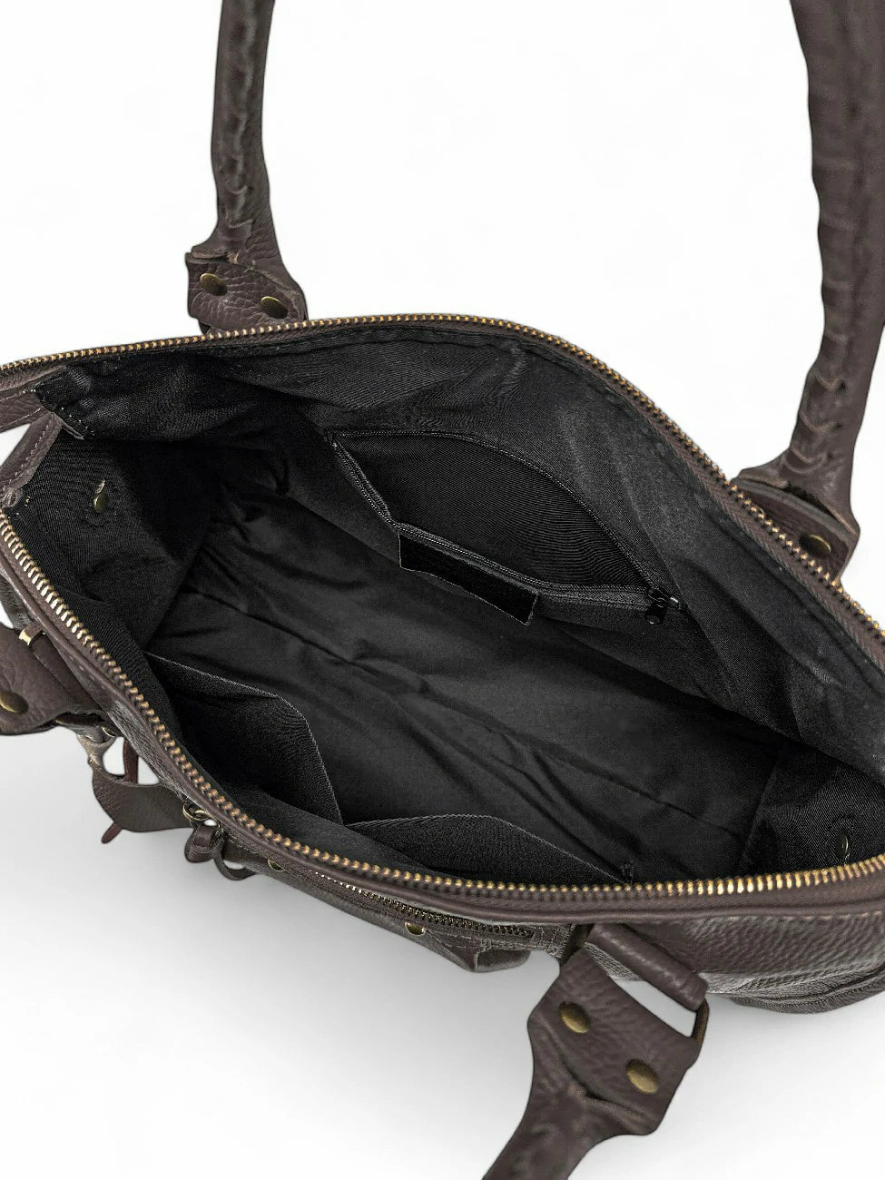 Sac à main de type bowling chocolat porté épaule en cuir véritable grainé, fabriqué en Italie.