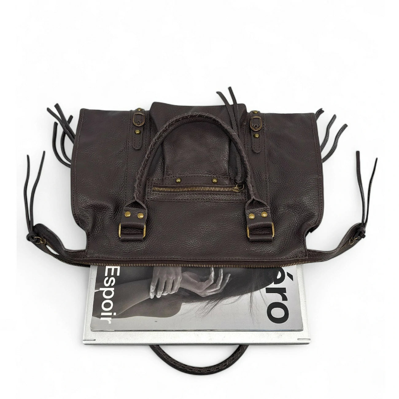 Notre best seller décline ici en chocolat sa version la plus polyvalente pour les cours ou le bureau ! Grâce à son solide cuir texturé bénéficiant d'une finition protectrice, il ne craint pas de sortir sous la pluie, et transporter cahiers et ordinateur ne lui pose pas de souci. Il ne sacrifie rien au style qui fait de lui un best-seller : forme trapèze, petits clous rond laitonnés, lacets et anses filetés, et offre en plus un rapport qualité prix absolument imbattable ! Efficace, tendance, et tout nouveau : de petites quantités seulement seront disponible pour Noel, ne tardez pas !