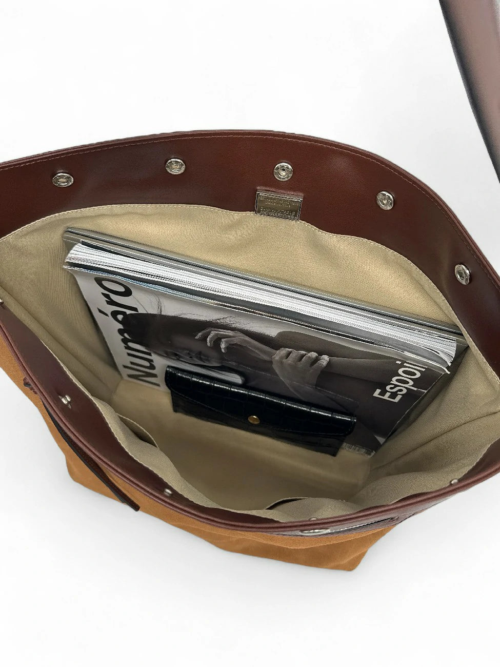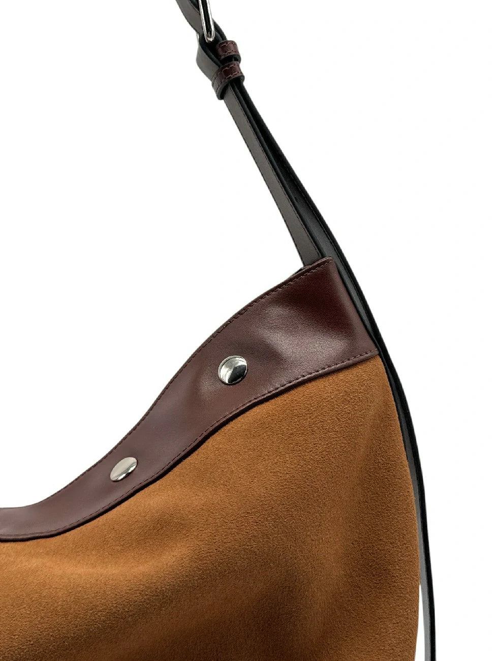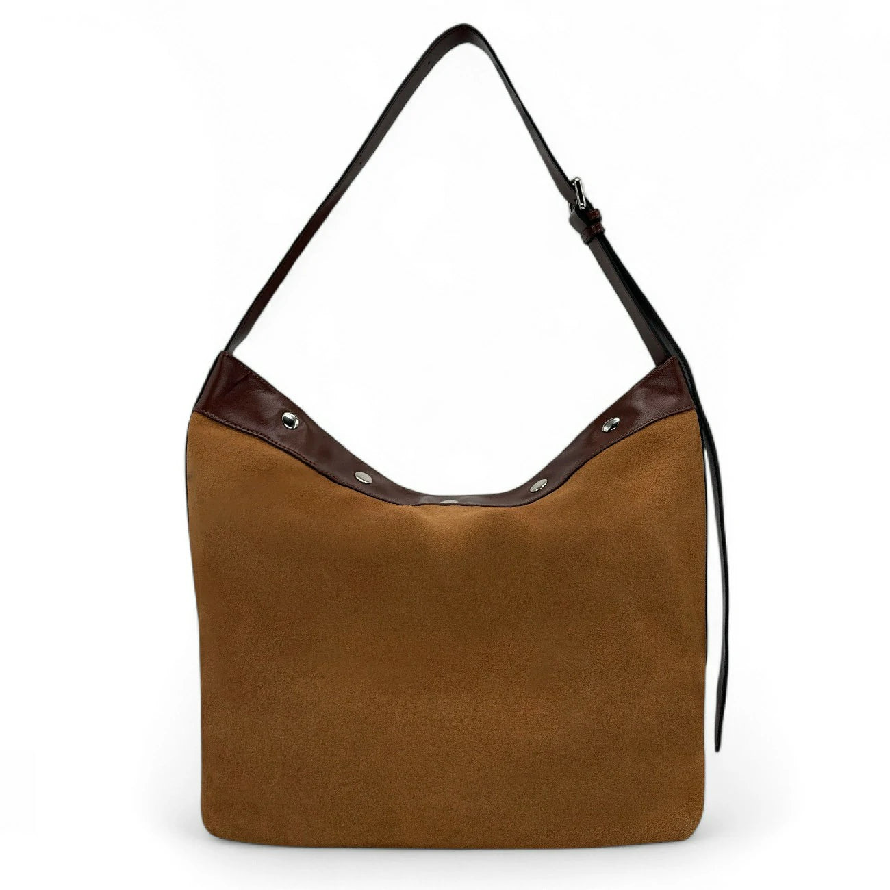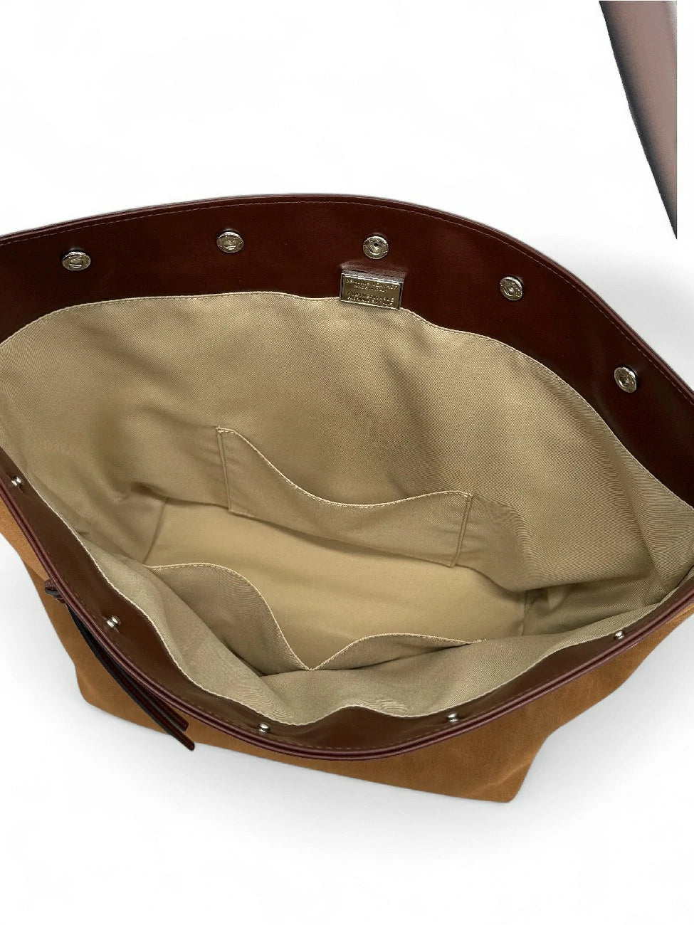 Sac cabas mono-anse en cuir nubuck et cuir lisse camel foncé, détails cloutés, porté épaule, fabriqué en Italie.