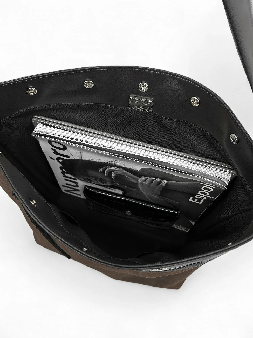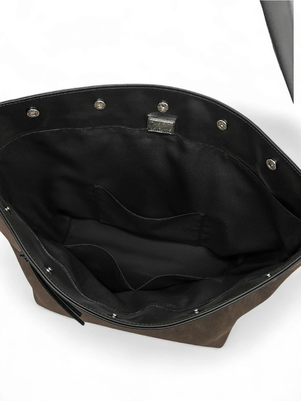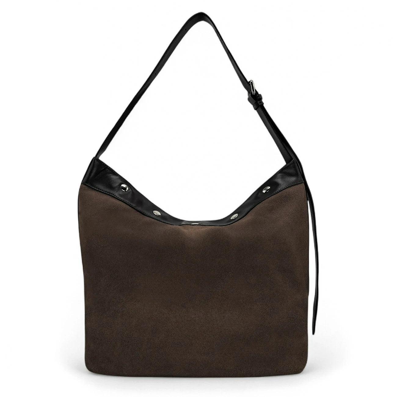 Sac cabas mono-anse en cuir nubuck et cuir lisse chocolat, détails cloutés, porté épaule, fabriqué en Italie.