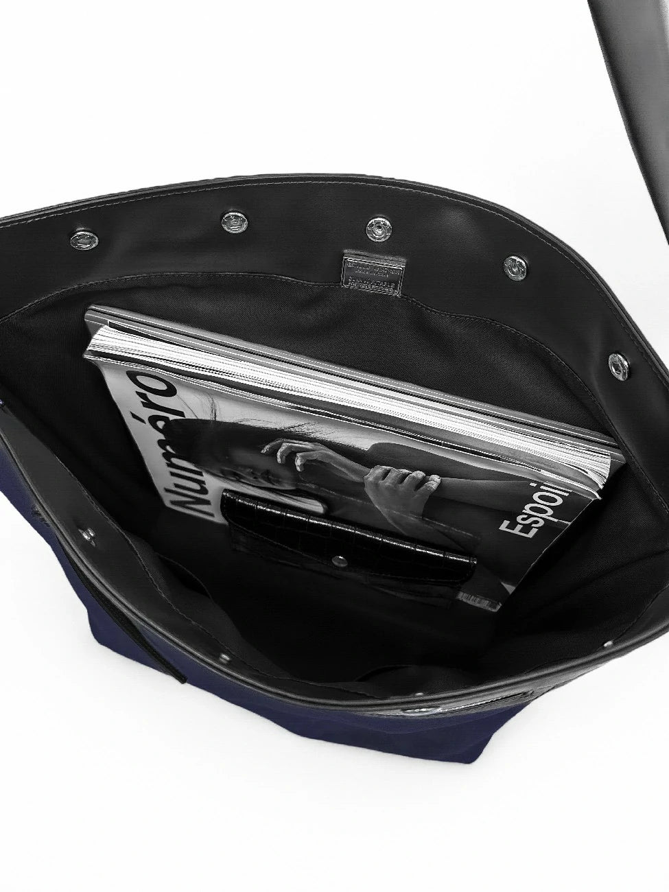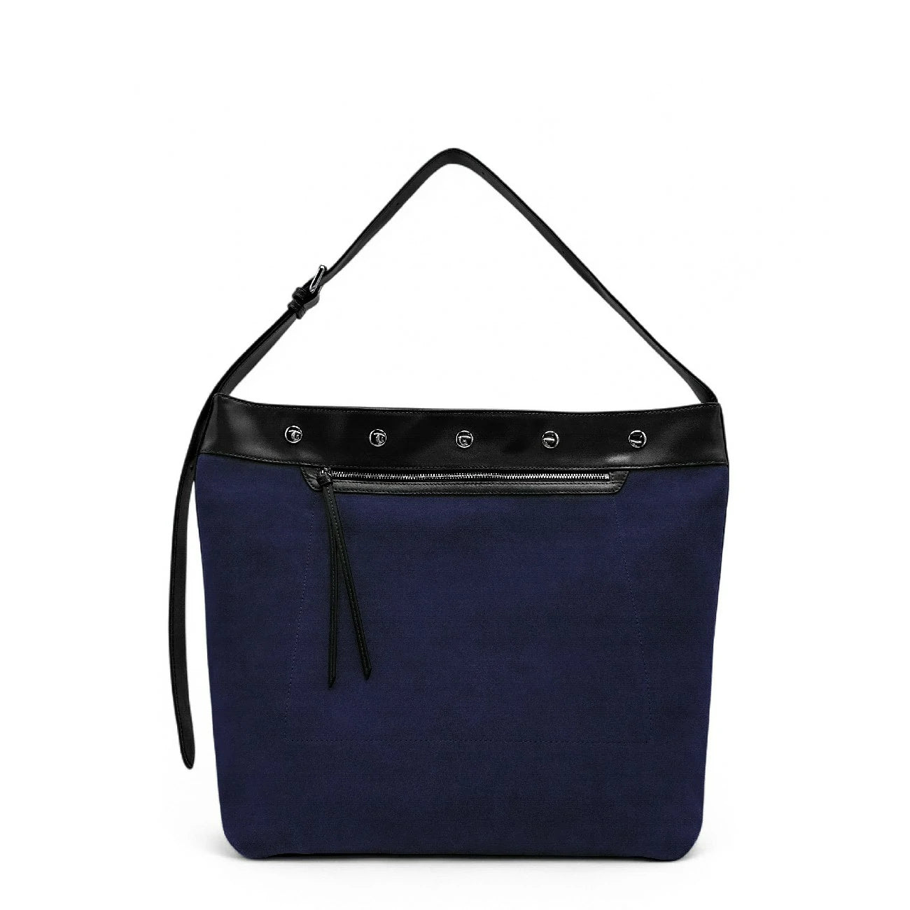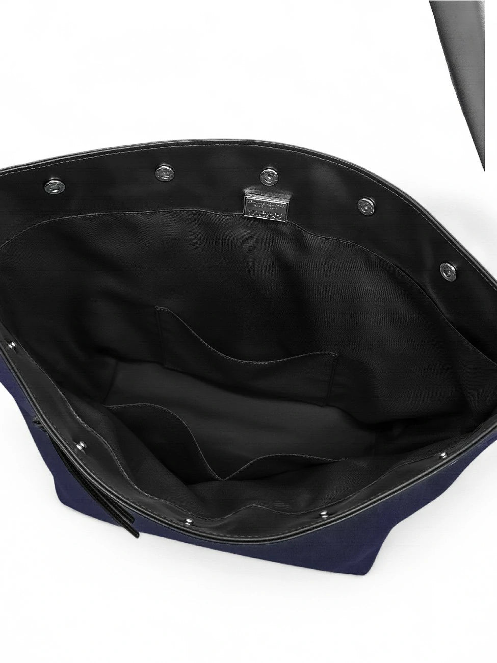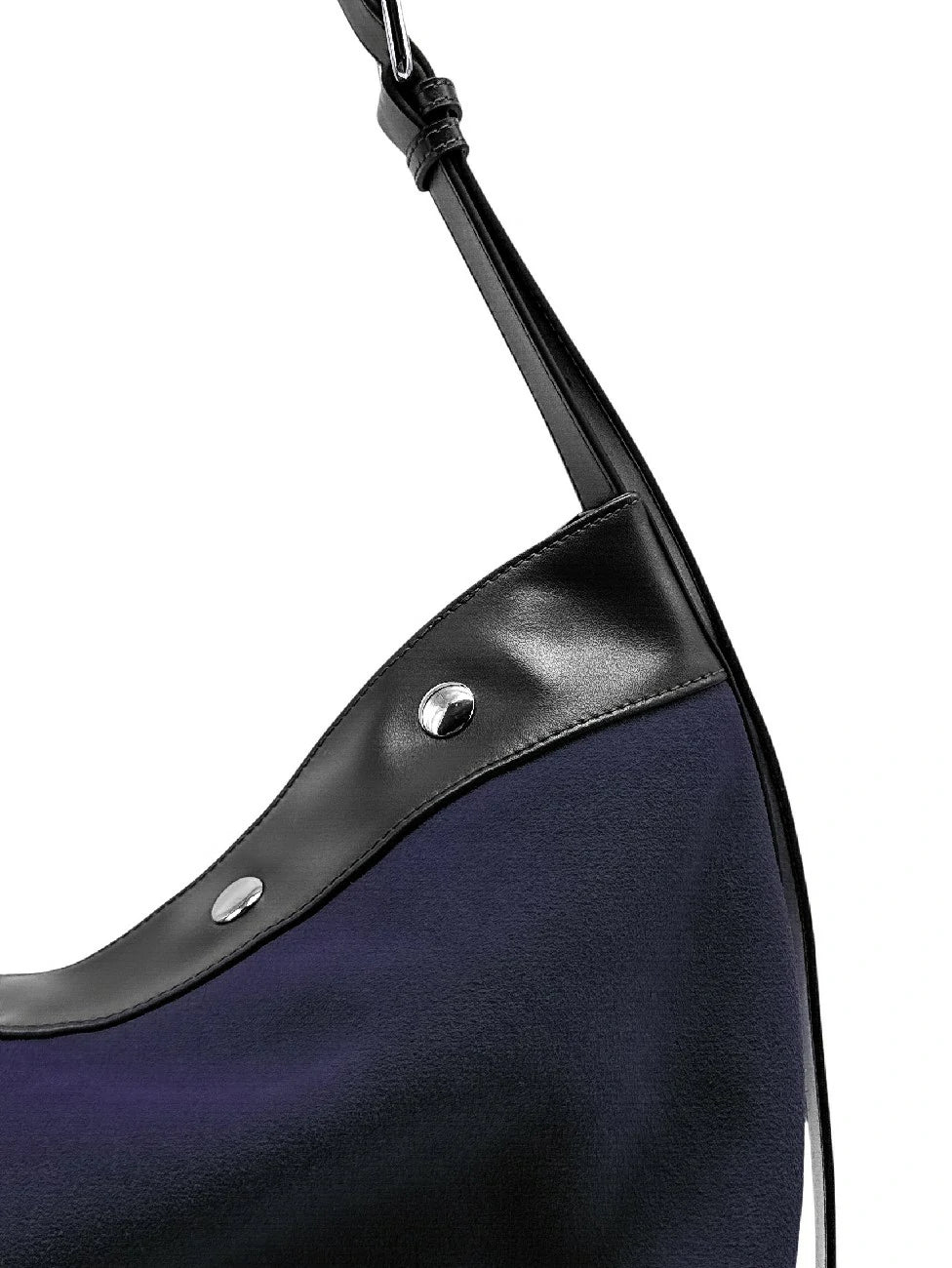 Sac cabas mono-anse en cuir nubuck et cuir lisse bleu marine, détails cloutés, porté épaule, fabriqué en Italie.