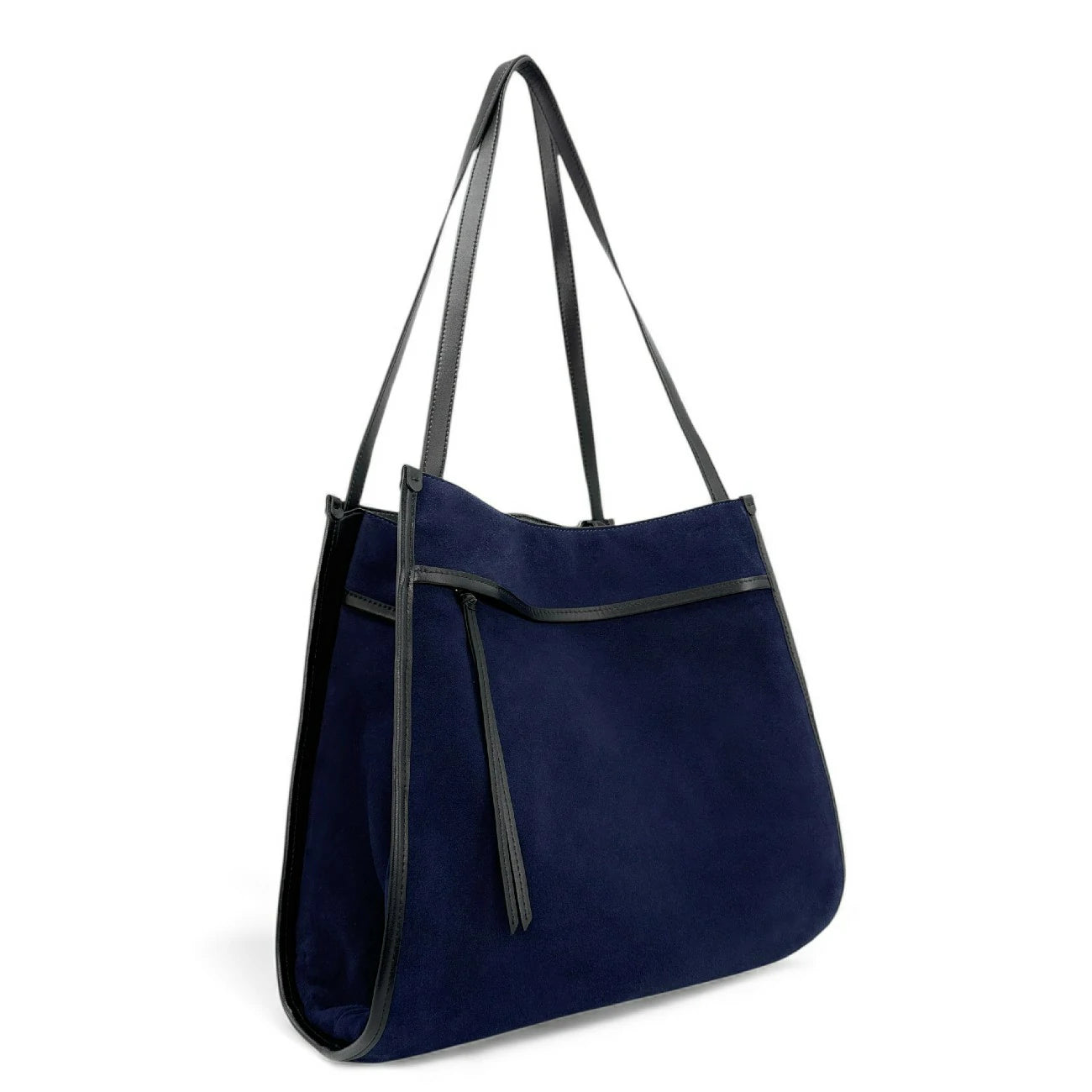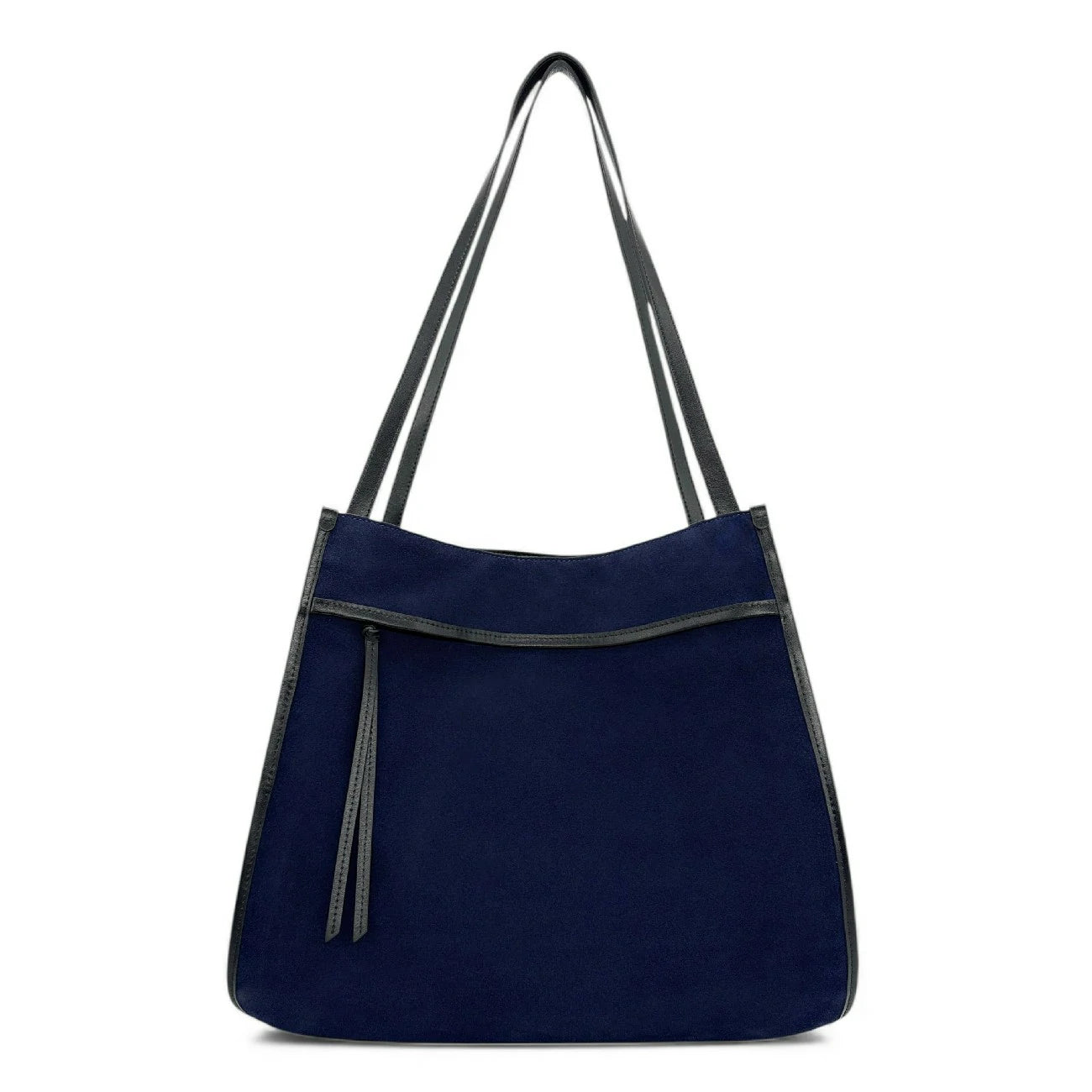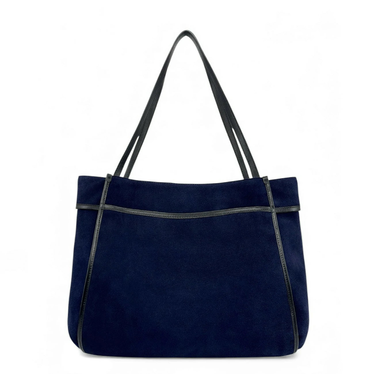 Sac cabas en cuir nubuck bleu marine, détails gansés en cuir lisse, porté épaule, fabriqué en Italie.