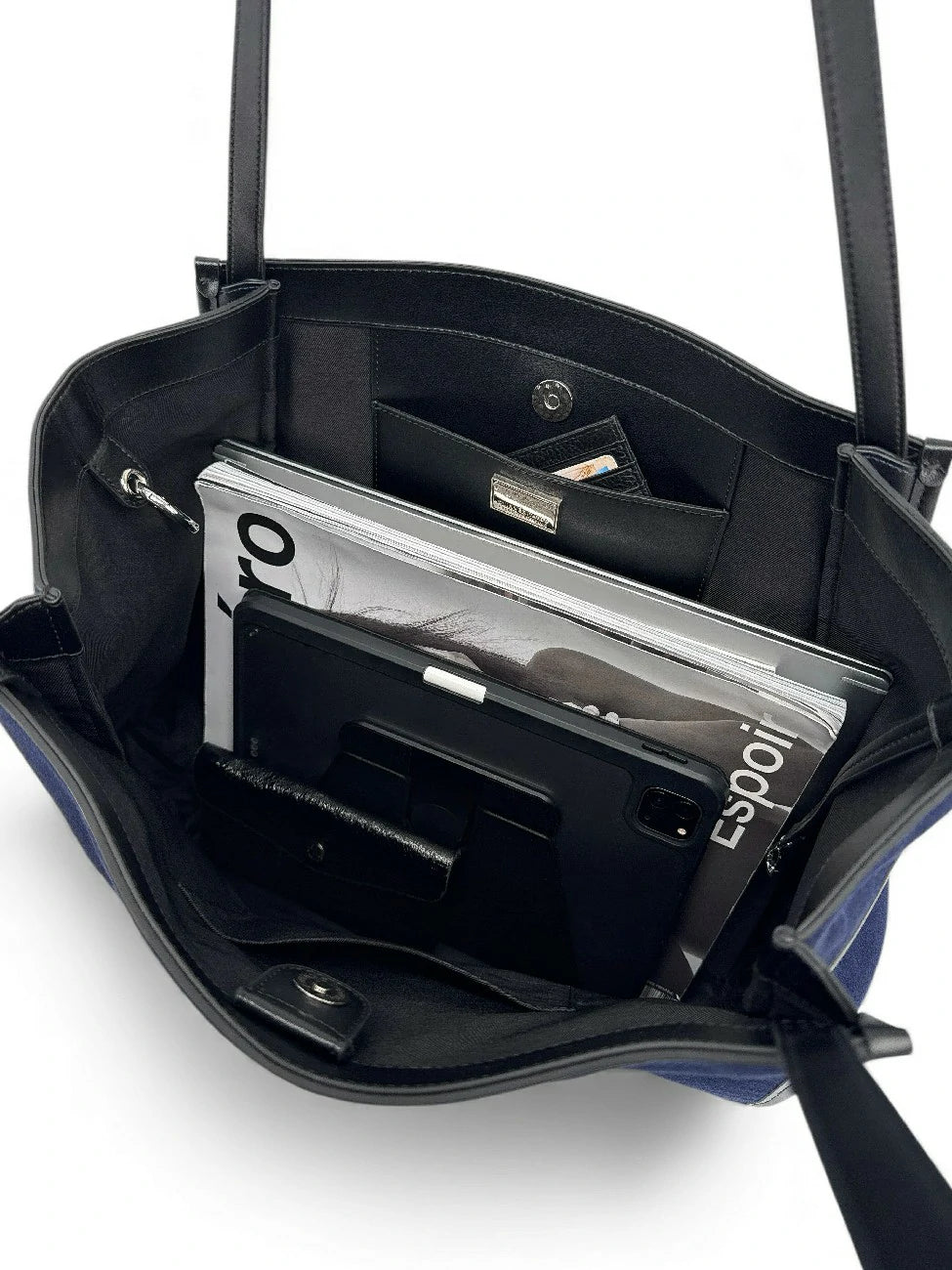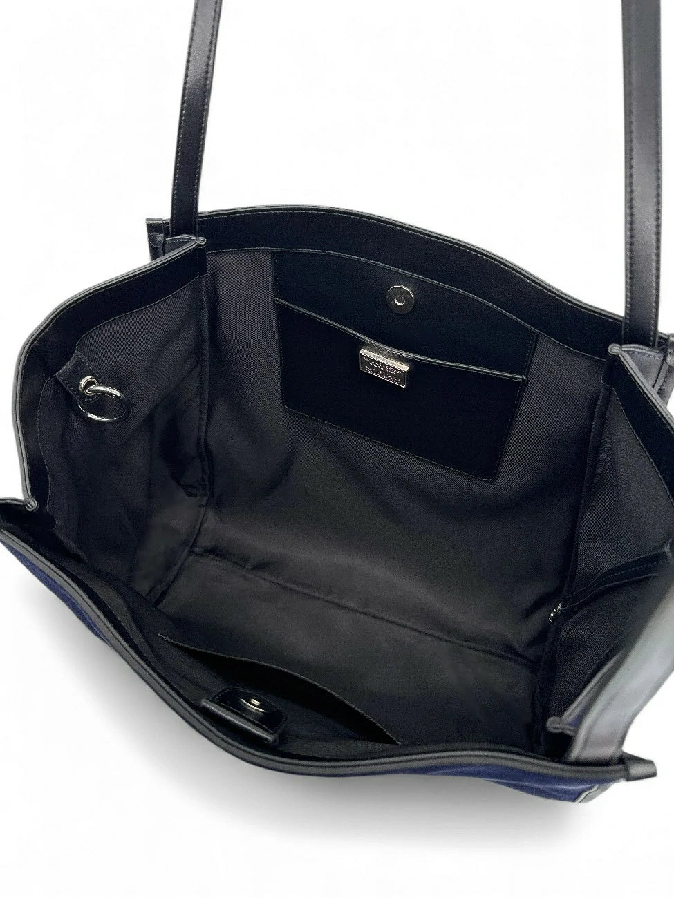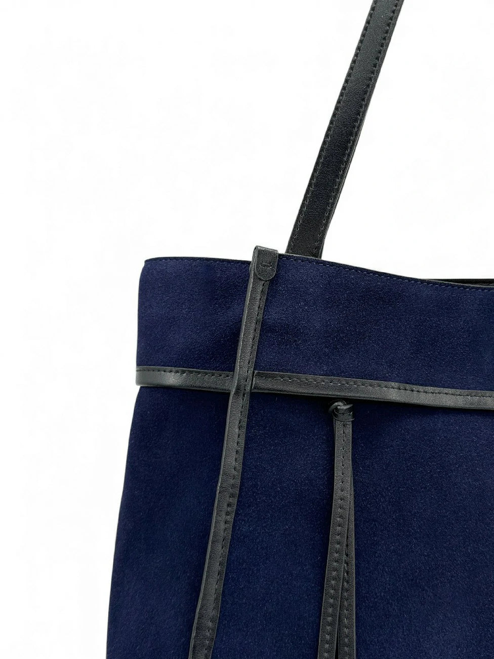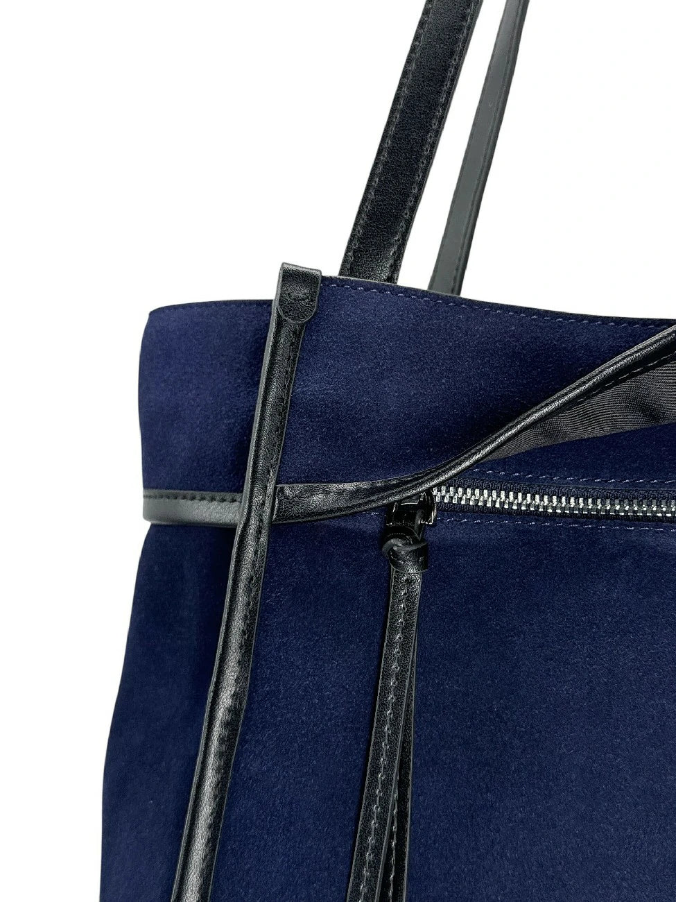 Sac cabas en cuir nubuck bleu marine, détails gansés en cuir lisse, porté épaule, fabriqué en Italie.