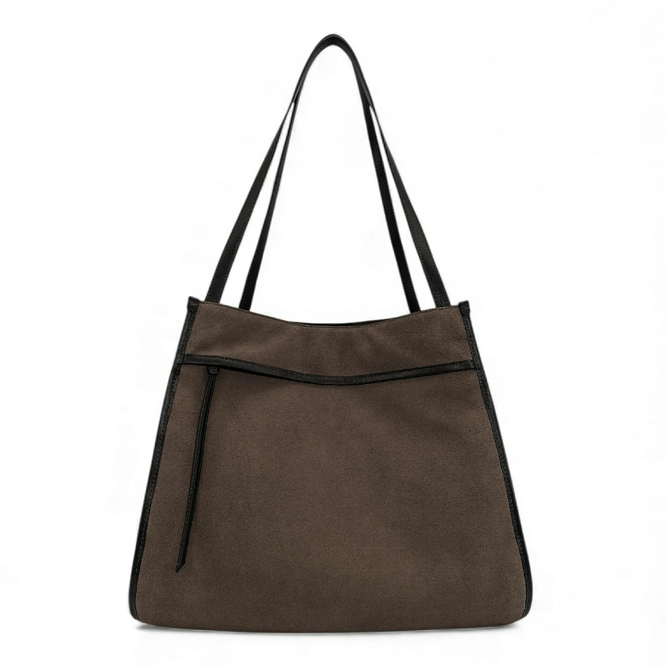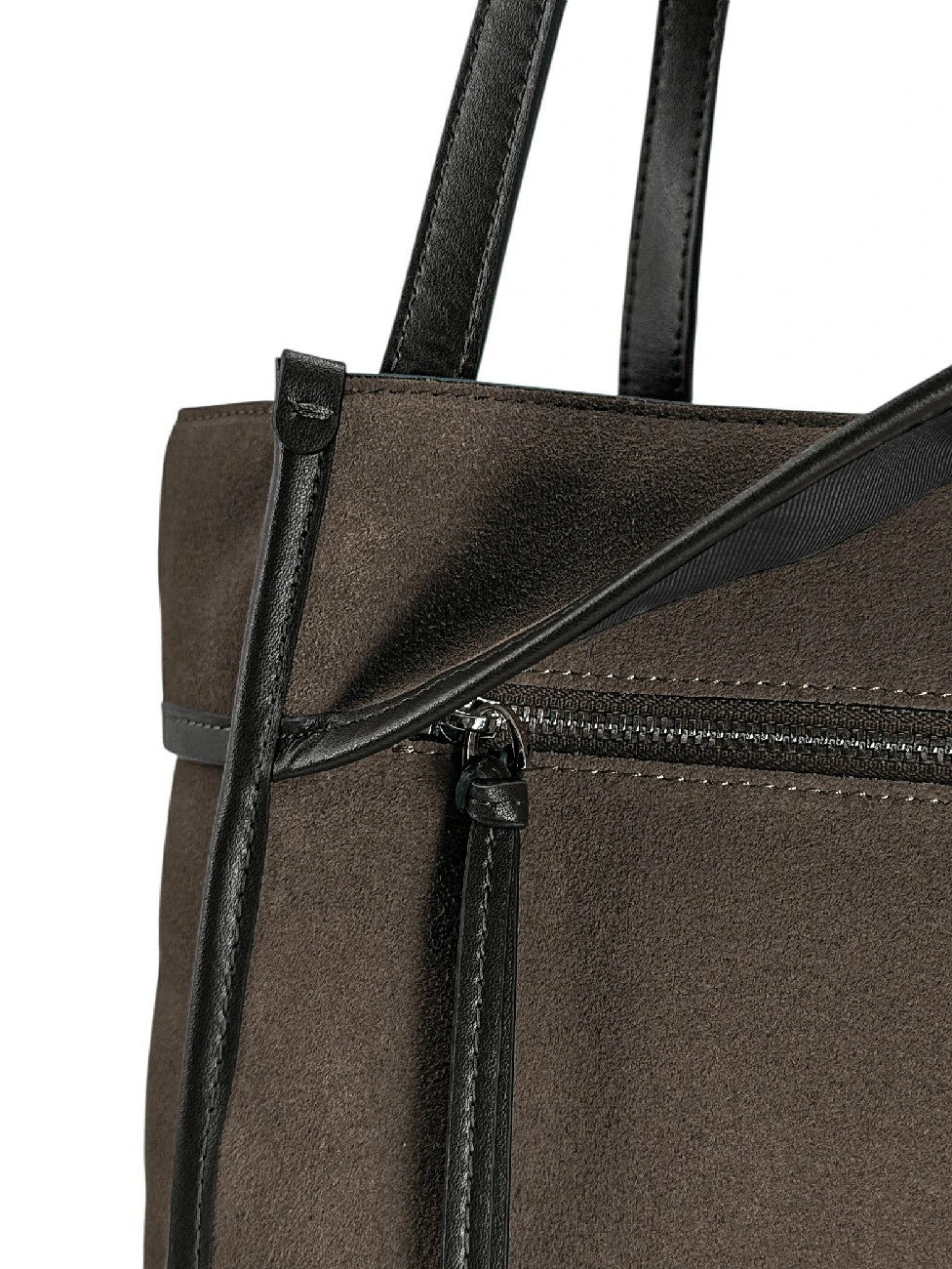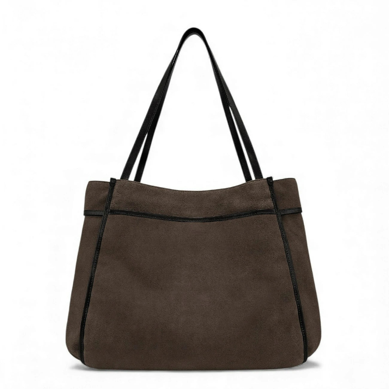 Sac cabas en cuir nubuck chocolat, détails gansés en cuir lisse, porté épaule, fabriqué en Italie.