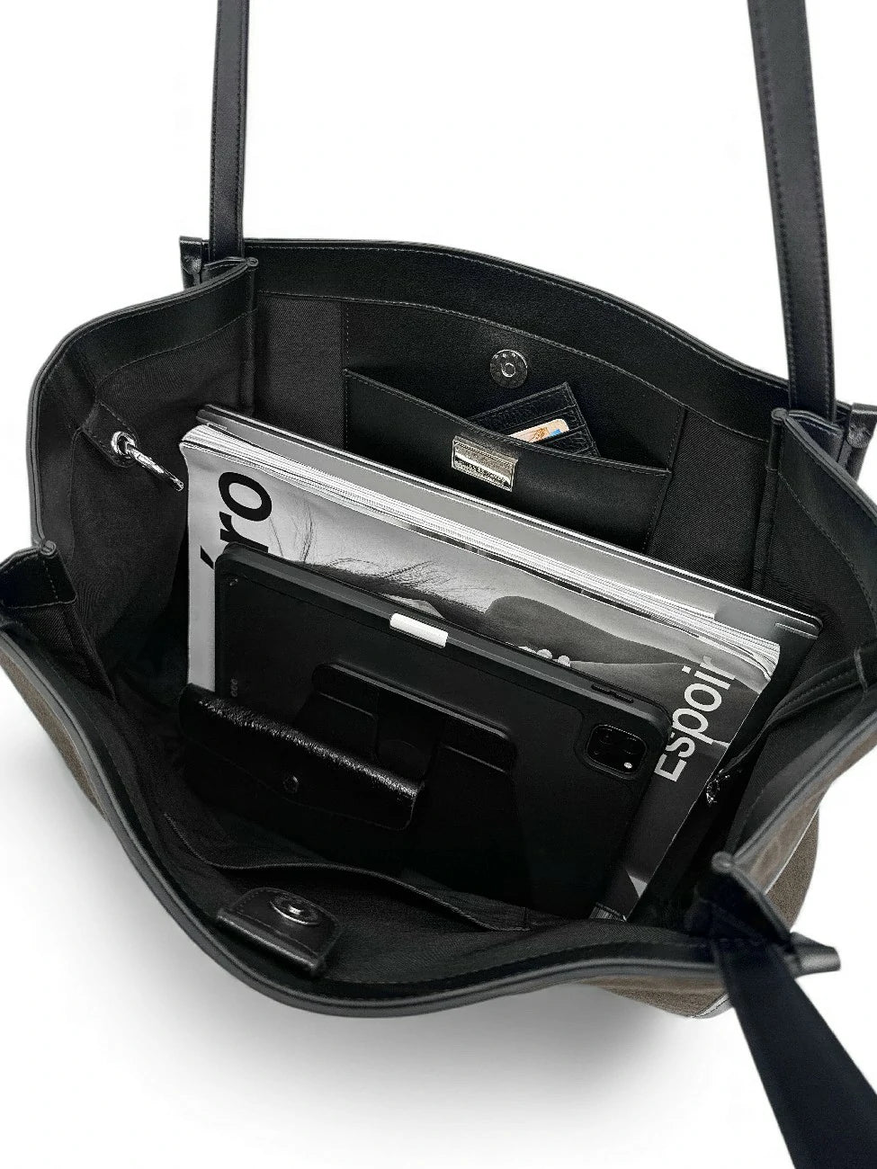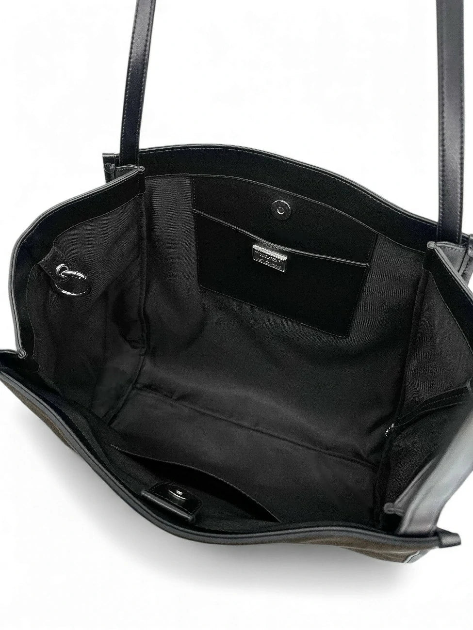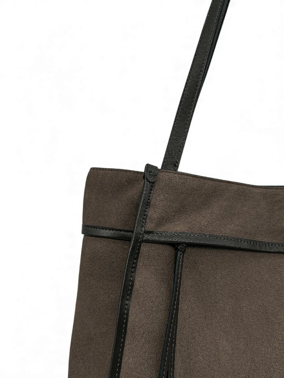 Sac cabas en cuir nubuck chocolat, détails gansés en cuir lisse, porté épaule, fabriqué en Italie.