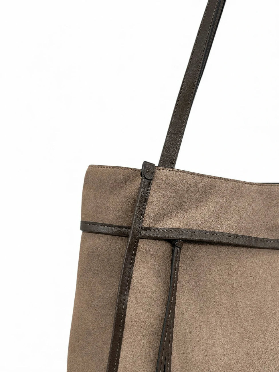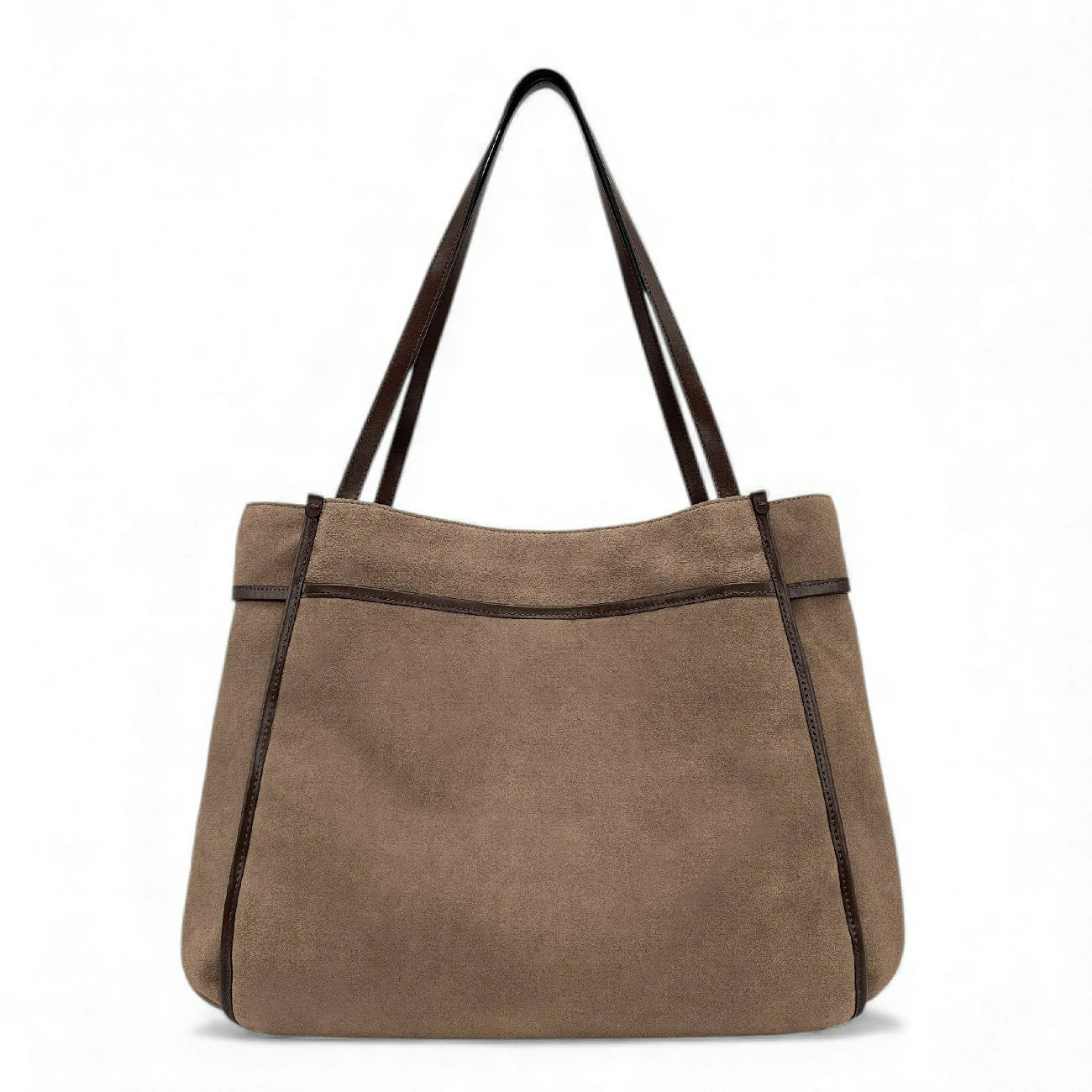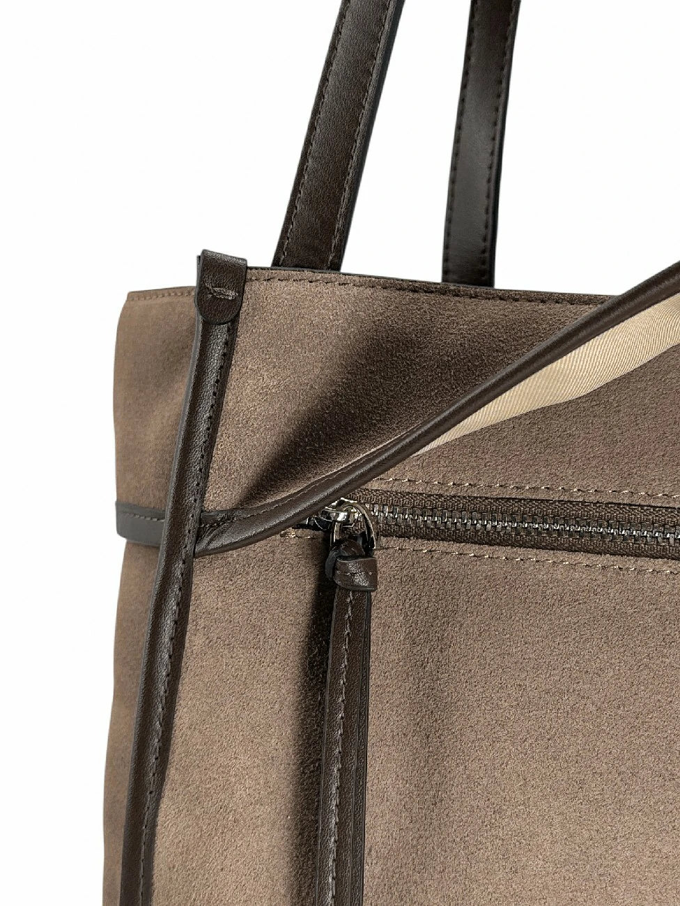 Sac cabas en cuir nubuck taupe foncé, détails gansés en cuir lisse, porté épaule, fabriqué en Italie.