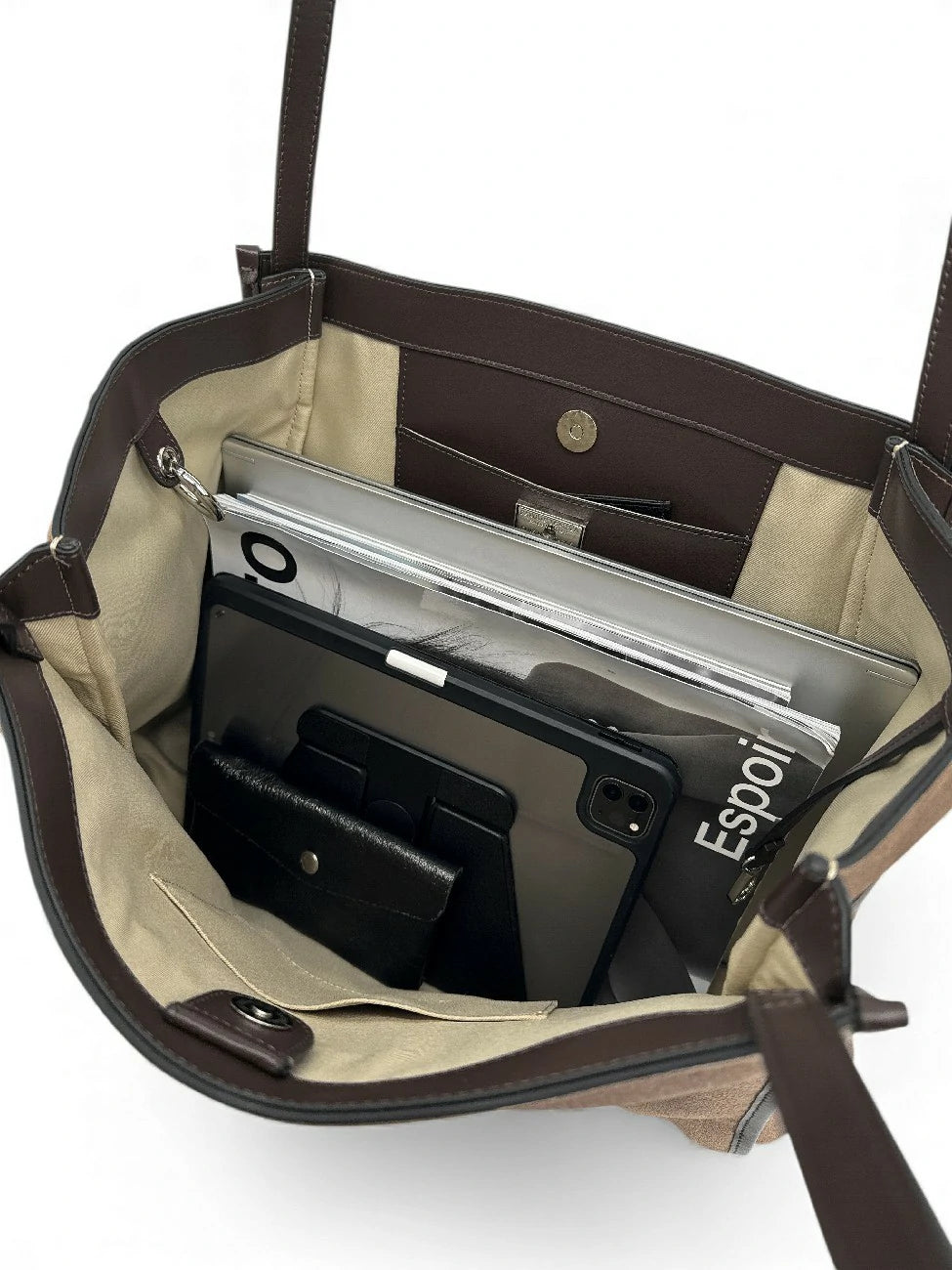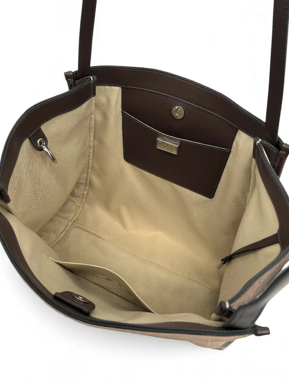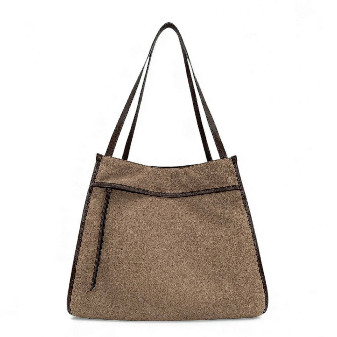 Sac cabas en cuir nubuck taupe foncé, détails gansés en cuir lisse, porté épaule, fabriqué en Italie.