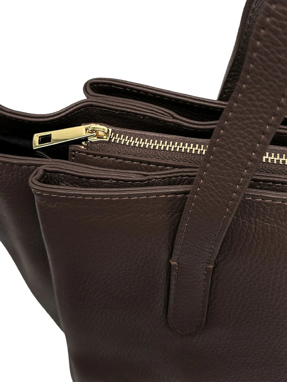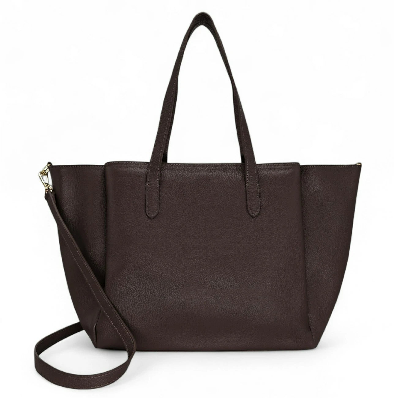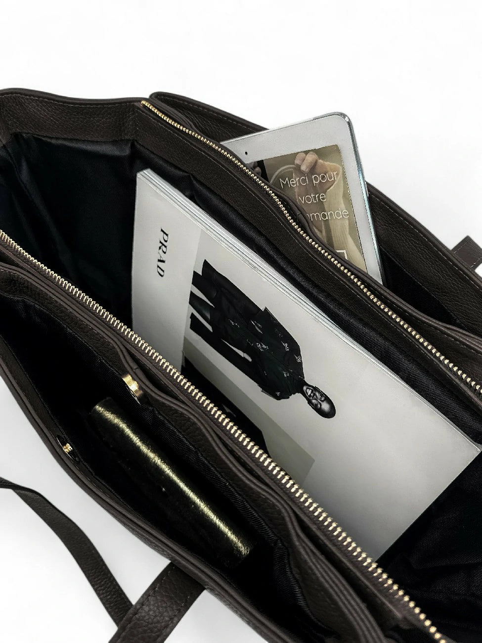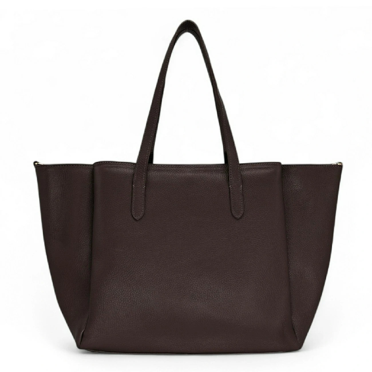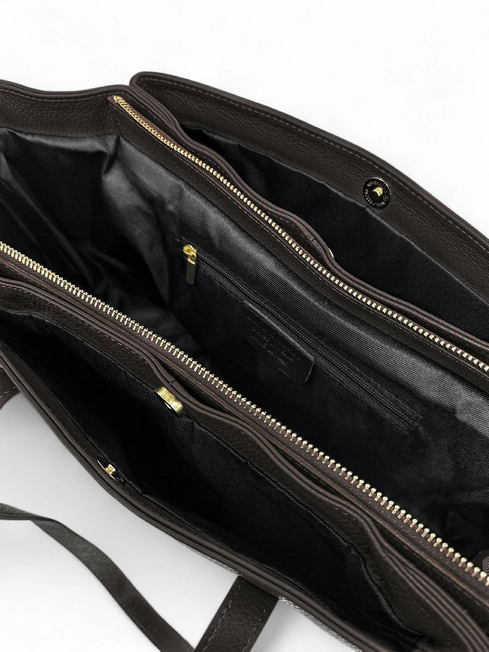 Grand sac type cabas multi-compartiments en cuir grainé chocolat, porté main, épaule ou bandoulière, fabriqué en Italie.