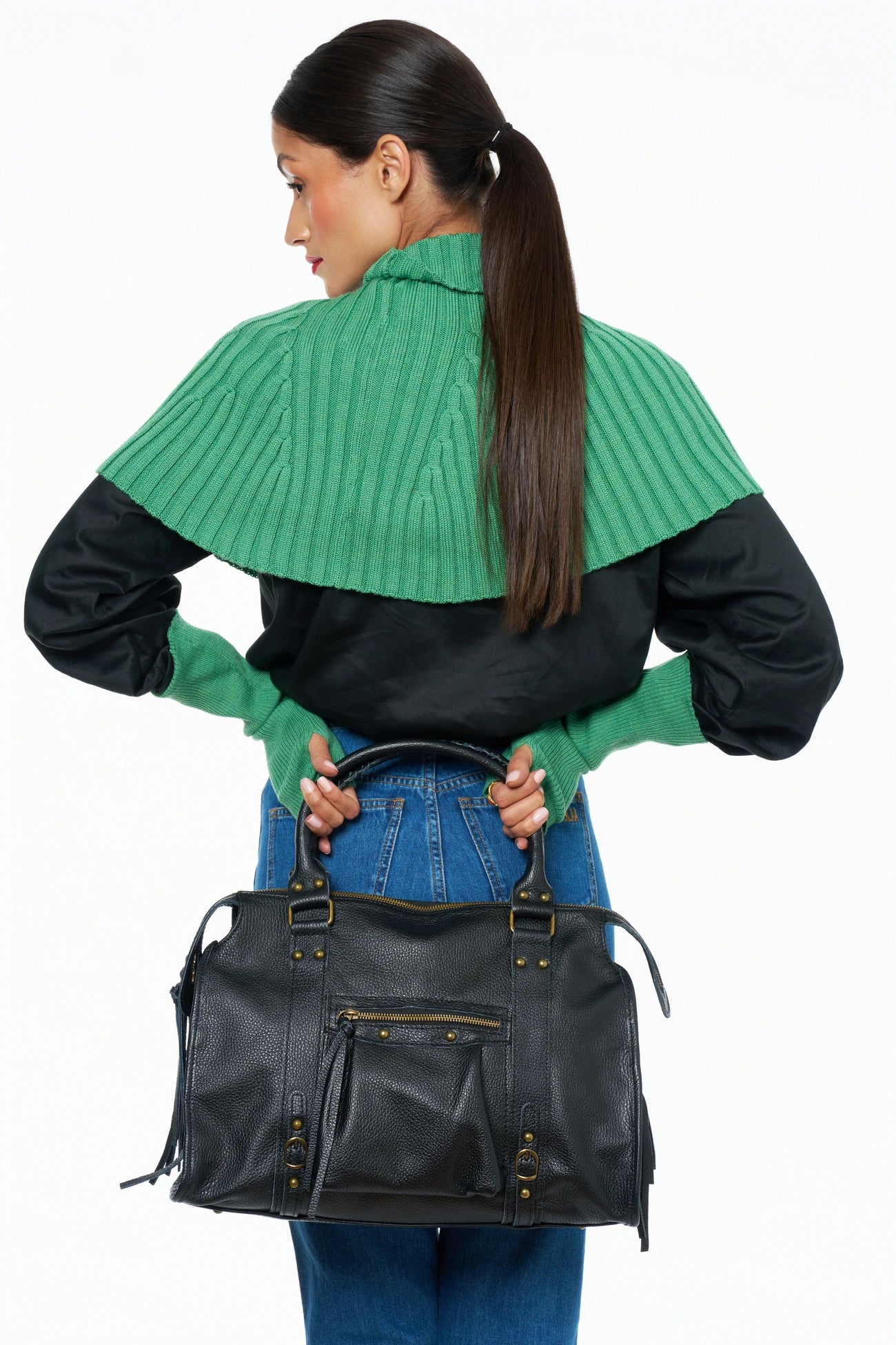 Notre best seller décline ici en noir sa version la plus adaptée pour les cours ou le bureau ! Grâce à un solide cuir texturé bénéficiant d'une finition protectrice, il ne craint pas de sortir sous la pluie, et transporter cahiers et ordinateur ne lui pose pas de souci. Il ne sacrifie rien au style qui fait de lui un best-seller : forme trapèze, petits clous rond laitonnés, lacets et anses filetés, et offre en plus un rapport qualité prix absolument imbattable ! Efficace, tendance, et tout nouveau : de petites quantités seulement seront disponible pour Noel, ne tardez pas !