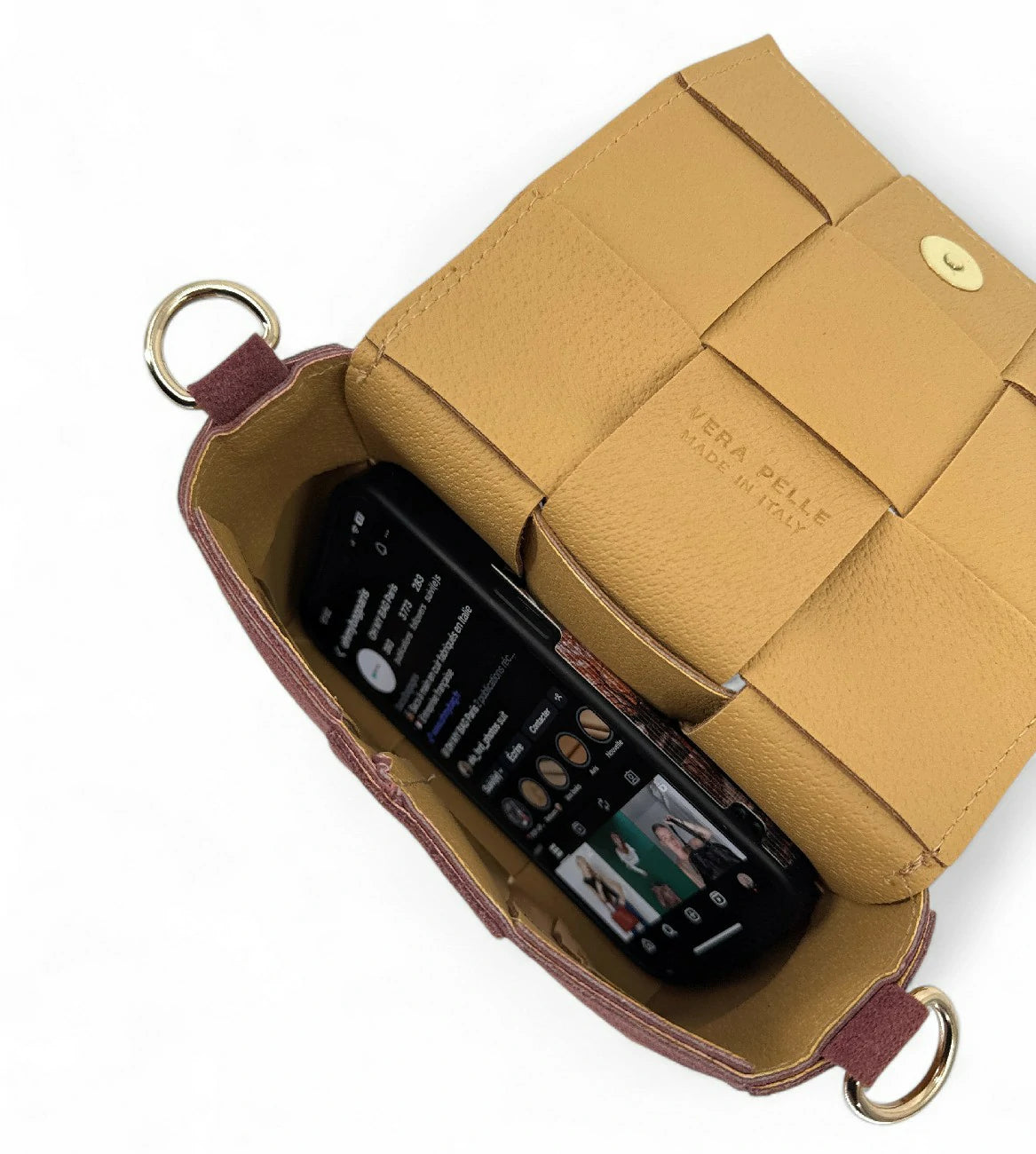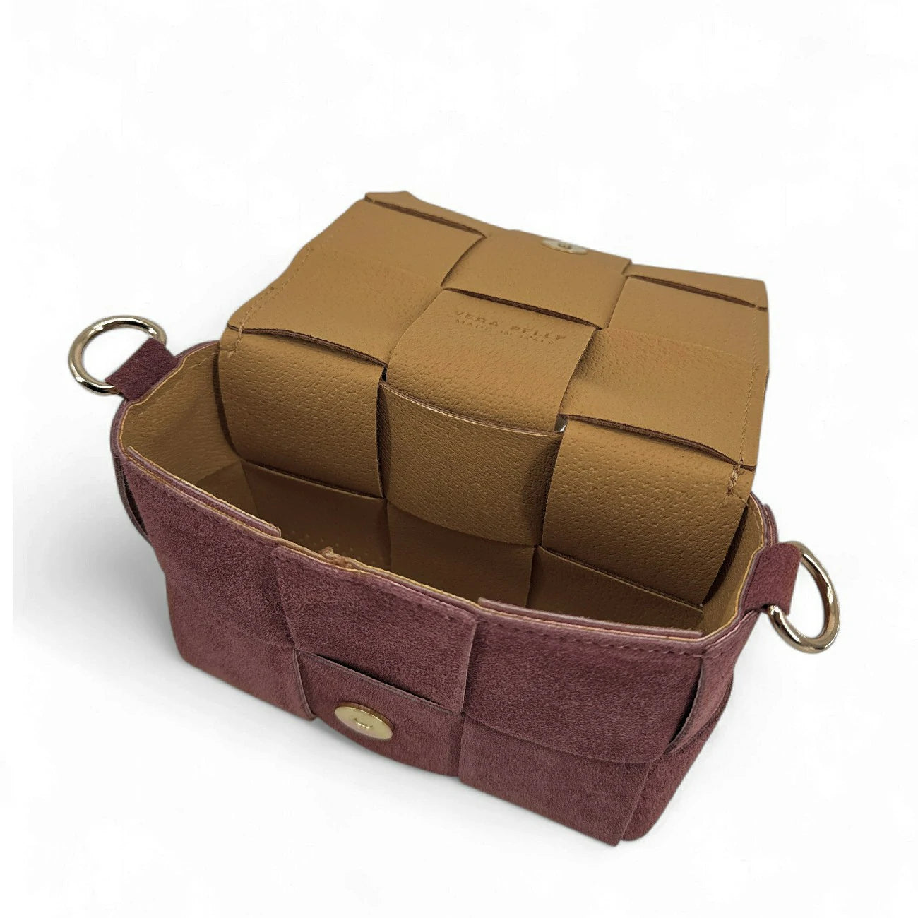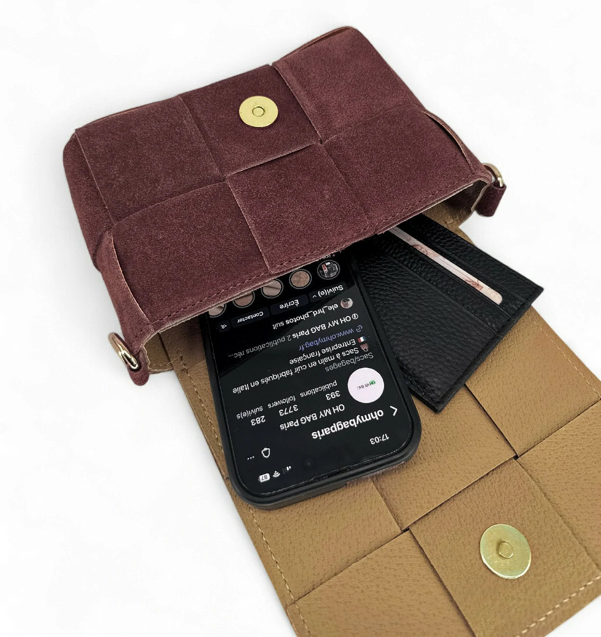 Sac pochette format micro en bandes de cuir nubuck tressées, fabriqué en Italie.