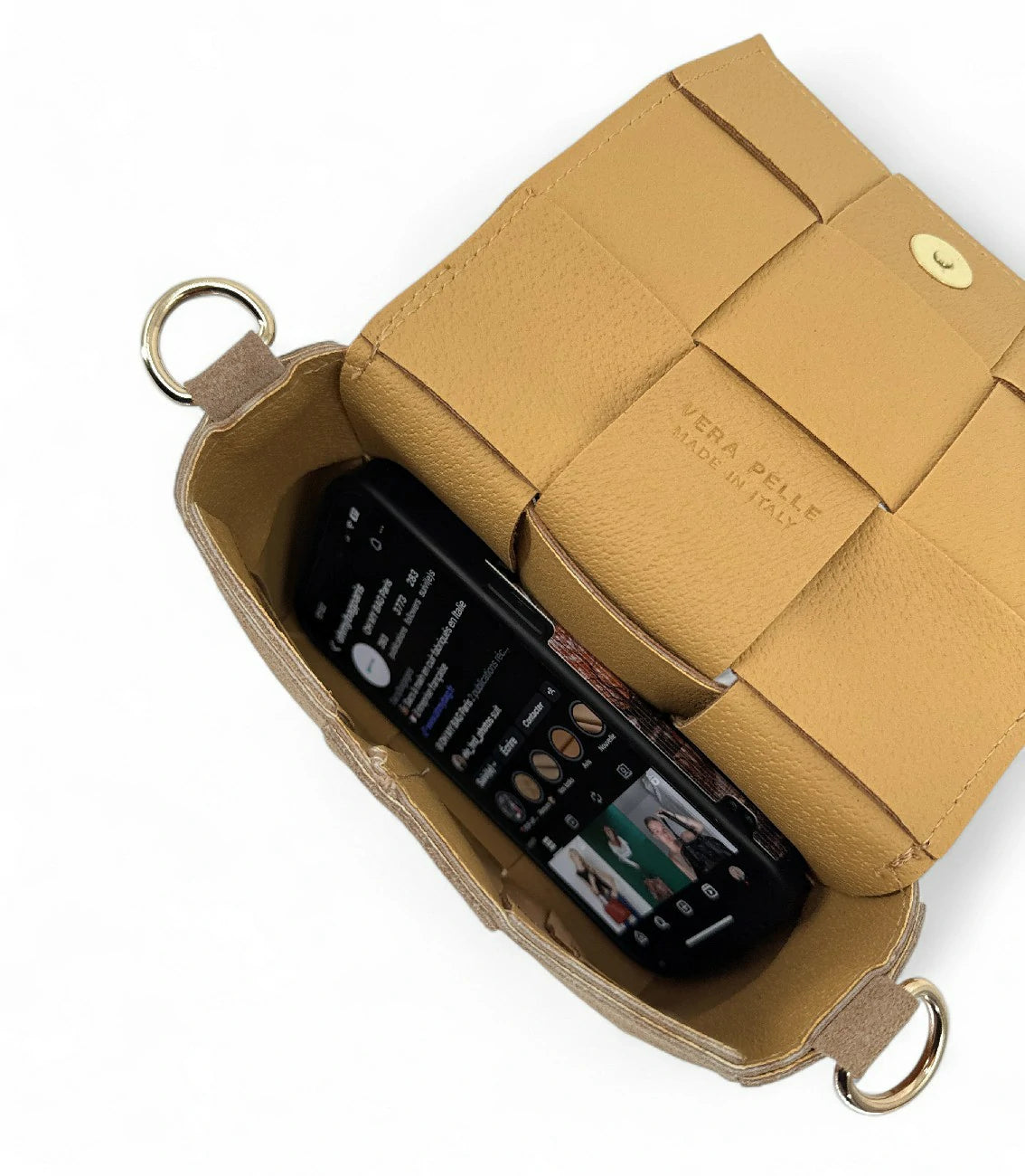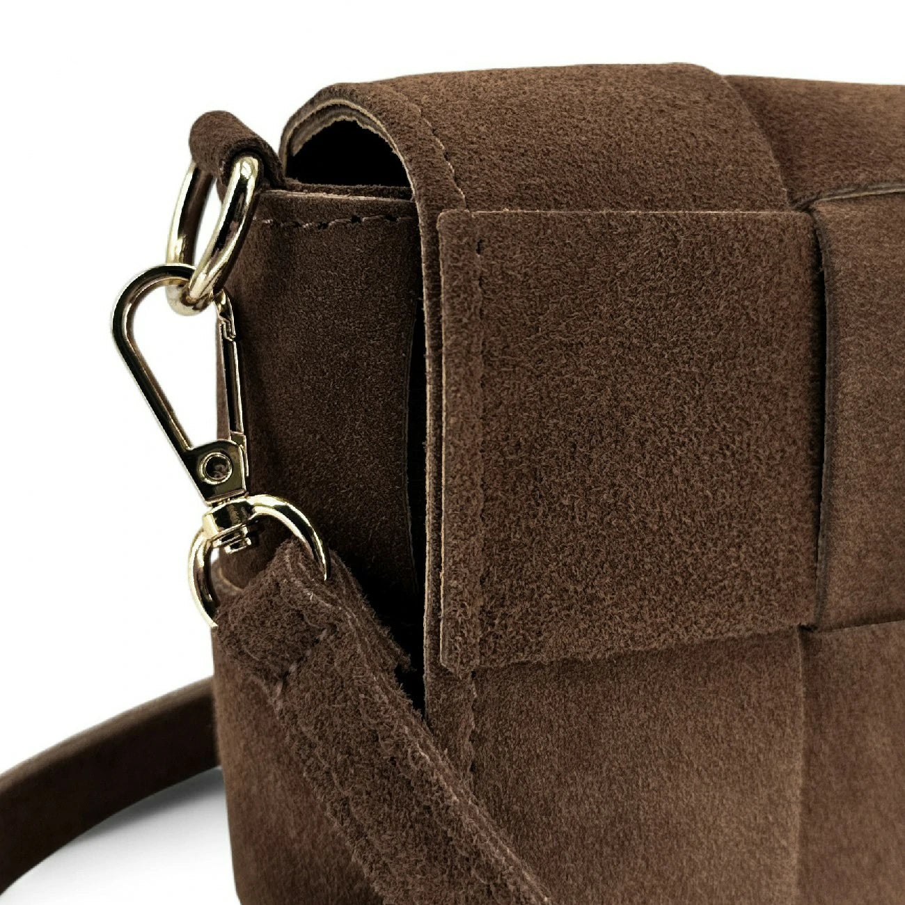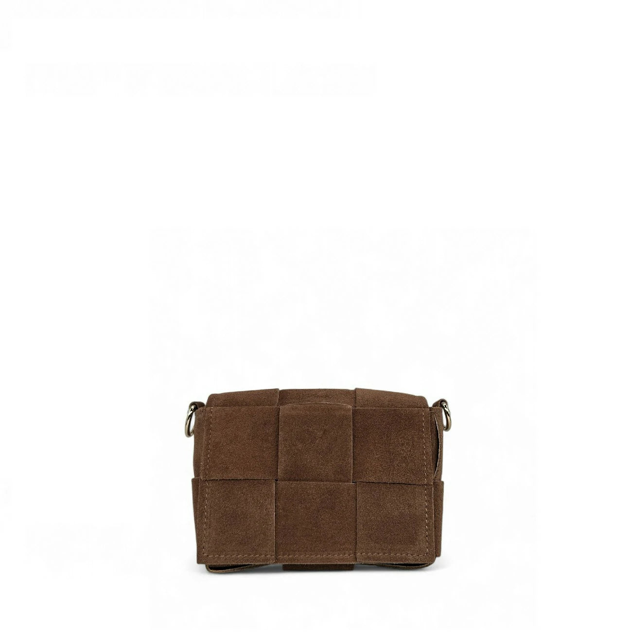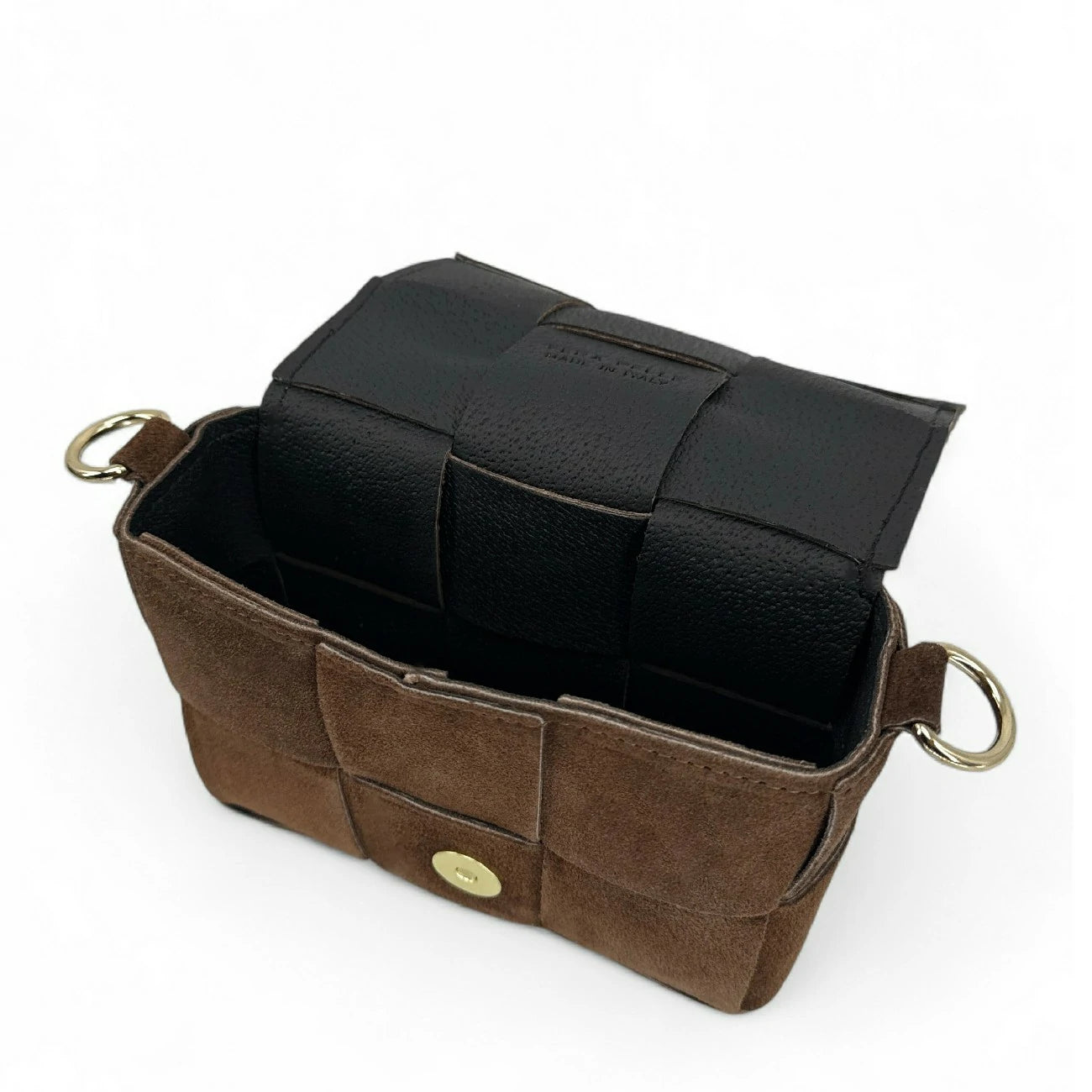 Sac pochette format micro en bandes de cuir nubuck tressées, fabriqué en Italie.