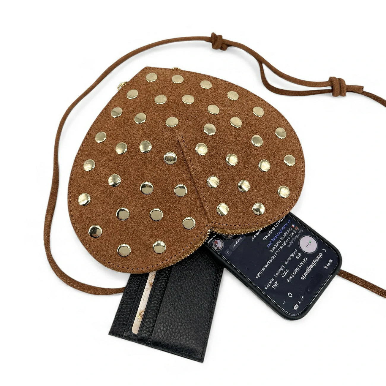 Pensé comme un talisman glam rock, ce mini sac en cuir nubuck adopte sa silhouette cœur ponctuée de gros clous dorés. Compact mais astucieux, il accueille l’essentiel : téléphone, mini porte-cartes, rouge à lèvres, clés. Sa bandoulière ajustable nouée à la base ajoute un charme rebelle, tandis que la fermeture à double curseur sécurise le compartiment rigide à soufflet.