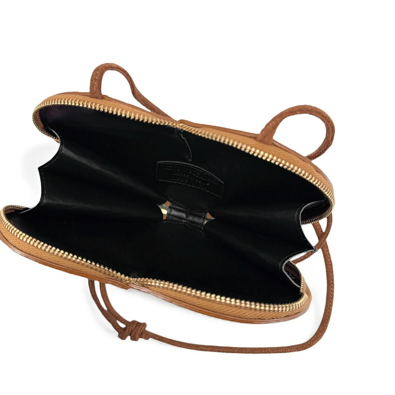 Sac bijou en cuir nubuck camel foncé style minaudière, porté épaule et bandoulière, fabriqué en Italie.