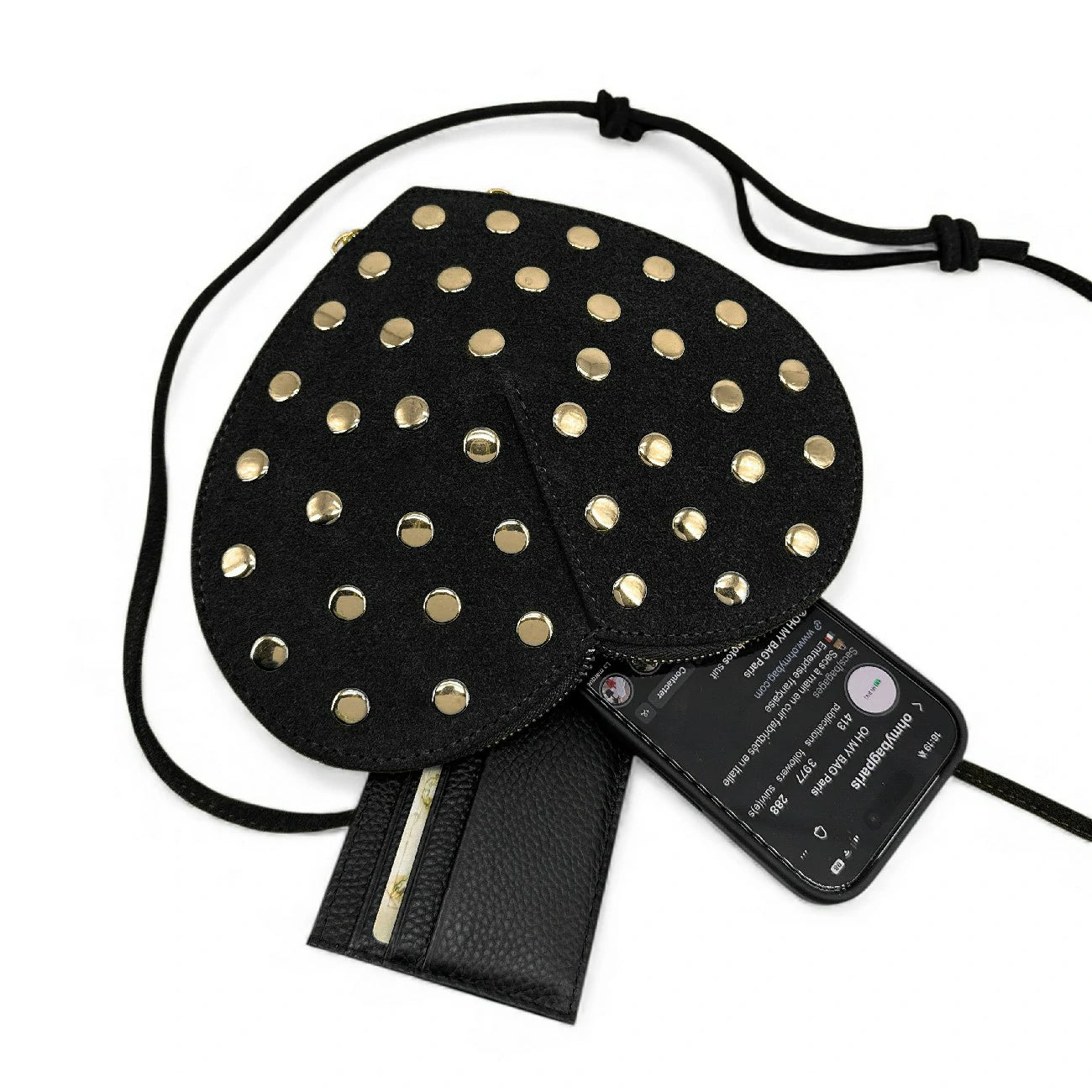 Ce mini sac cœur en cuir nubuck clouté inspire un esprit glam rock assumé. Son format mini accueille vos essentiels : téléphone, cartes, clés, rouge à lèvres. Le compartiment rigide à soufflet est protégé par un double curseur, tandis que la bandoulière ajustable apporte une touche rebelle et stylée. En pochette de soirée, il réhaussera avec originalité toute petite robe noire un peu classique.