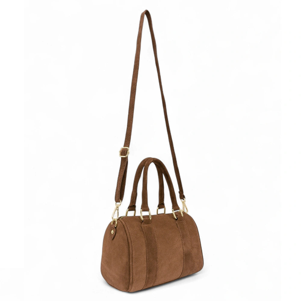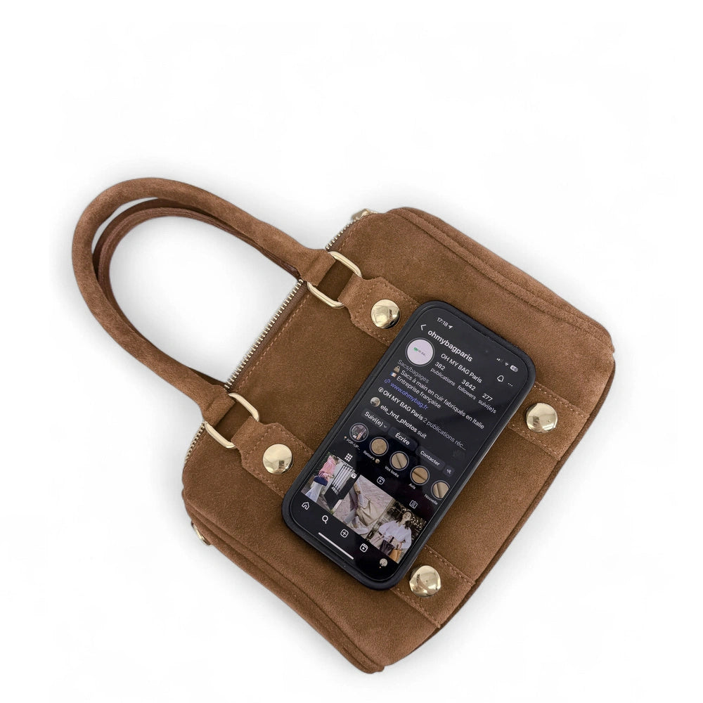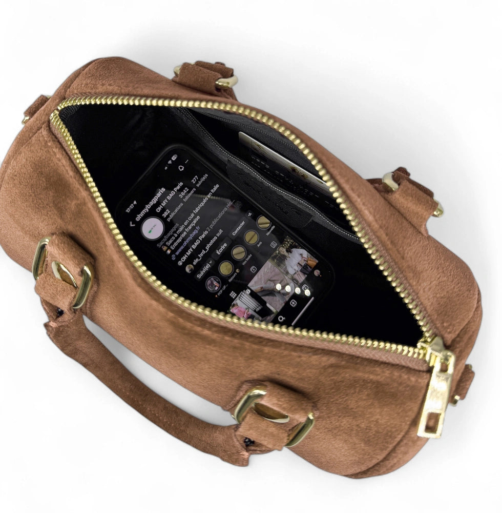 Avec sa forme bowling structurée, ce mini sac à main en daim révèle une densité assumée et une tenue parfaite au quotidien. Anses roulées, gros clous dorés, ferrures carrées scintillantes et bandoulière amovible signent un style rétro-glam maîtrisé. Un format mini mais généreux, idéal pour porter l’essentiel avec allure.