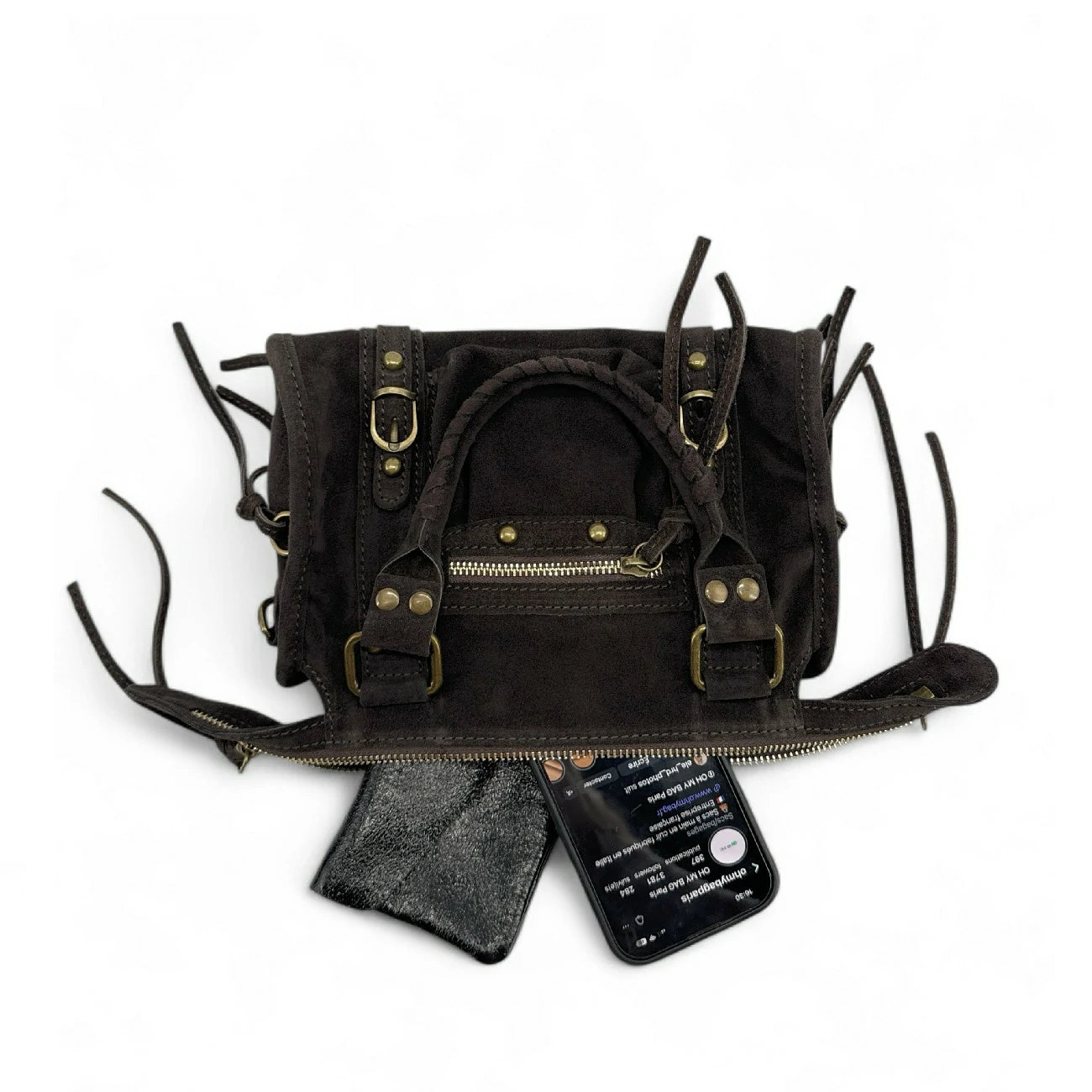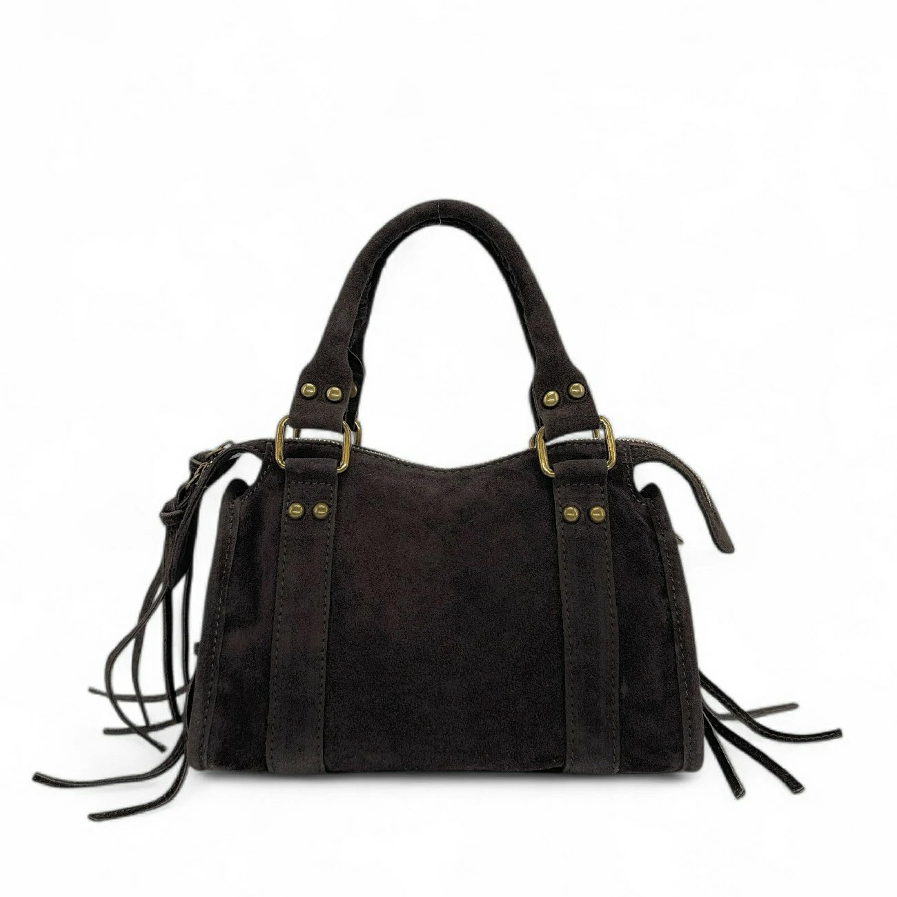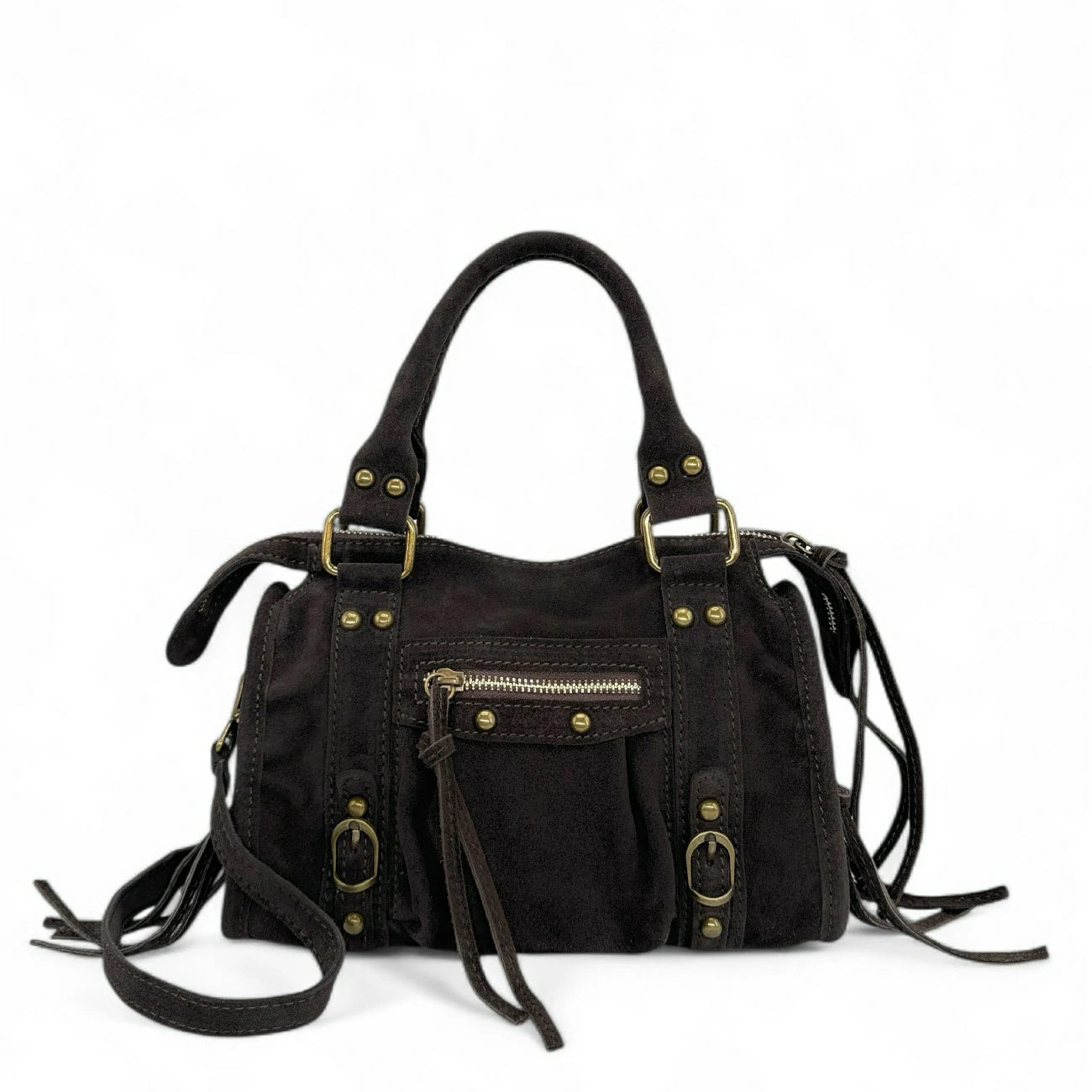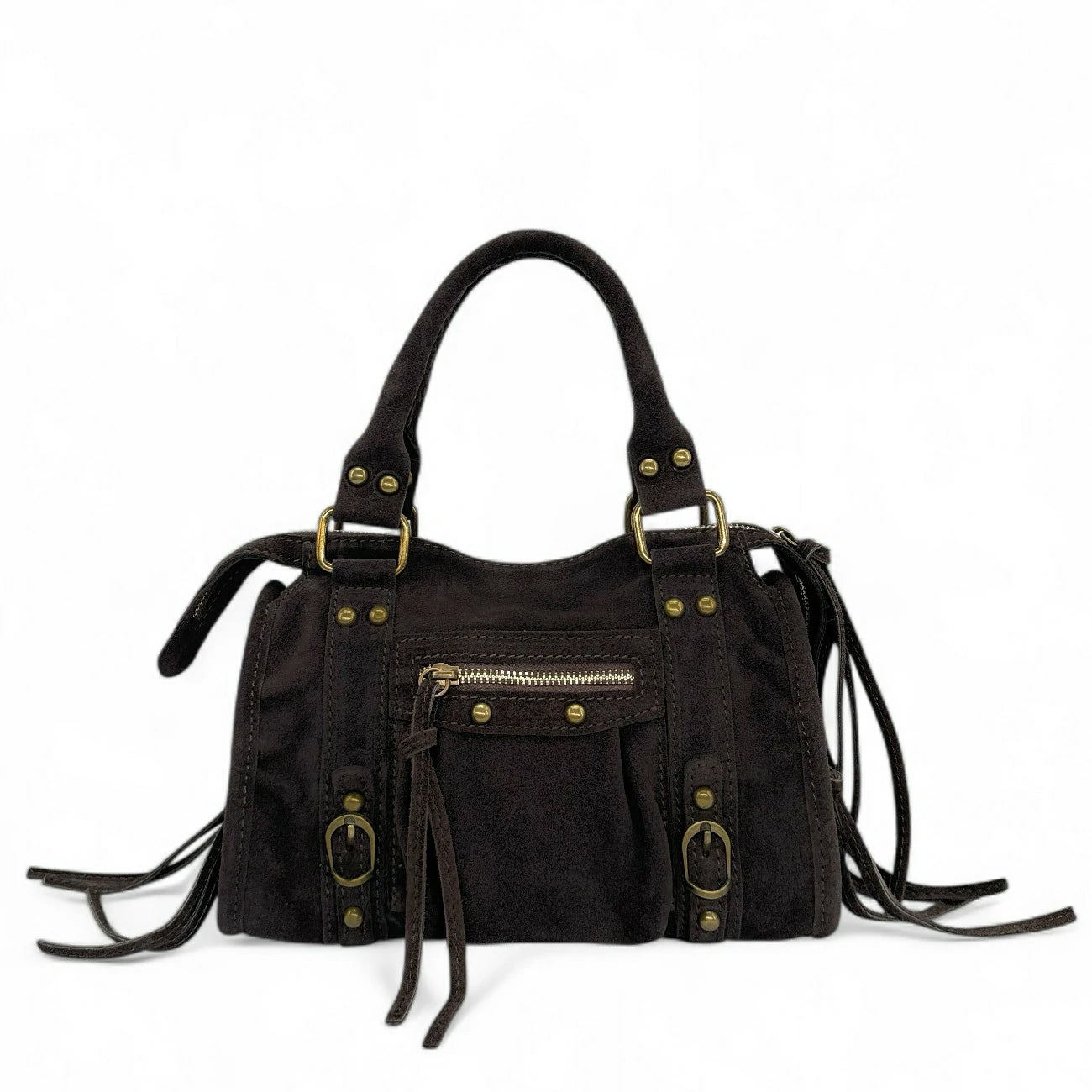 Mini sac en cuir nubuck chocolat, porté main ou bandoulière, fabriqué en Italie.