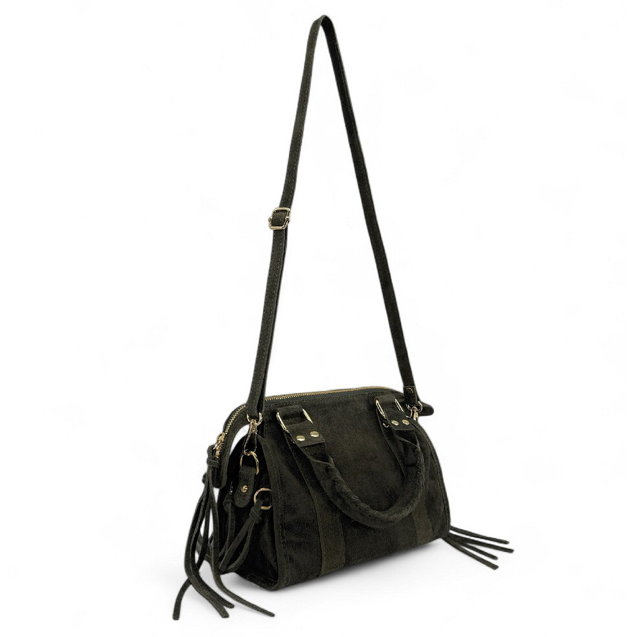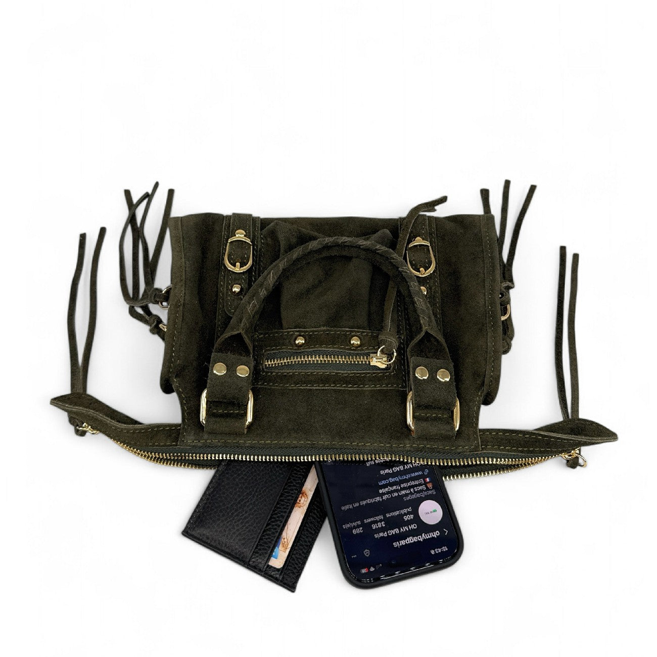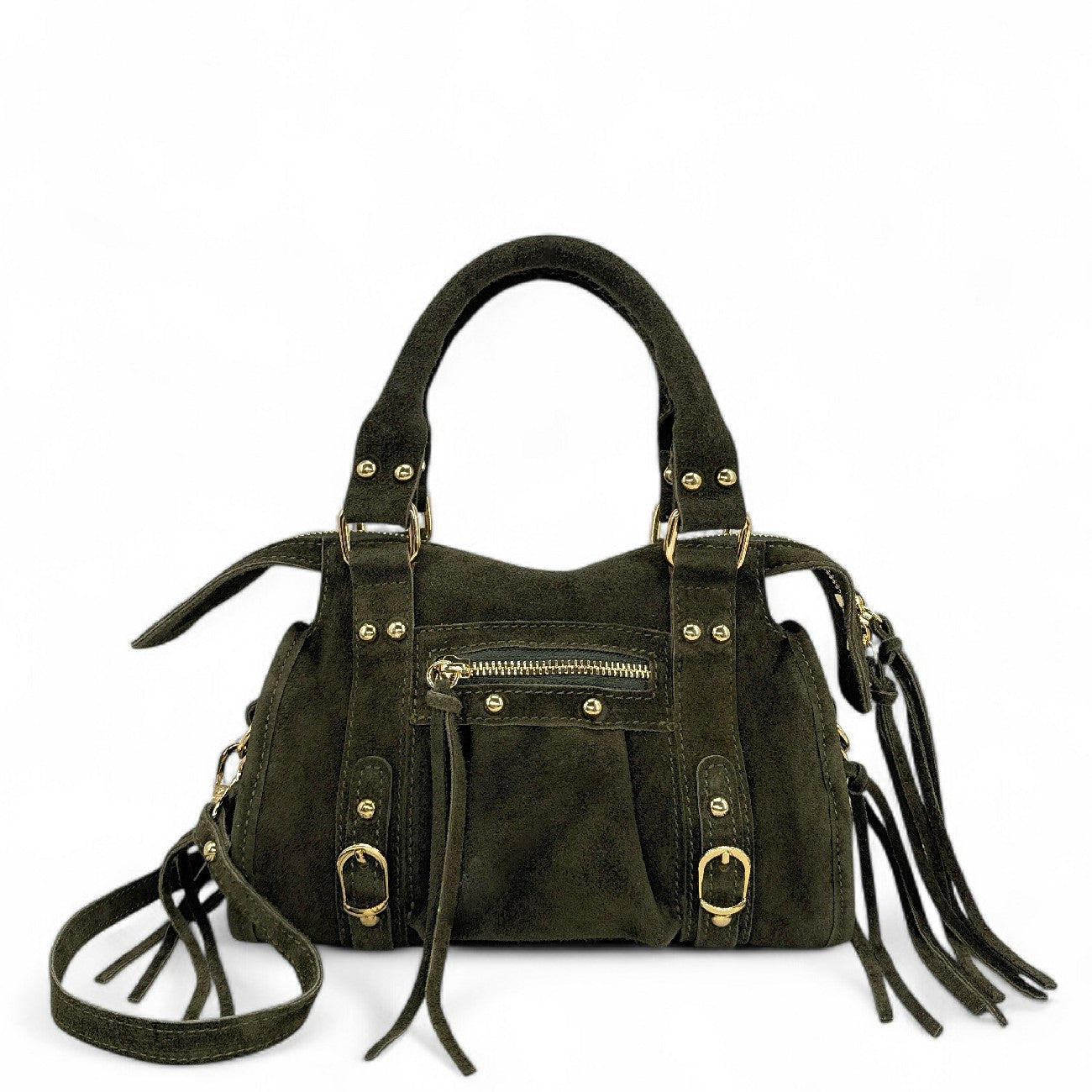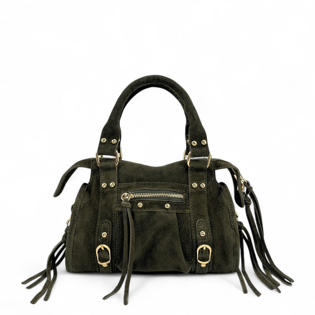 Mini sac en cuir nubuck kaki, porté main ou bandoulière, fabriqué en Italie.