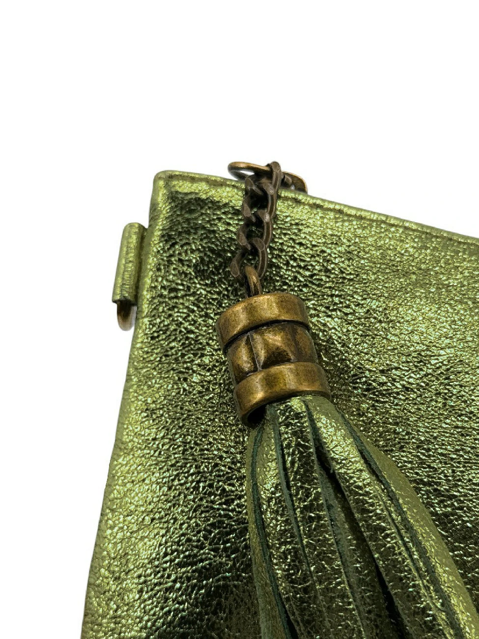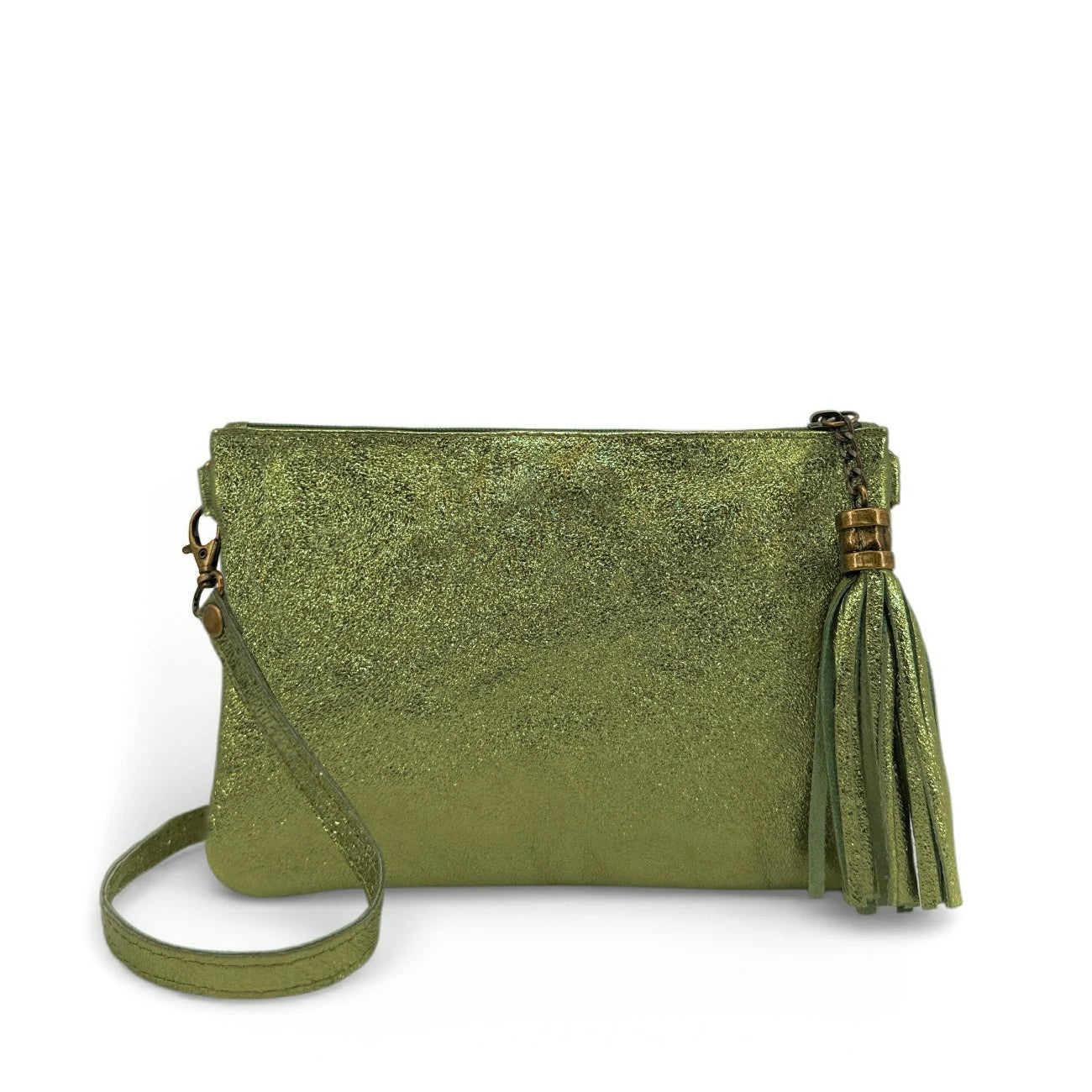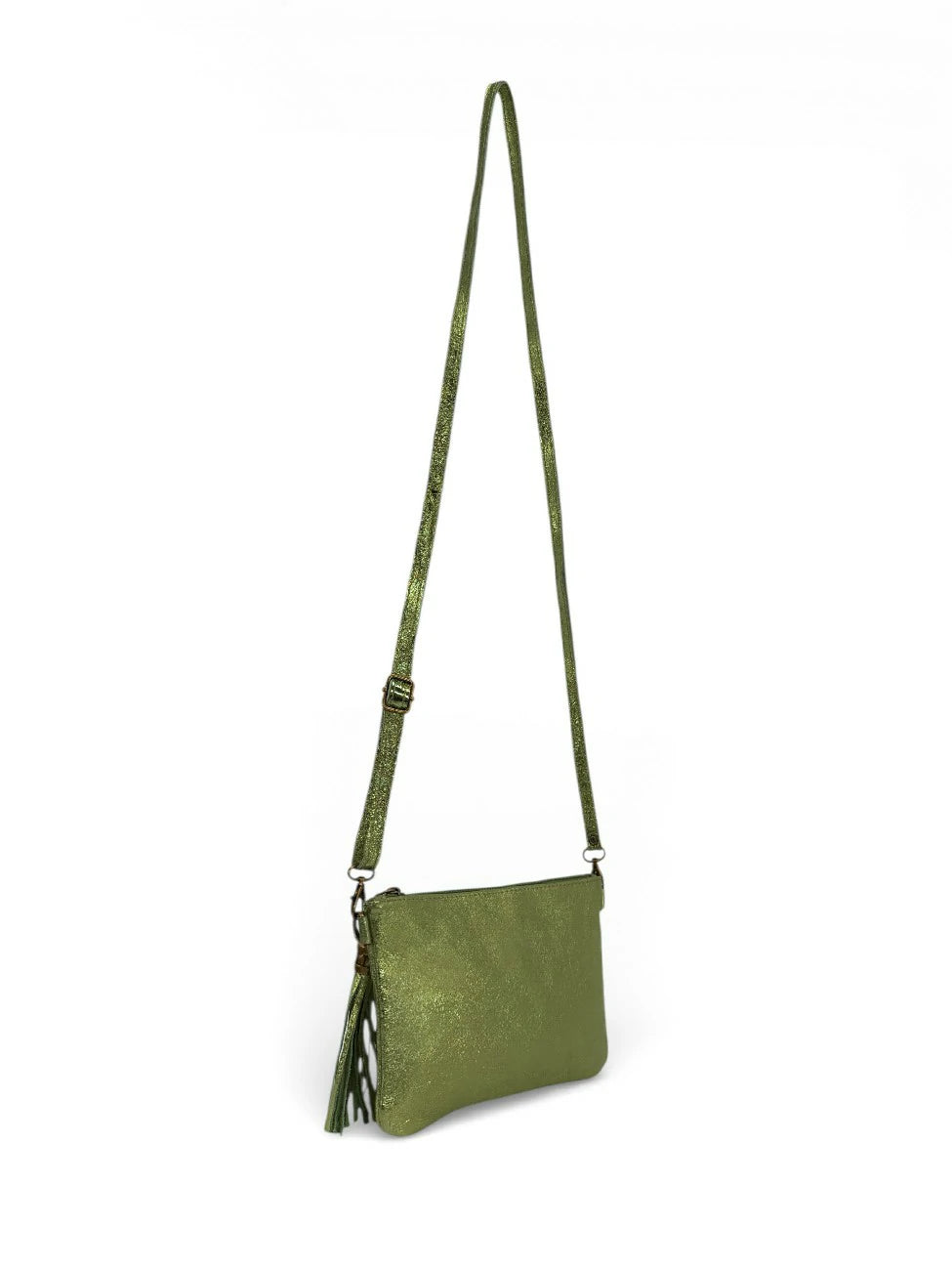 Sac à main pochette en cuir irisé kaki, porté main ou bandoulière, fabriqué en Italie.