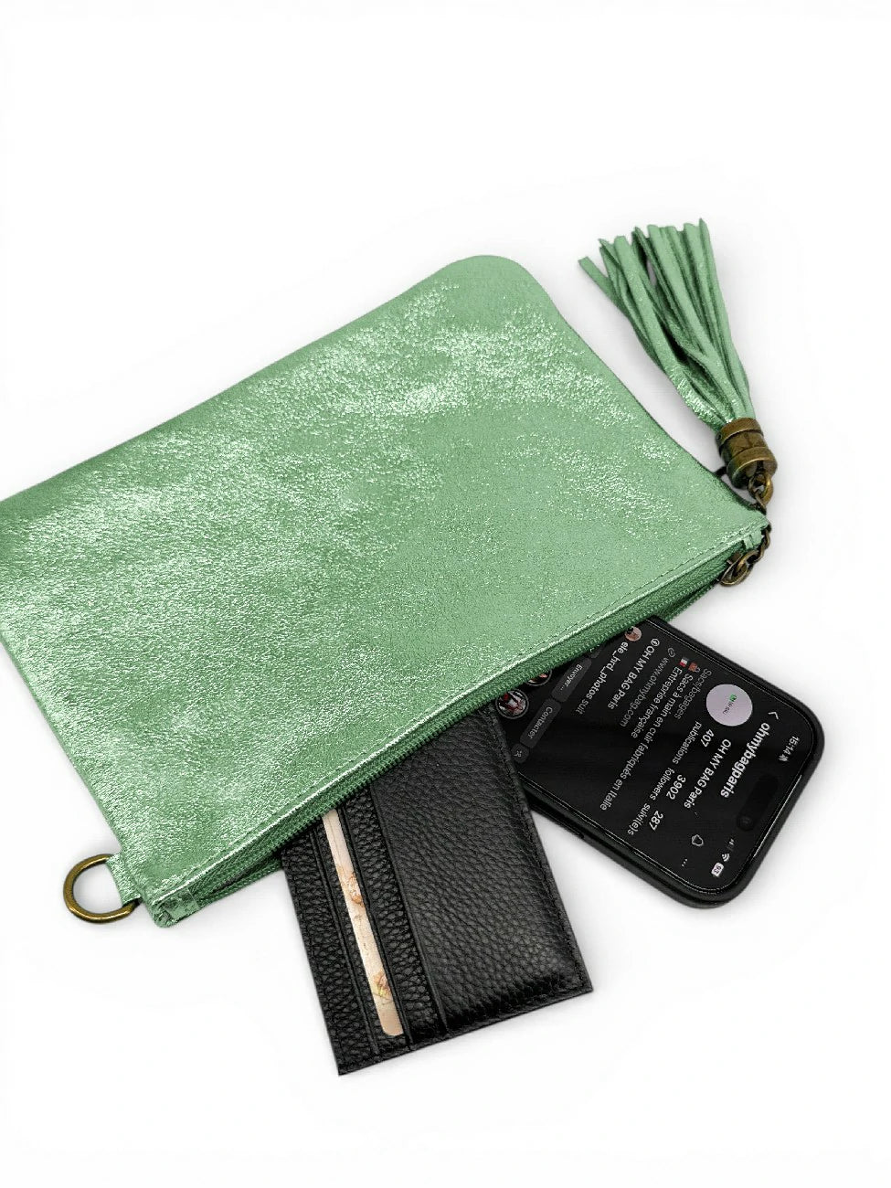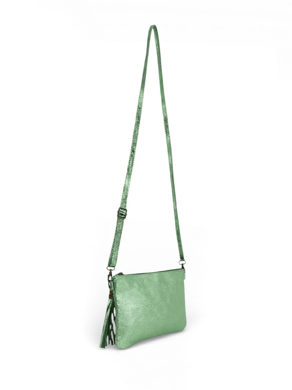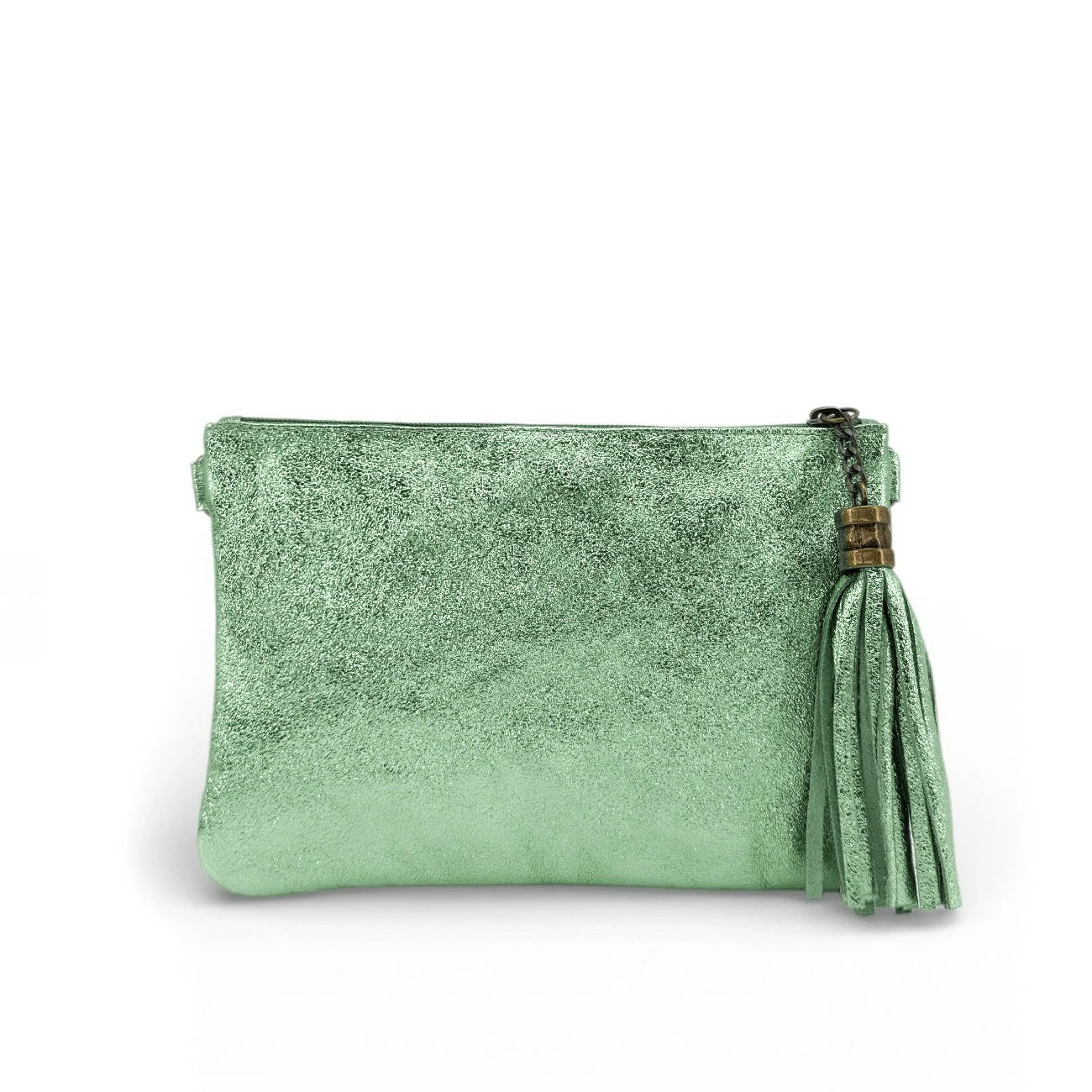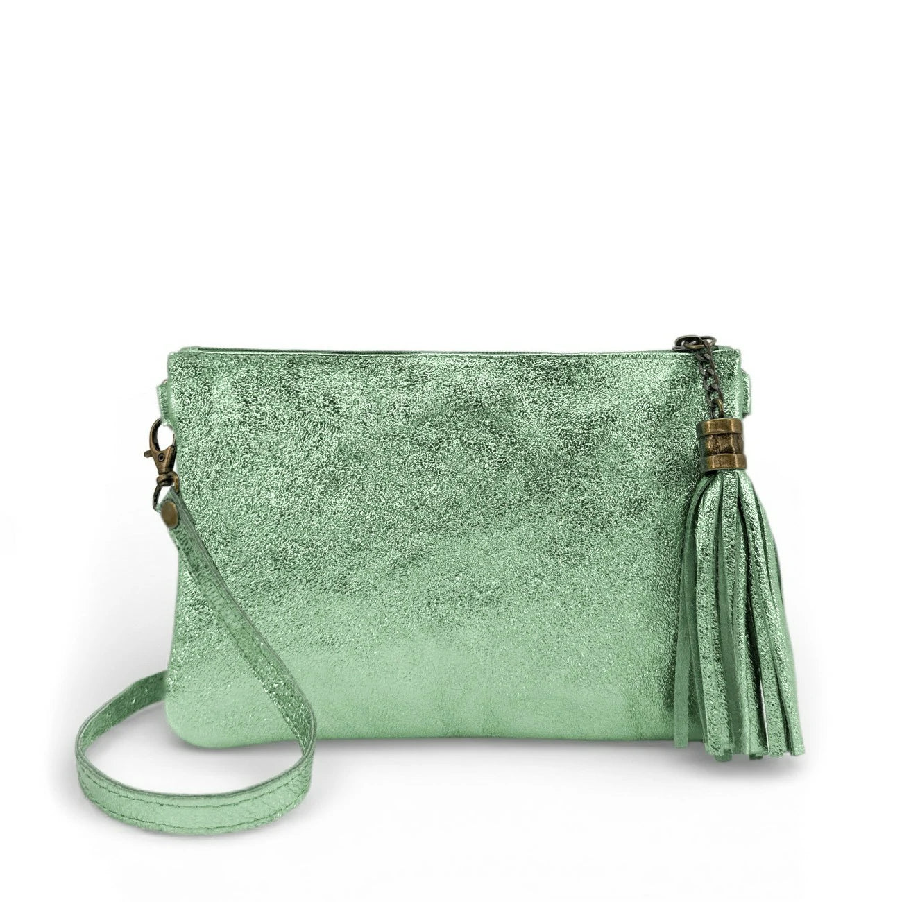 Sac à main pochette en cuir irisé menthe givrée, porté main ou bandoulière, fabriqué en Italie.
