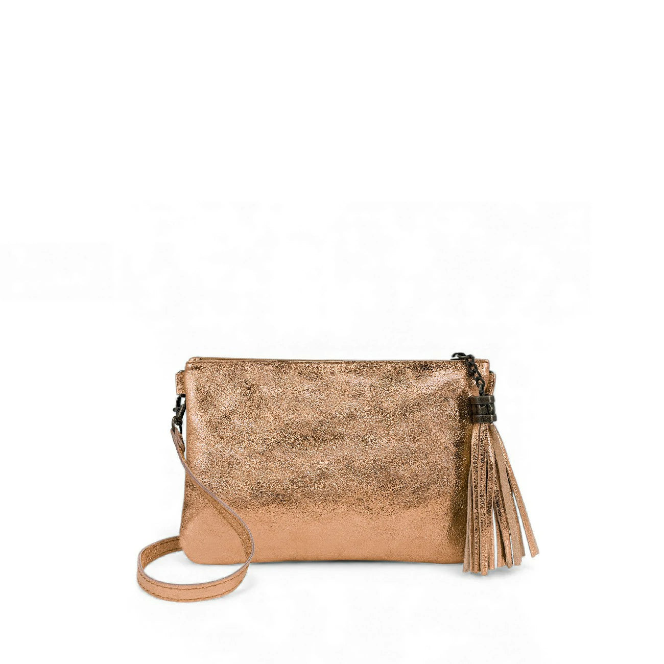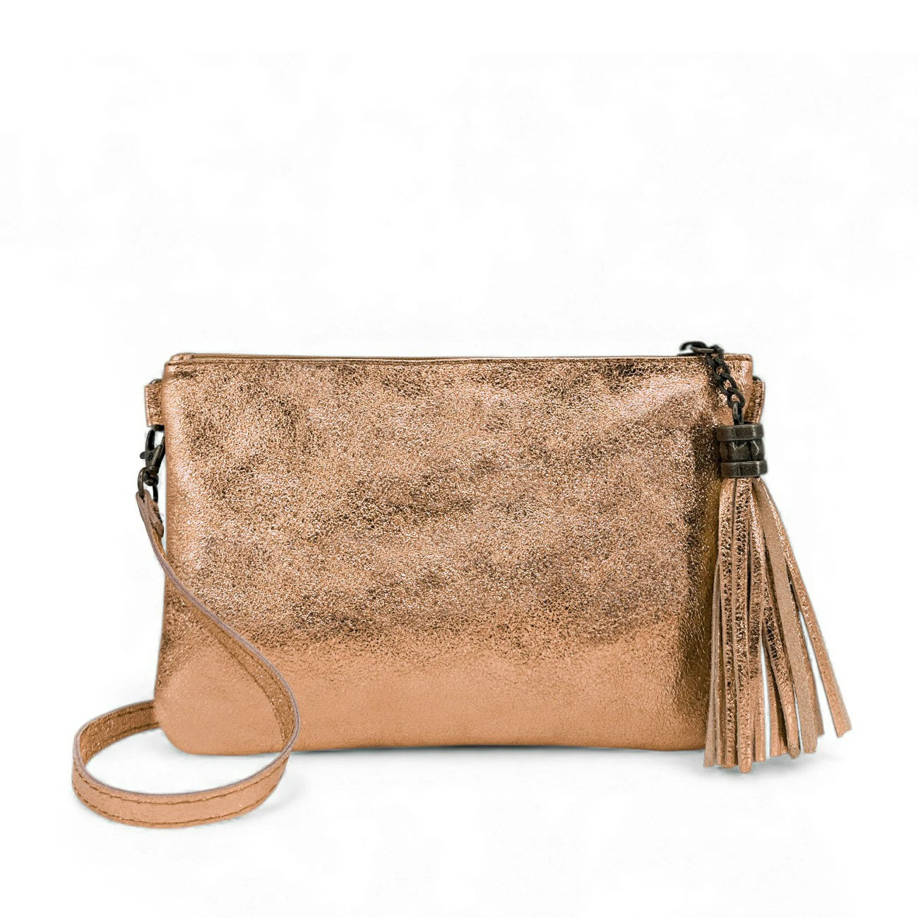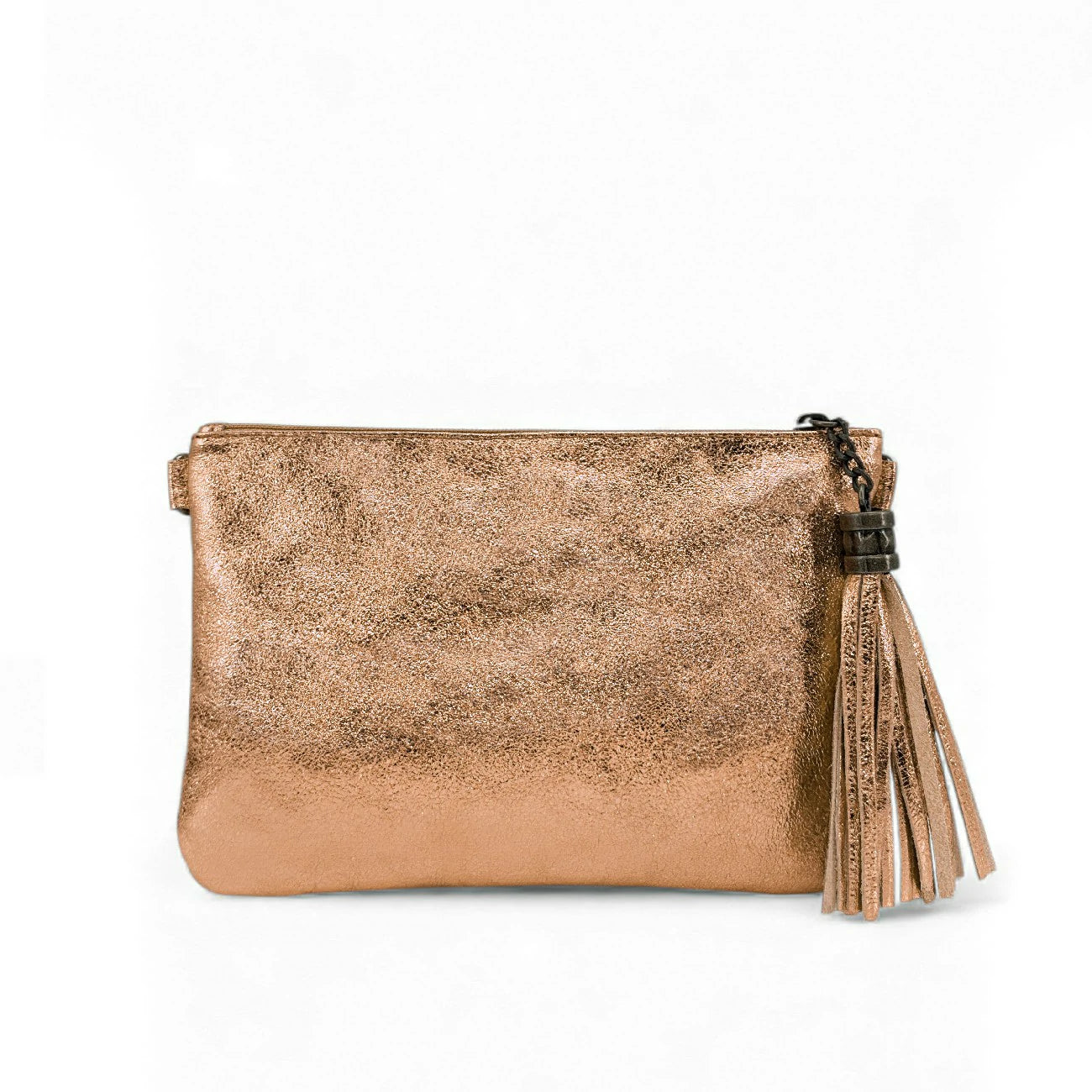 Sac à main pochette en cuir irisé or rose, porté main ou bandoulière, fabriqué en Italie.