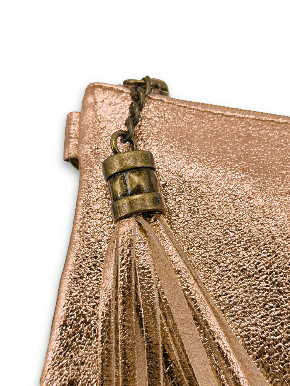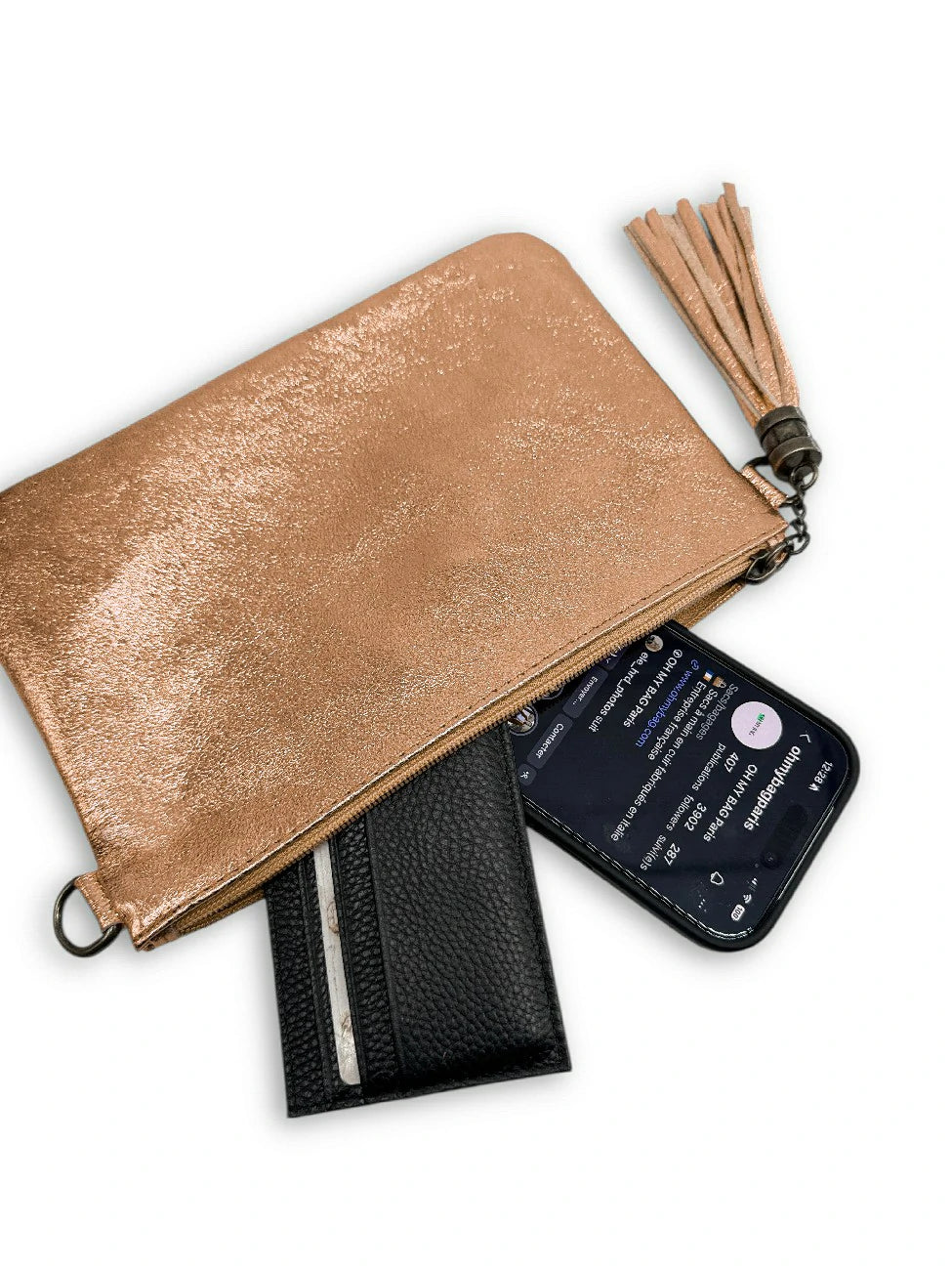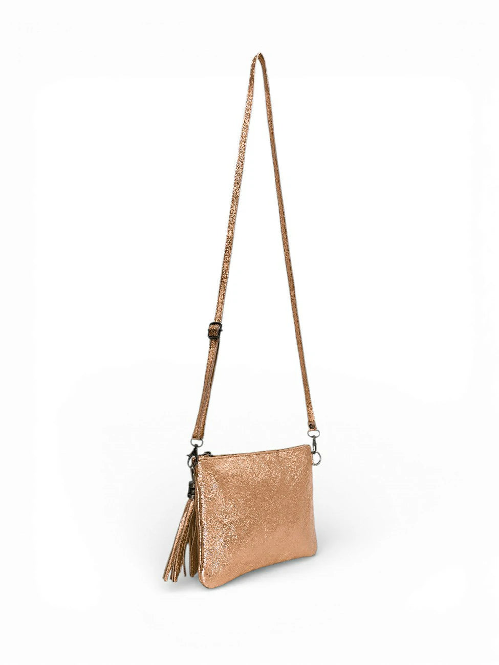 Sac à main pochette en cuir irisé or rose, porté main ou bandoulière, fabriqué en Italie.