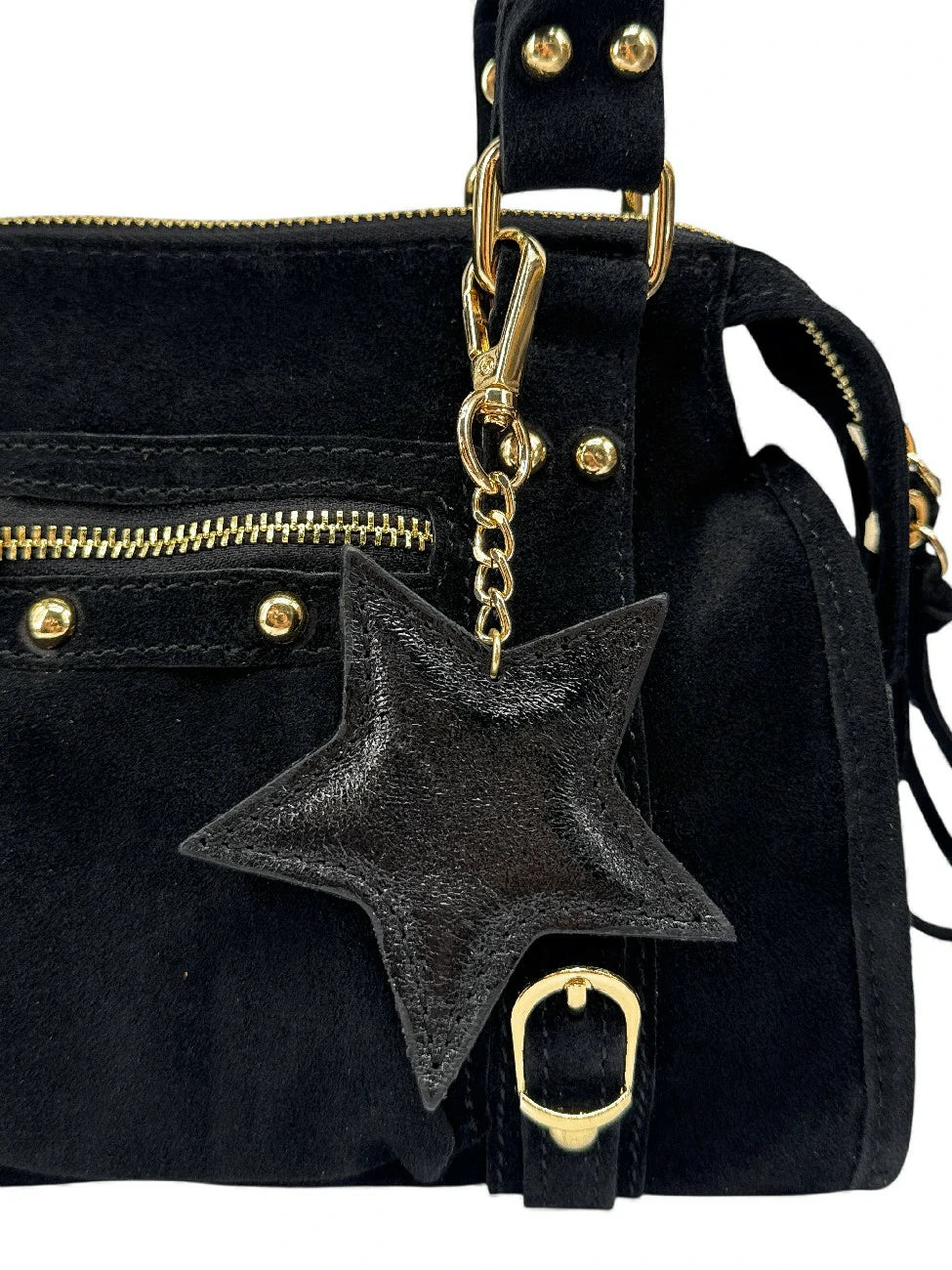 Porte-clés en cuir irisé noir avec chaîne et mousqueton doré, fabriqué en Italie.