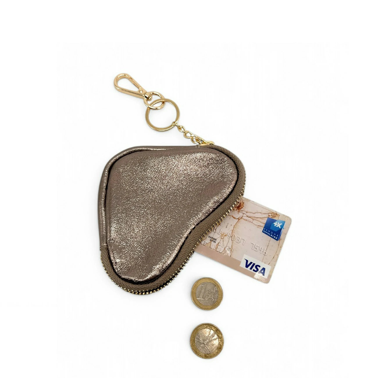 Porte-clés, porte-monnaie, porte-carte en cuir irisé champagne, fabriqué en Italie.