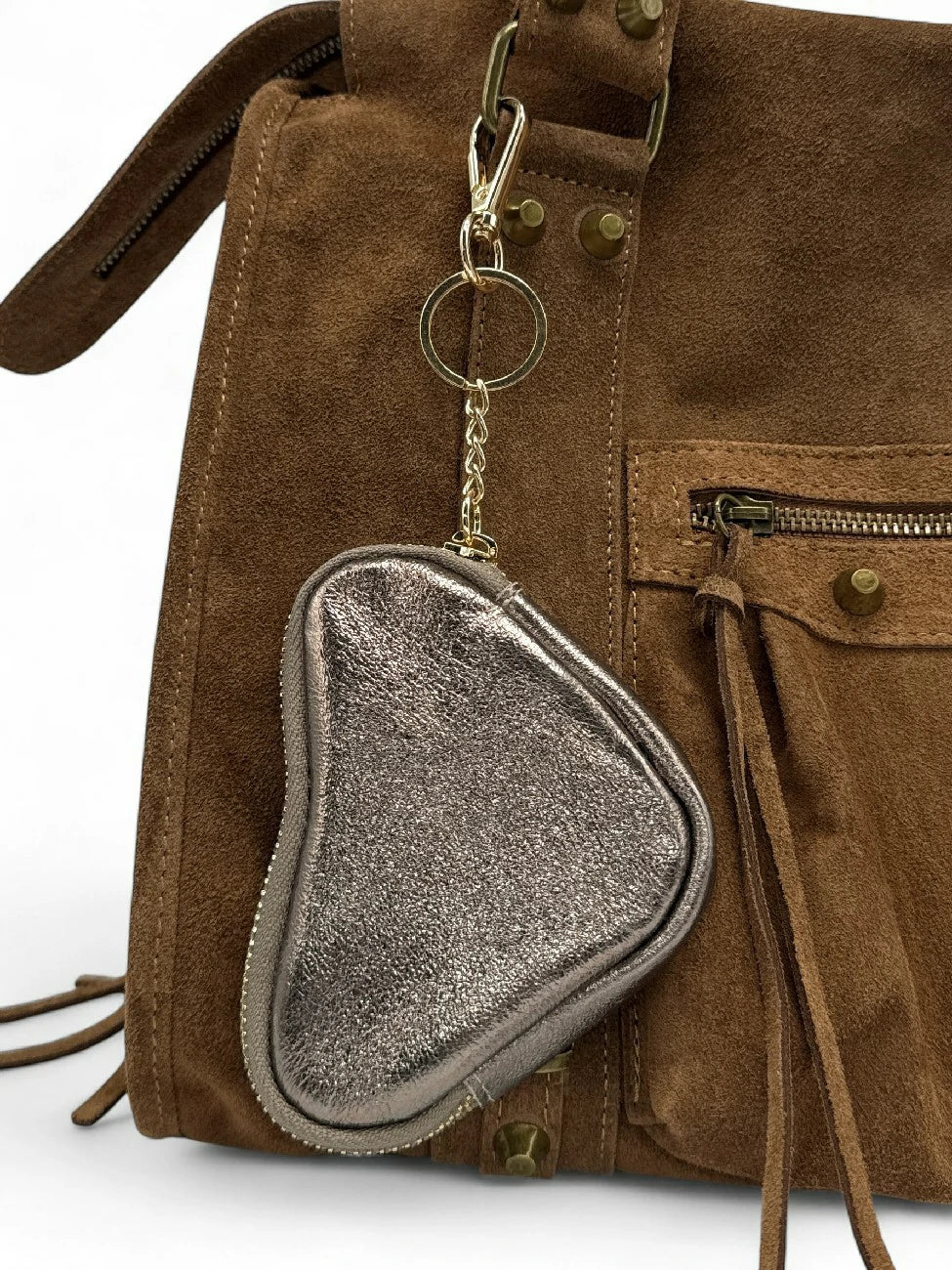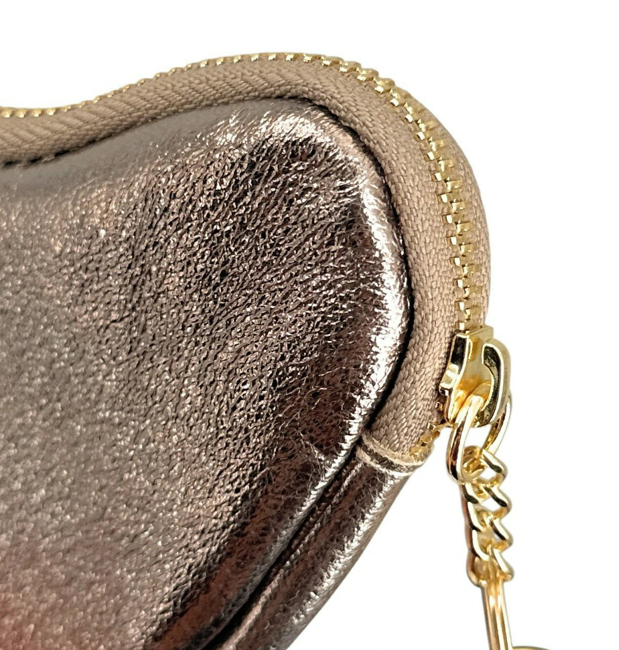 Porte-monnaie porte-clés cœur en cuir semi-rigide, fermeture zip avec chaînette dorée et mousqueton. Il glisse partout avec aisance et apporte une petite touche trendy au sac du jour. Cet accessoire sac devient un indispensable : on y range sa monnaie, une carte ou son stick à lèvres. Un détail chic, pensé pour suivre chaque mouvement.