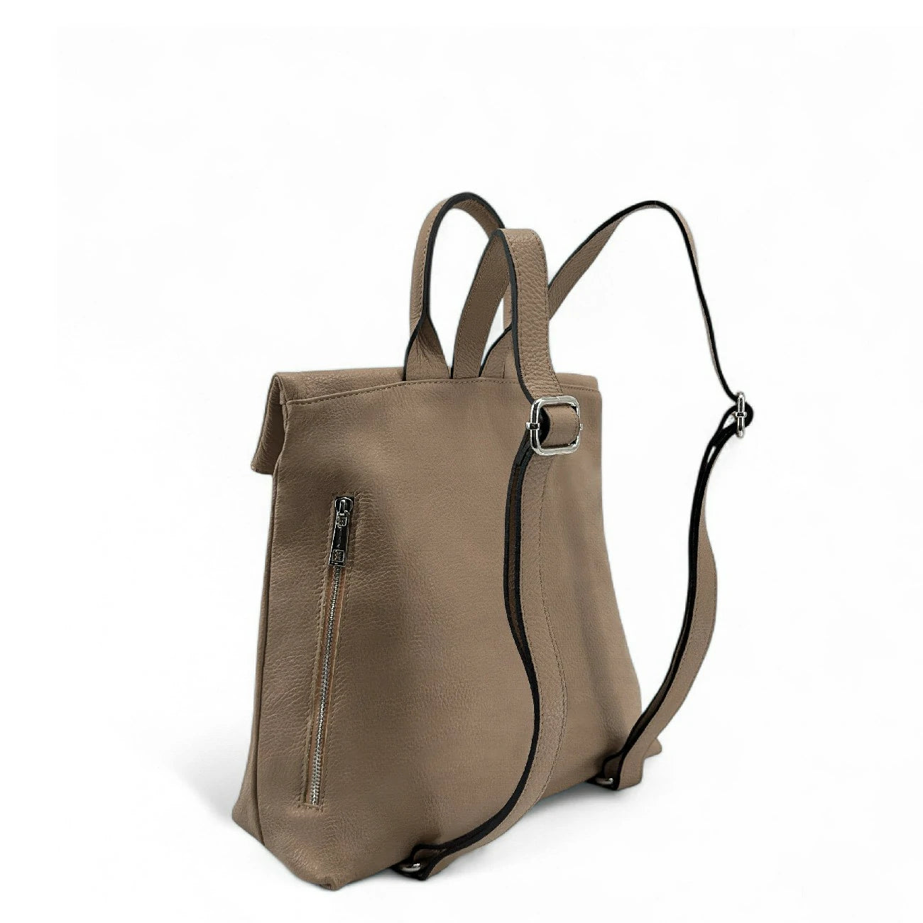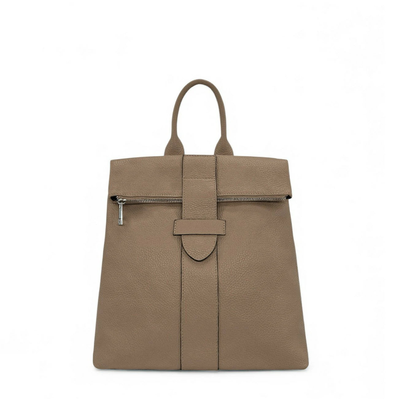 Sac à dos antivol en cuir grainé taupe foncé, fabriqué en Italie.