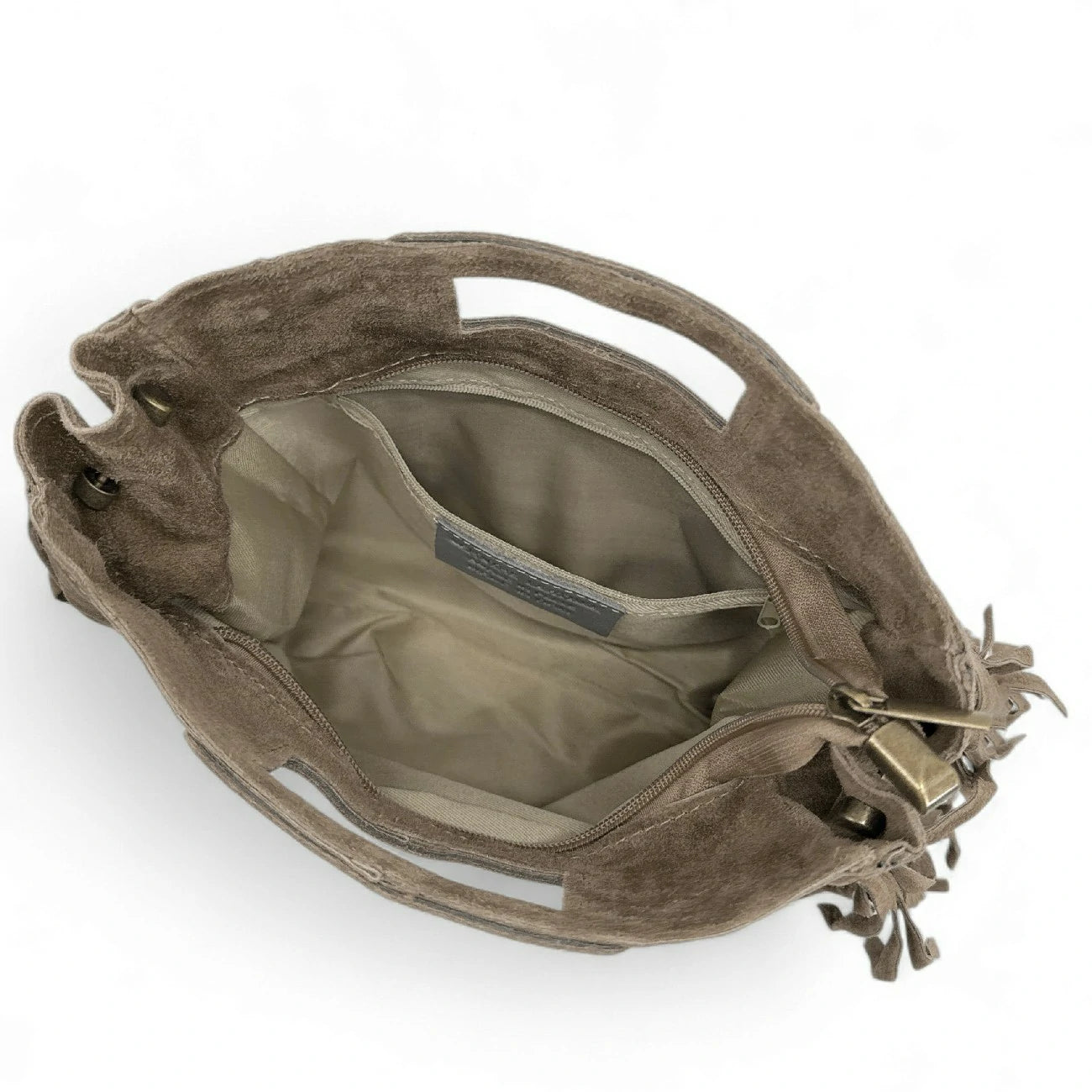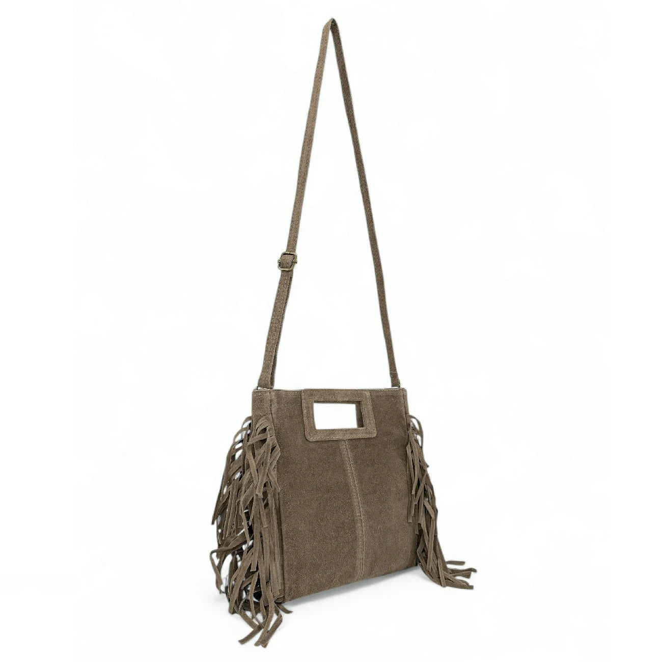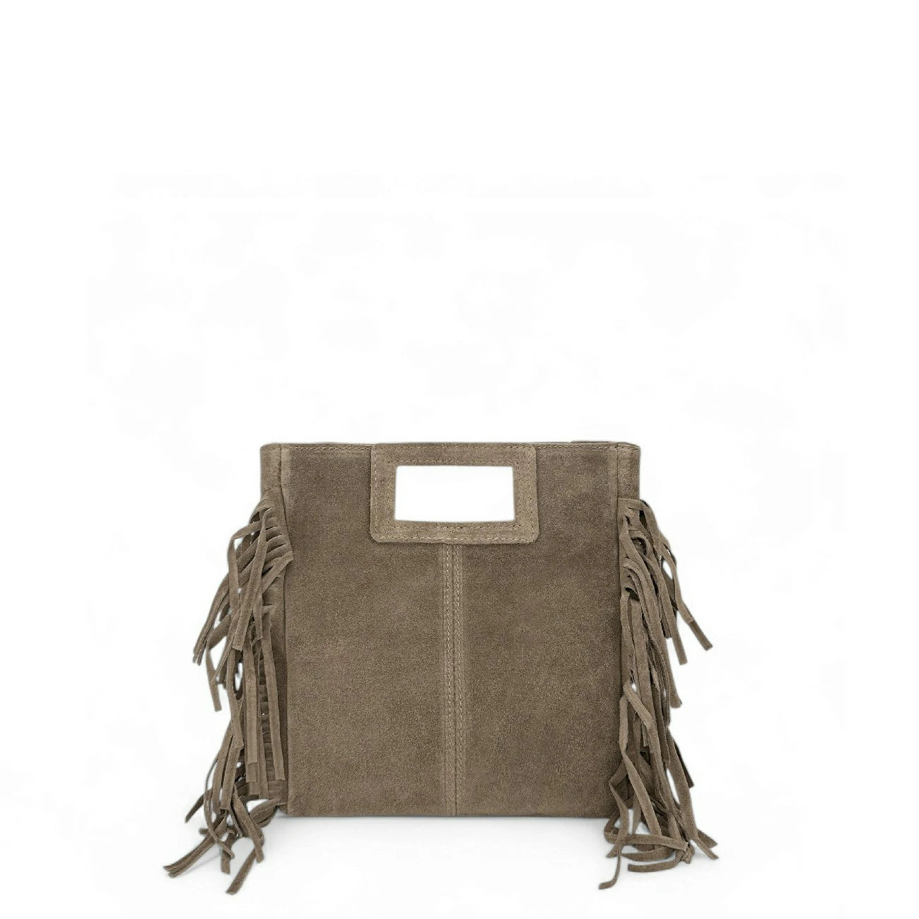 Sac à main à franges en cuir nubuck gris taupe porté main ou bandoulière, fabriqué en Italie.