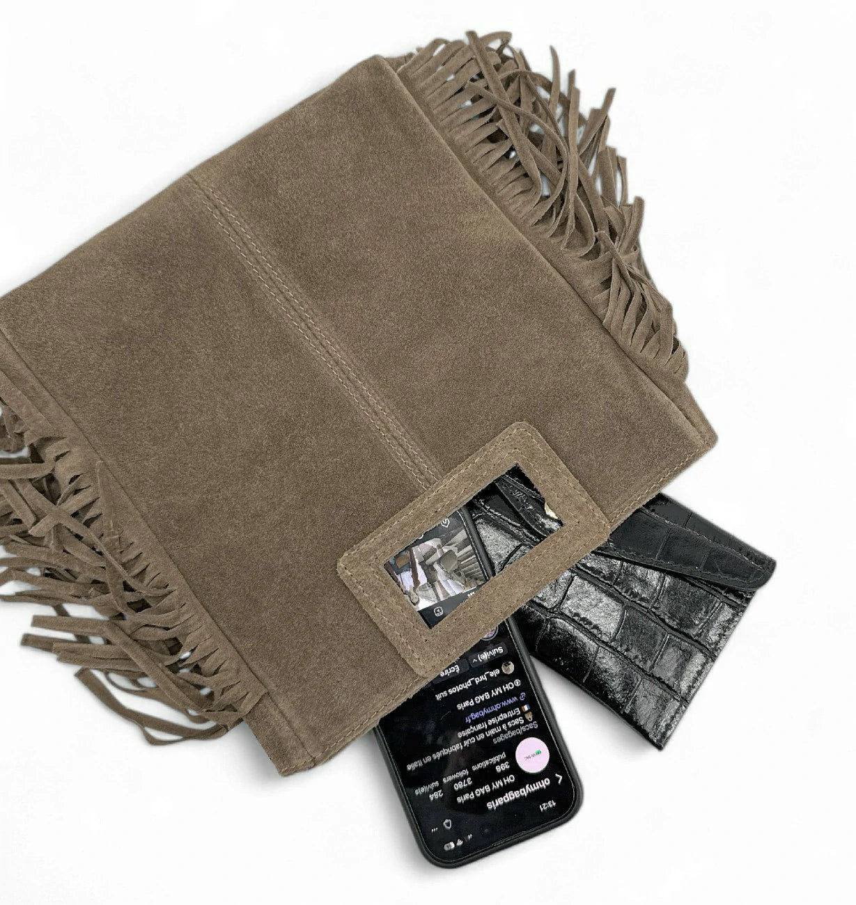 Sac à main forme besace en daim texturé, silhouette carrée et franges fluides pour un effet folk chic. Anses rectangulaires intégrées, bandoulière amovible, fermeture zippée sécurisée. Ce format polyvalent accueille aisément portefeuille, étui à lunettes, petit carnet, essentiels beauté, mini tablette. Un design day-to-night, stylé et pratique.