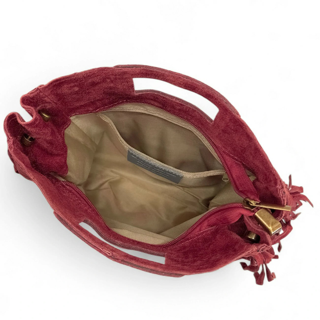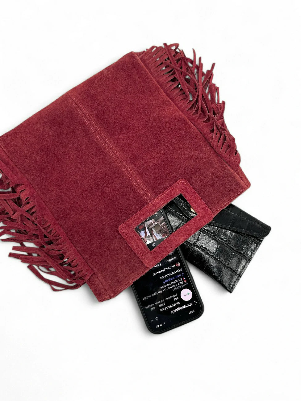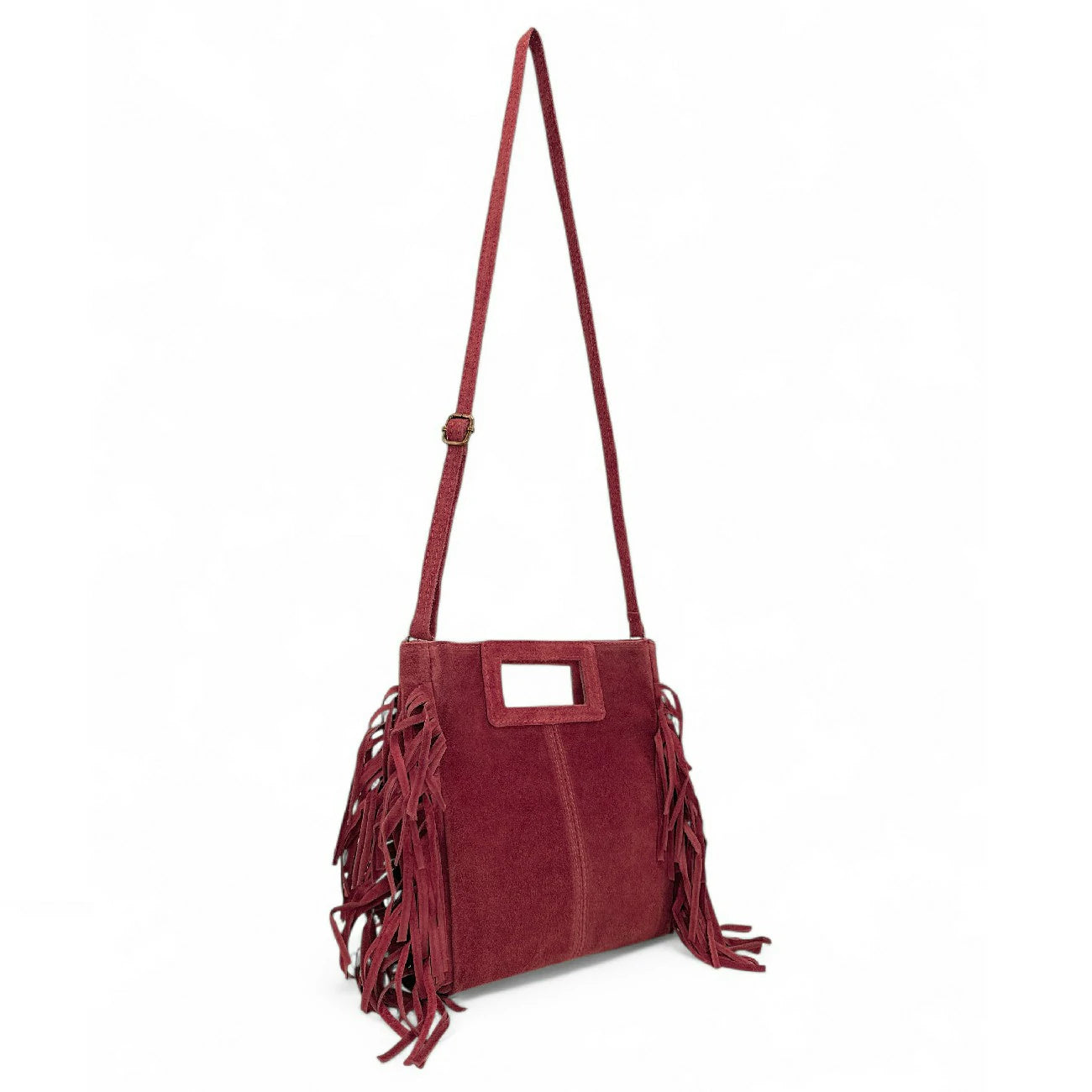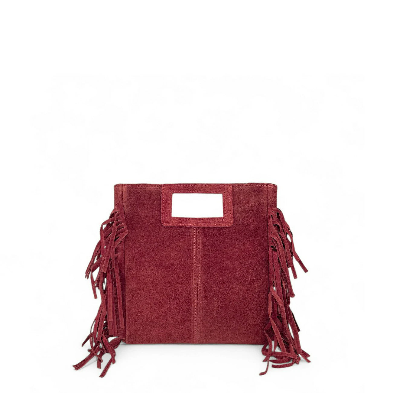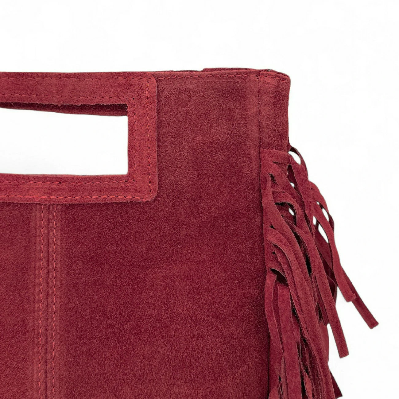Sac à main à franges en cuir nubuck rouge foncé porté main ou bandoulière, fabriqué en Italie.