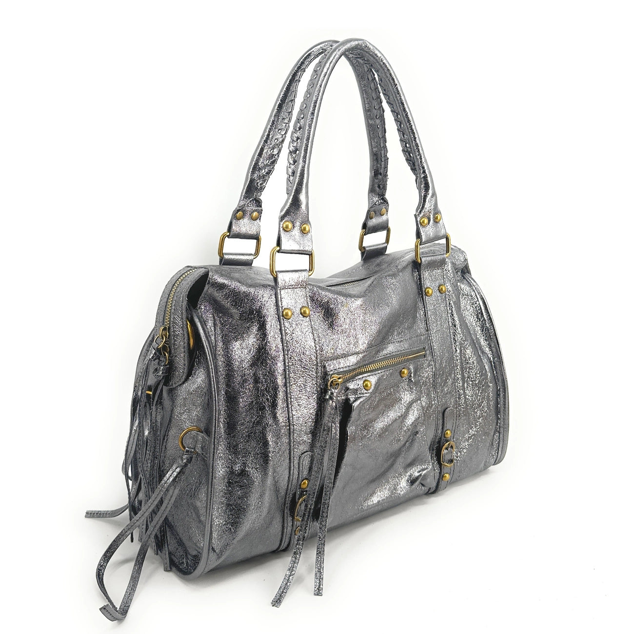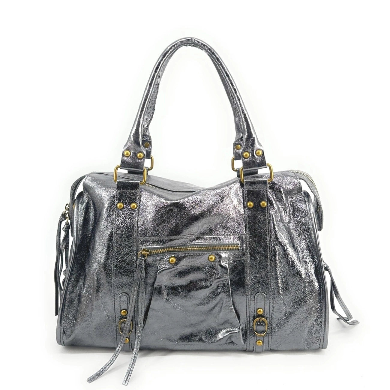 Sac à main en cuir métallisé argent foncé, porté main, épaule ou bandoulière, fabriqué en Italie.