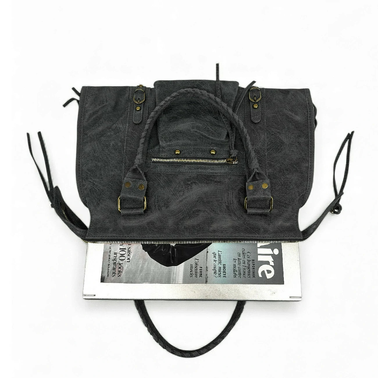 Sac à main en cuir brossé gris foncé à bandoulière avec lacets décoratifs, porté main, épaule ou bandoulière, fabriqué en Italie.
